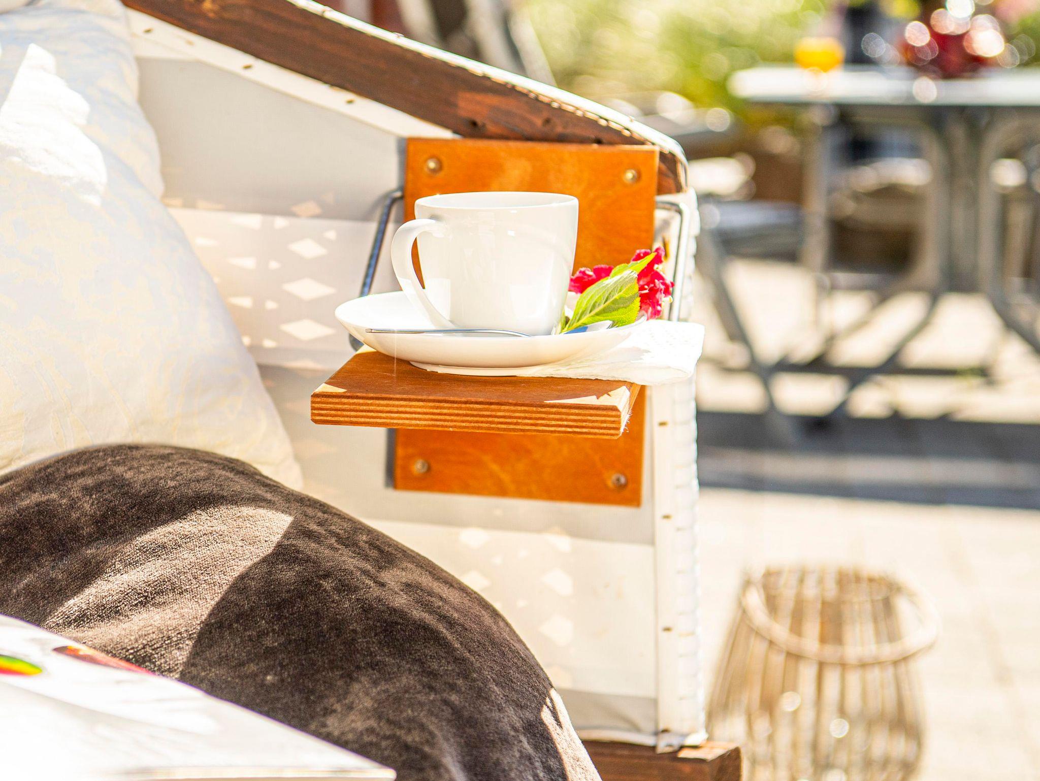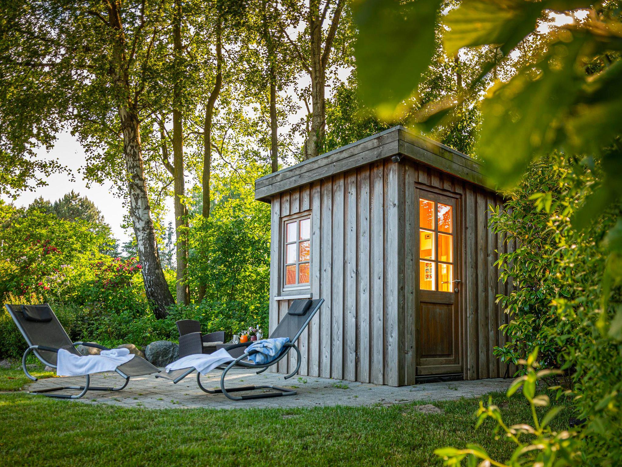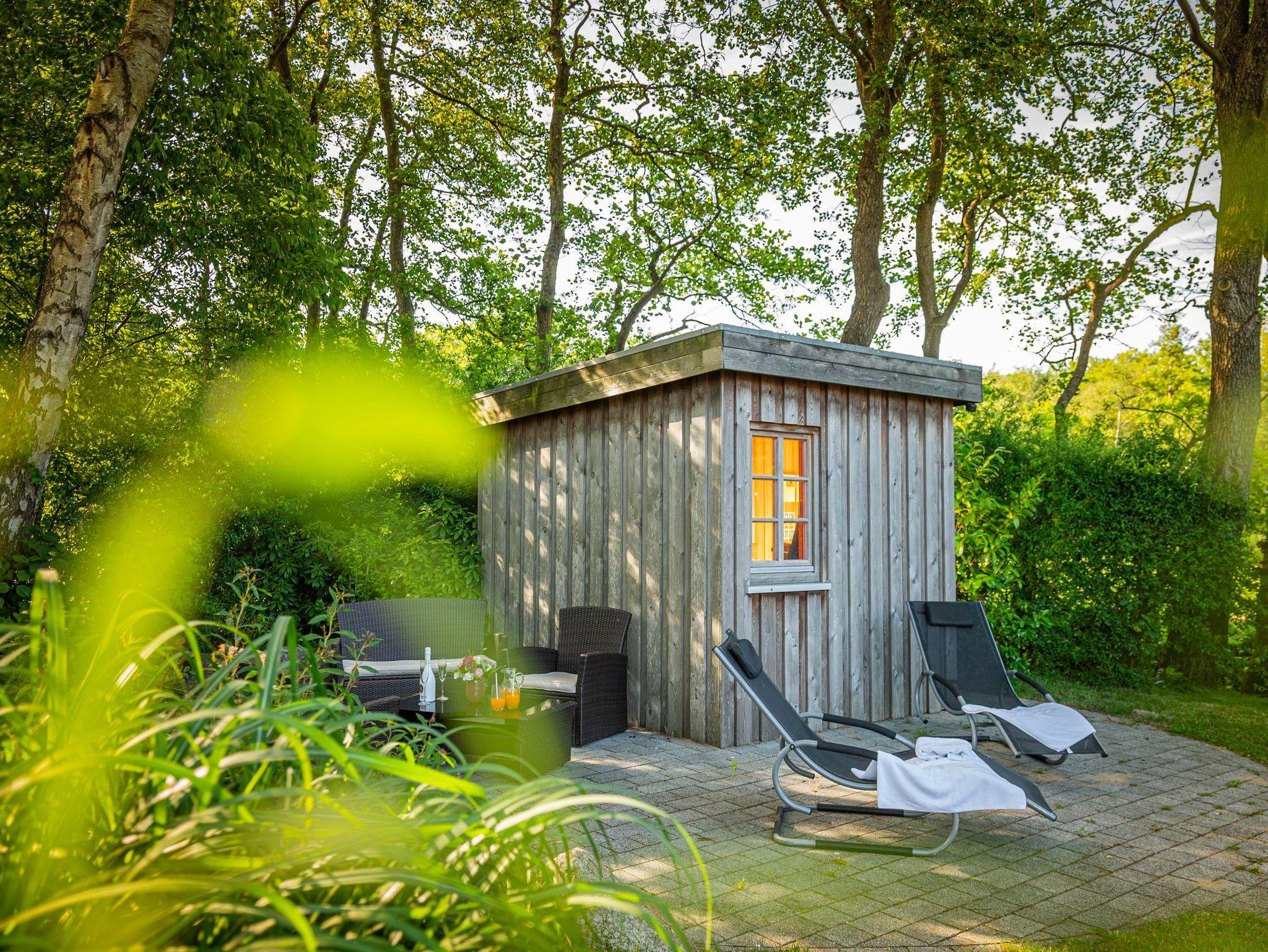 Die umläufige Terrasse (Süd- bzw. Westausrichtung) ist mit Terrassenmöbeln und einem Strandkorb ausgestattet ist. Im Garten erwartet Sie das besondere Highlight. Hier finden Sie geschützt, einen abgetrennten Bereich mit Blockhaus-Sauna, Außendusche und Terrasse mit Liegestühlen. Es gibt eine Unterstellmöglichkeit für Fahrräder.