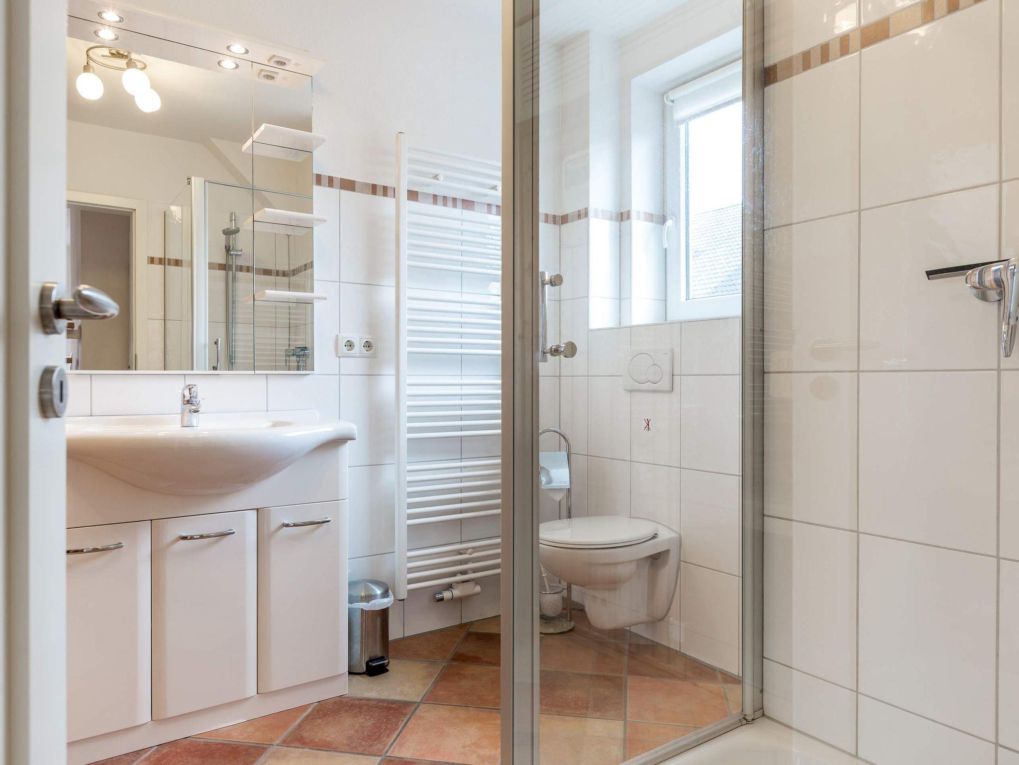 • Modernes Badezimmer (Duschbad) mit Dusche, WC, Sauna (für 2-4 Personen), Fön, Handtuchwärmer und Tageslicht.