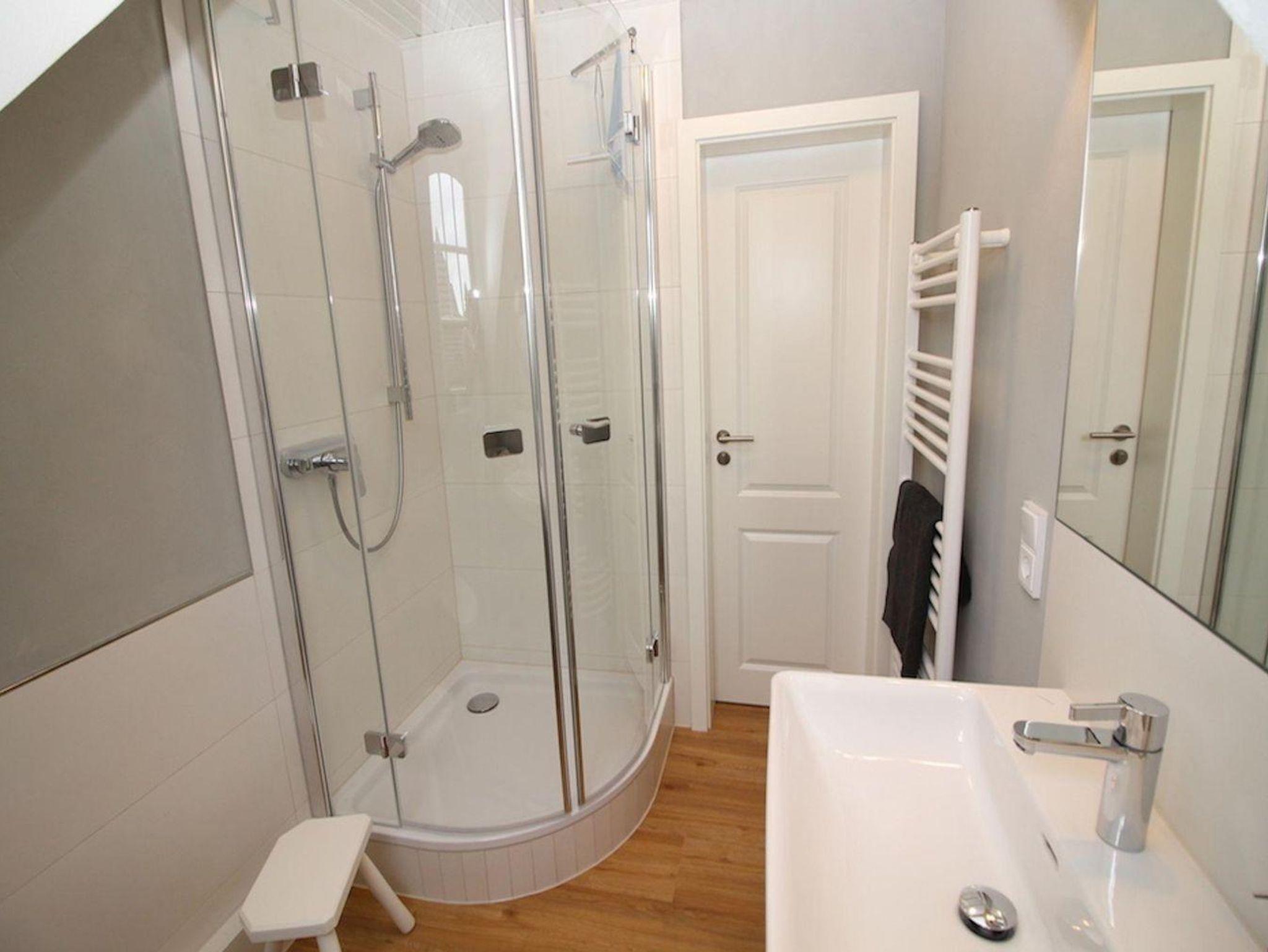 Vom Flur aus gelangen Sie in das helle Duschbad.