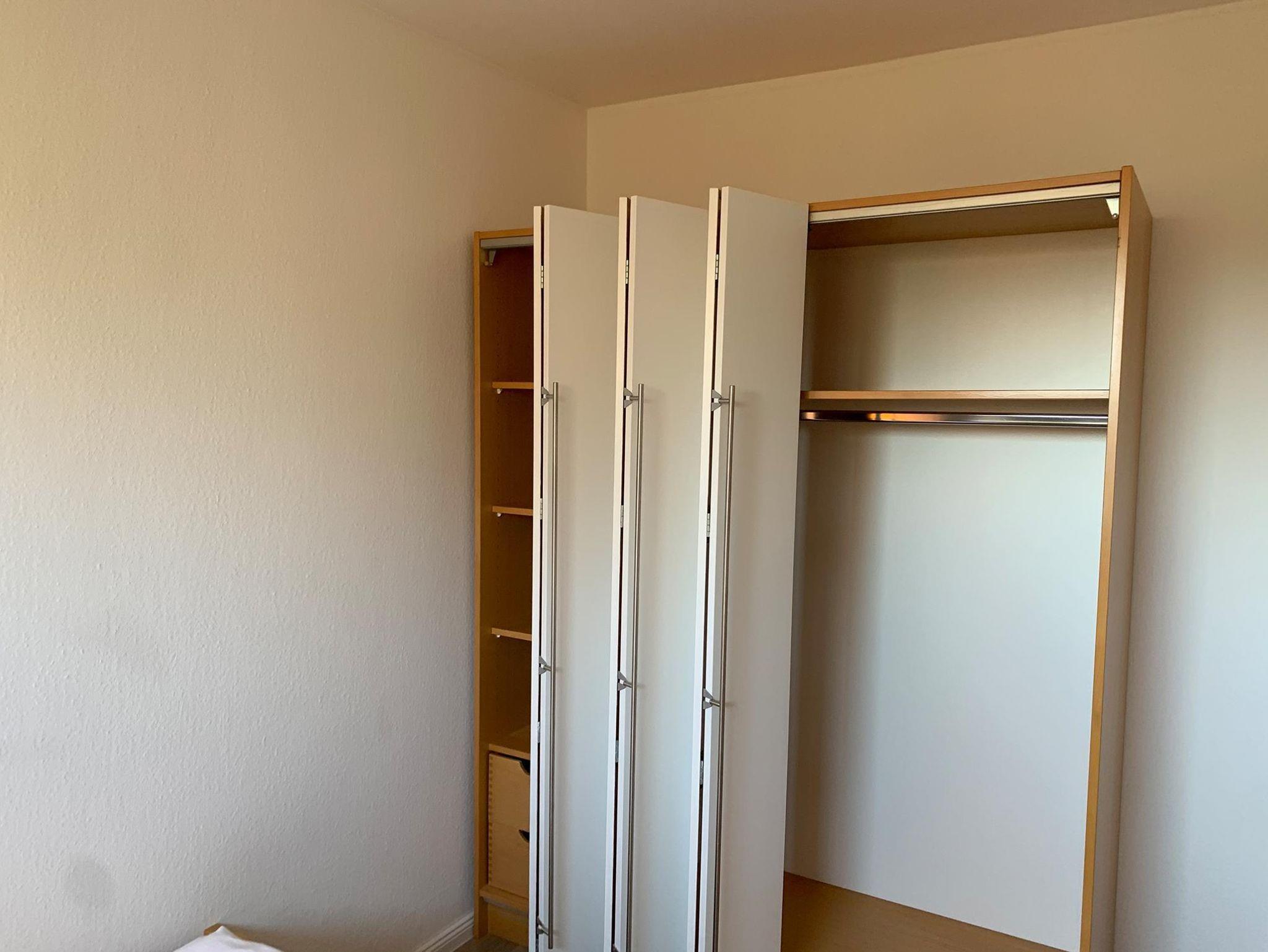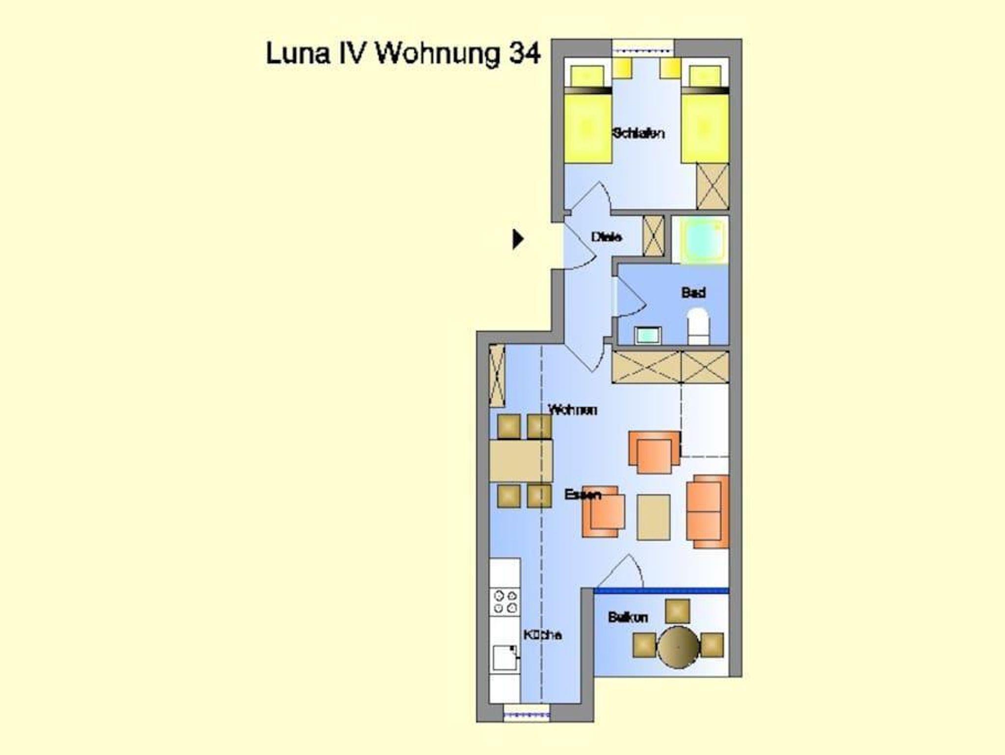 Sie teilt sich wie folgt auf: Eingangsdiele mit Garderobe, Schlafzimmer mit Einzelbetten (90x200cm), Duschbad mit WC. Der großzügige Wohnraum mit direktem Zugang zur Loggia überzeugt mit seiner gemütlichen Sitzecke, der modernen weißen Küche, der Essecke und als weitere Schlafmöglichkeit 1 Schrankbett.
