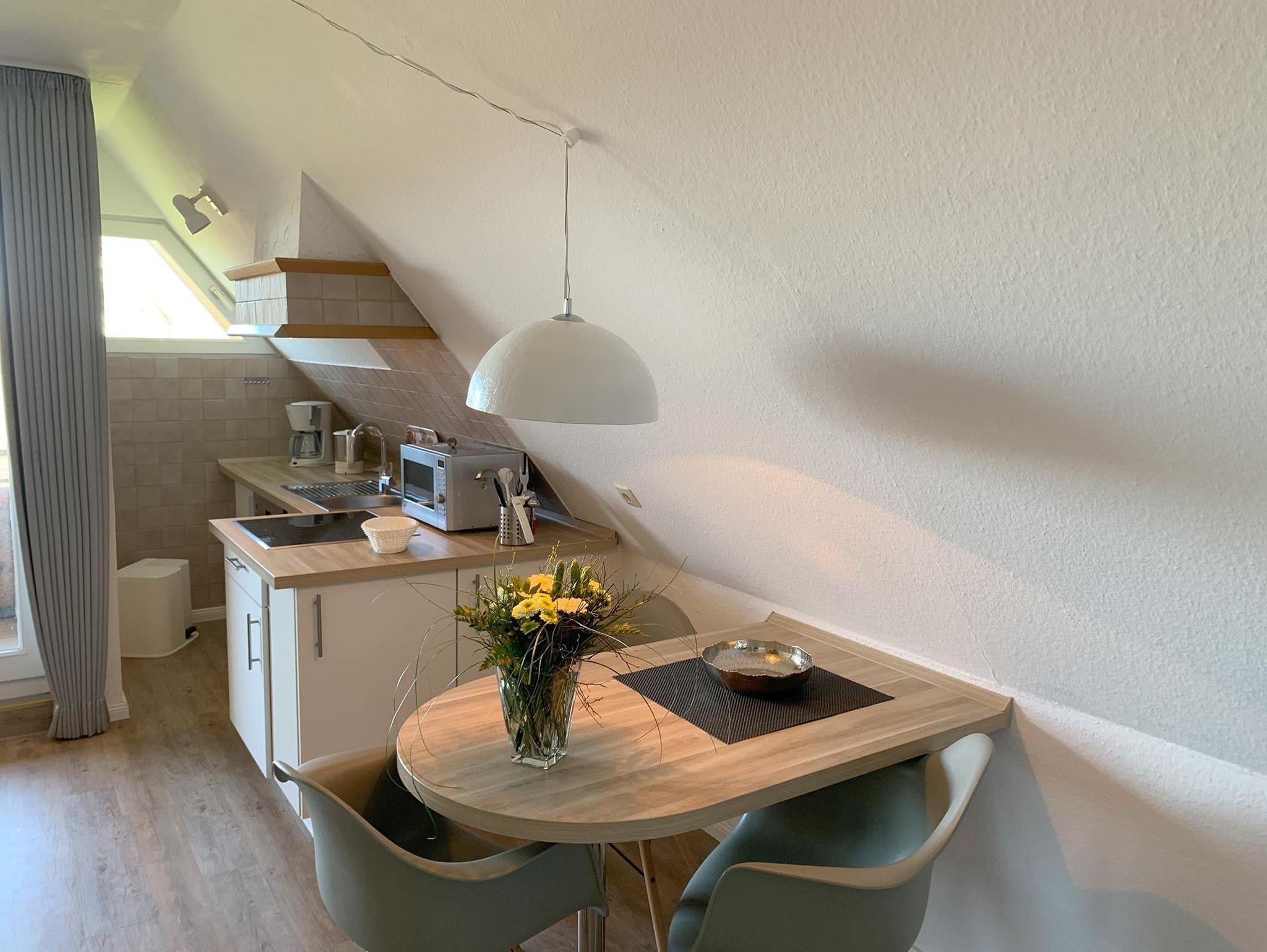 • komplett eingerichtete Küche mit Ceranfeld, Mikrowelle, Geschirrspüler, Kühlschrank mit Gefrierfach, Wasserkocher, Kaffeemaschine (Filter), Toaster.