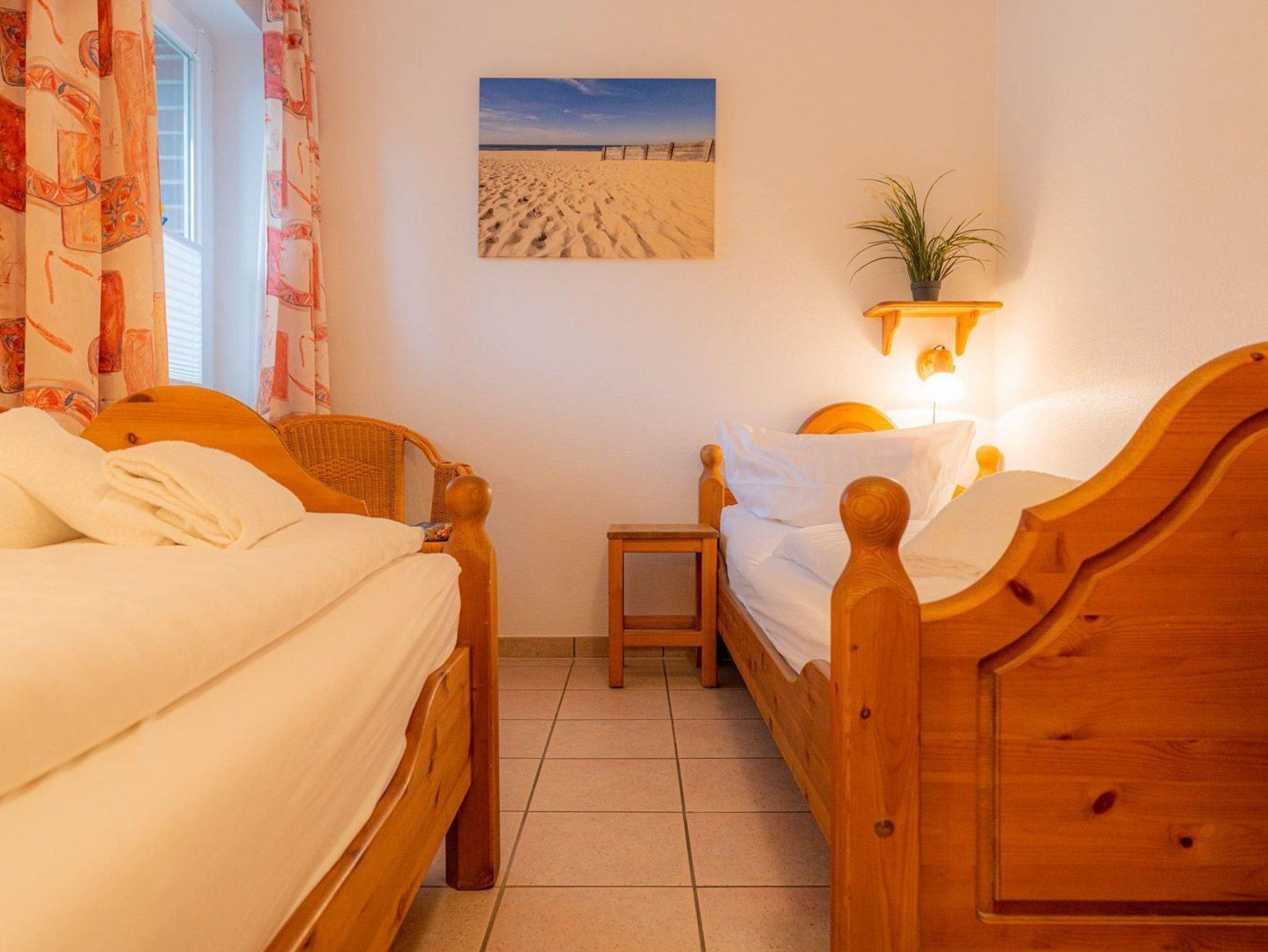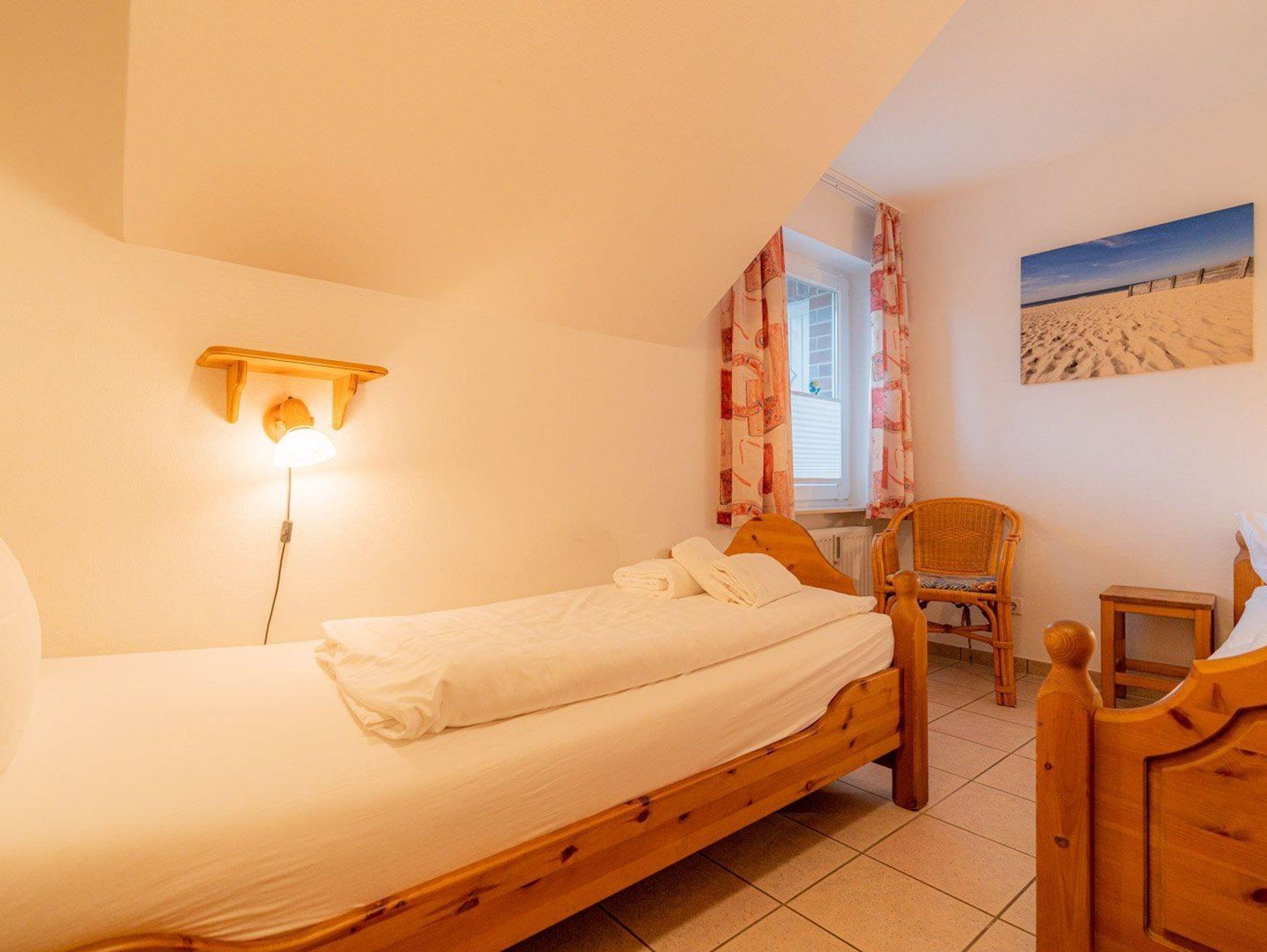 Schlafzimmer mit 2 Einzelbetten (je 90x200cm), Kleiderschrank, Stuhl und Regal mit Gesellschaftsspielen.
