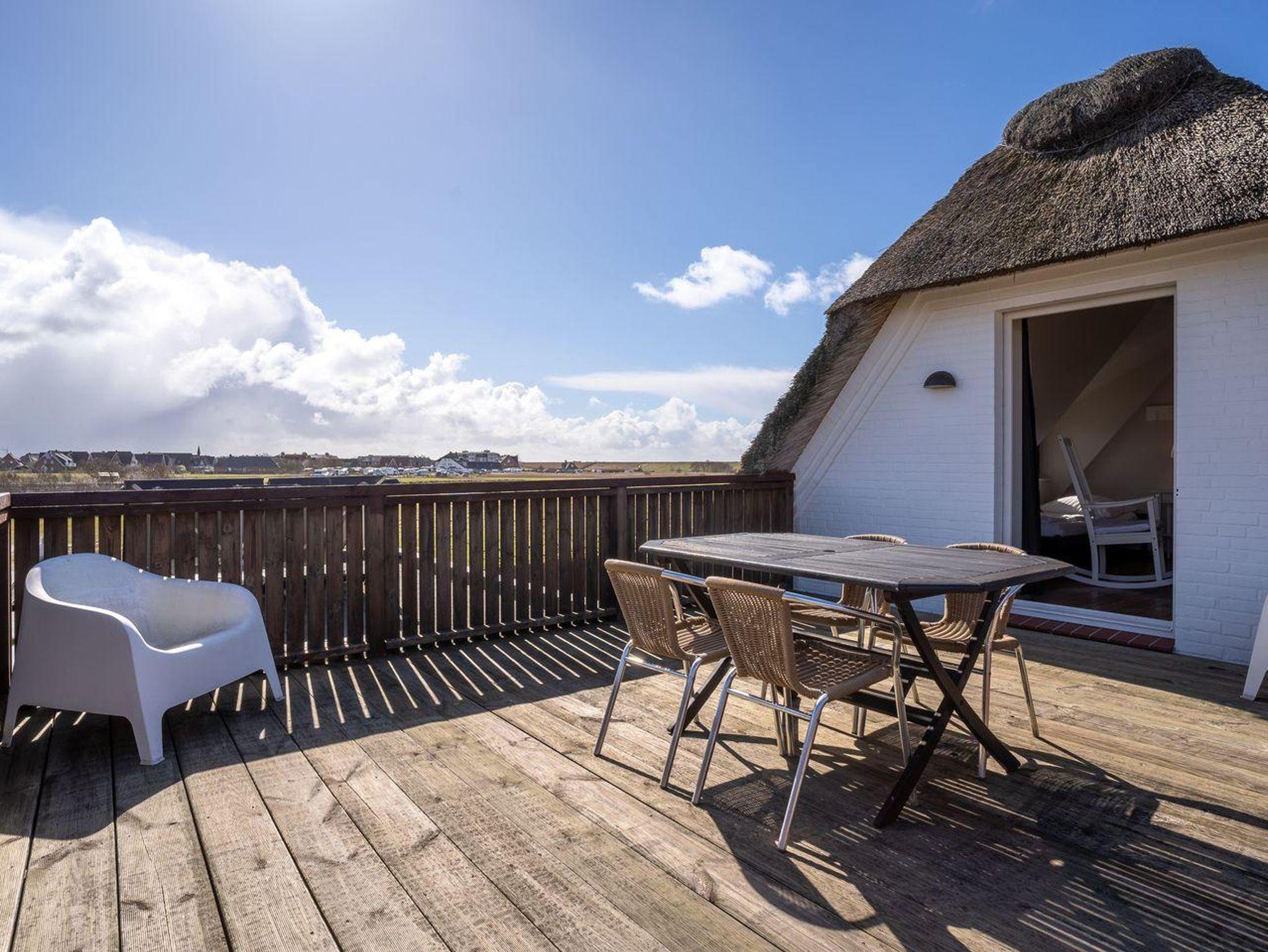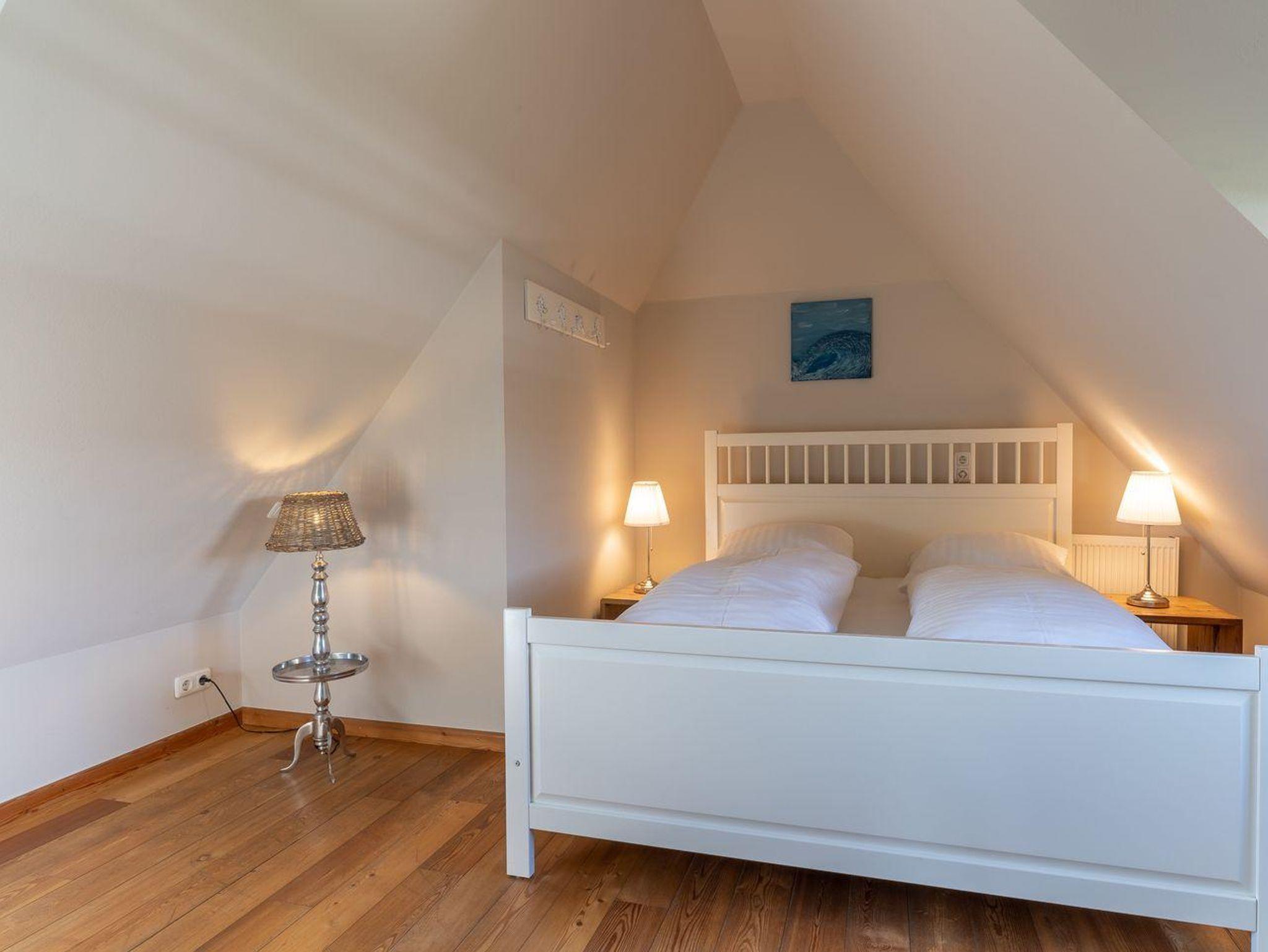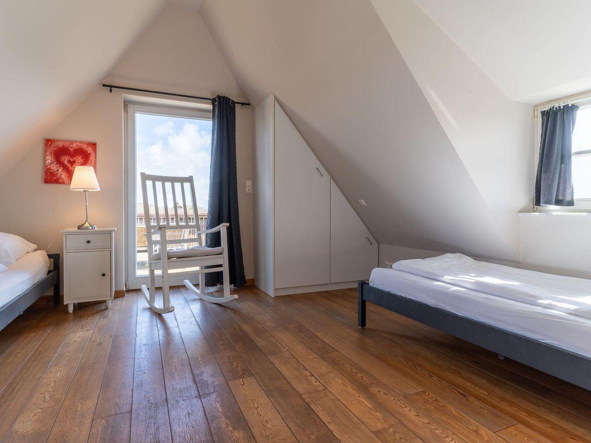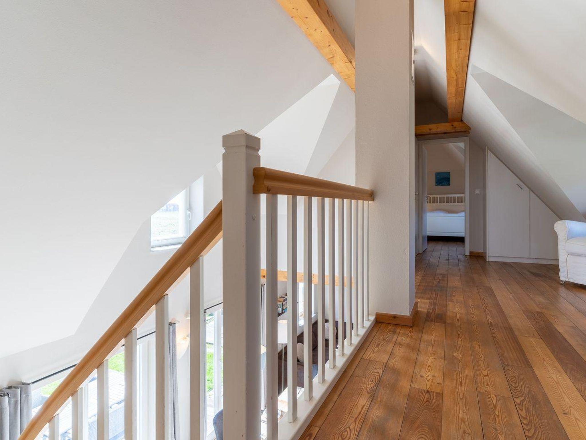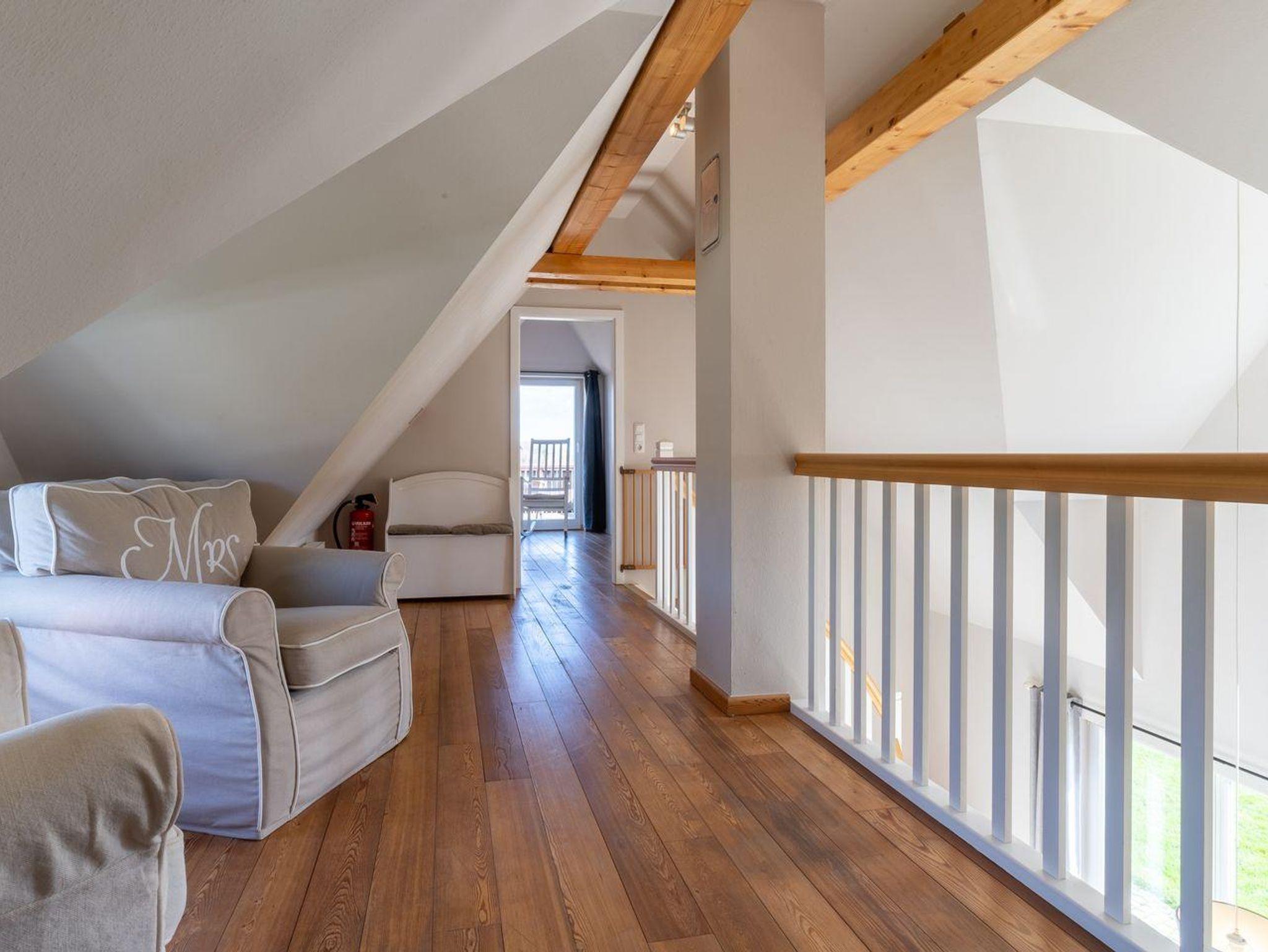 Eine große Dachterrasse schließt sich an eines der beiden Doppelschlafzimmer im 1. OG an. Von beiden Zimmern können Sie den Blick auf den Deich und den Sonnenuntergang genießen. In den Zimmern im ersten Stock und der Galerie wurden Holzdielen verlegt. Seinen Charme erhält der obere Teil auch durch seine gemütlichen Dachschrägen.