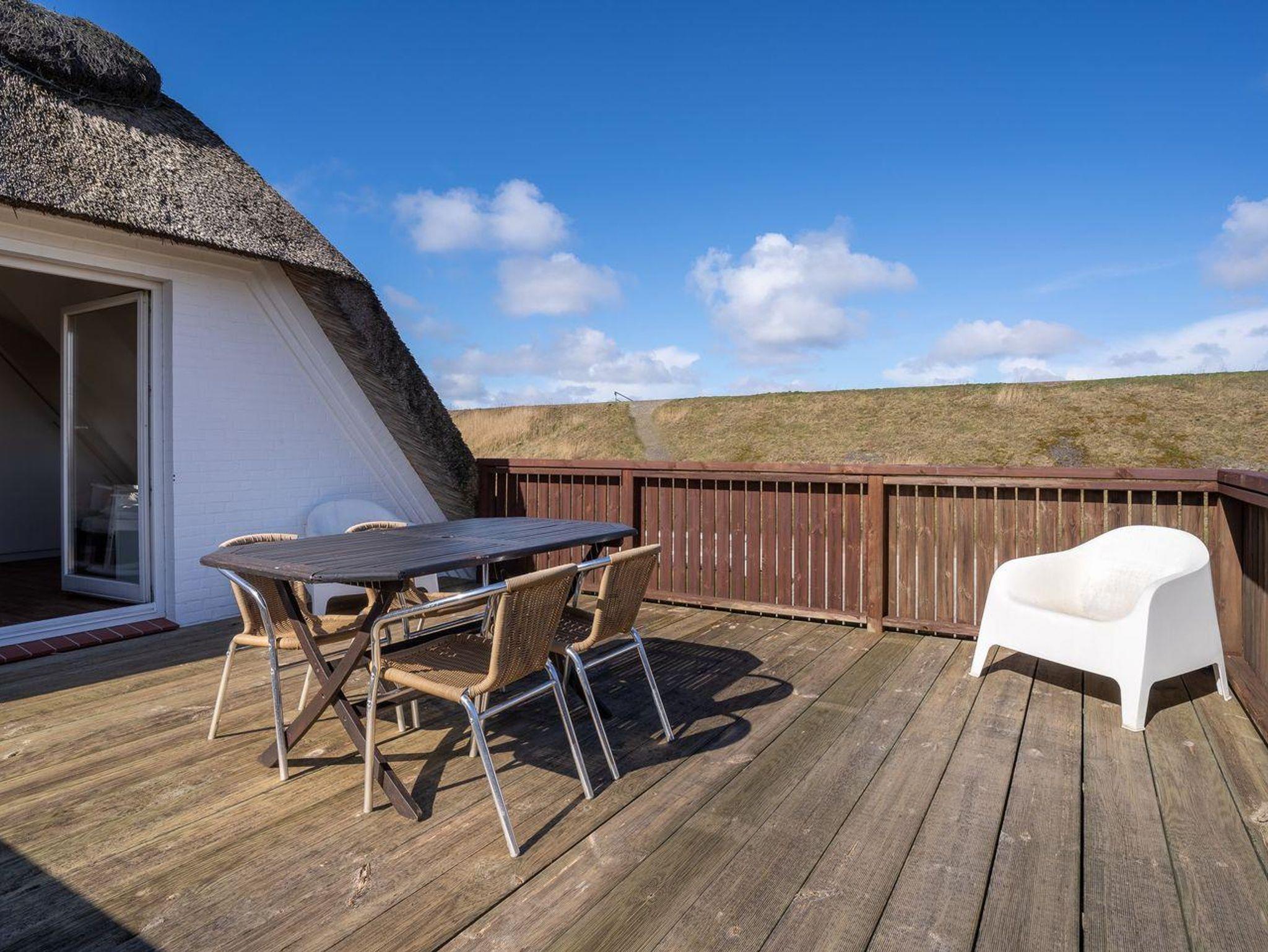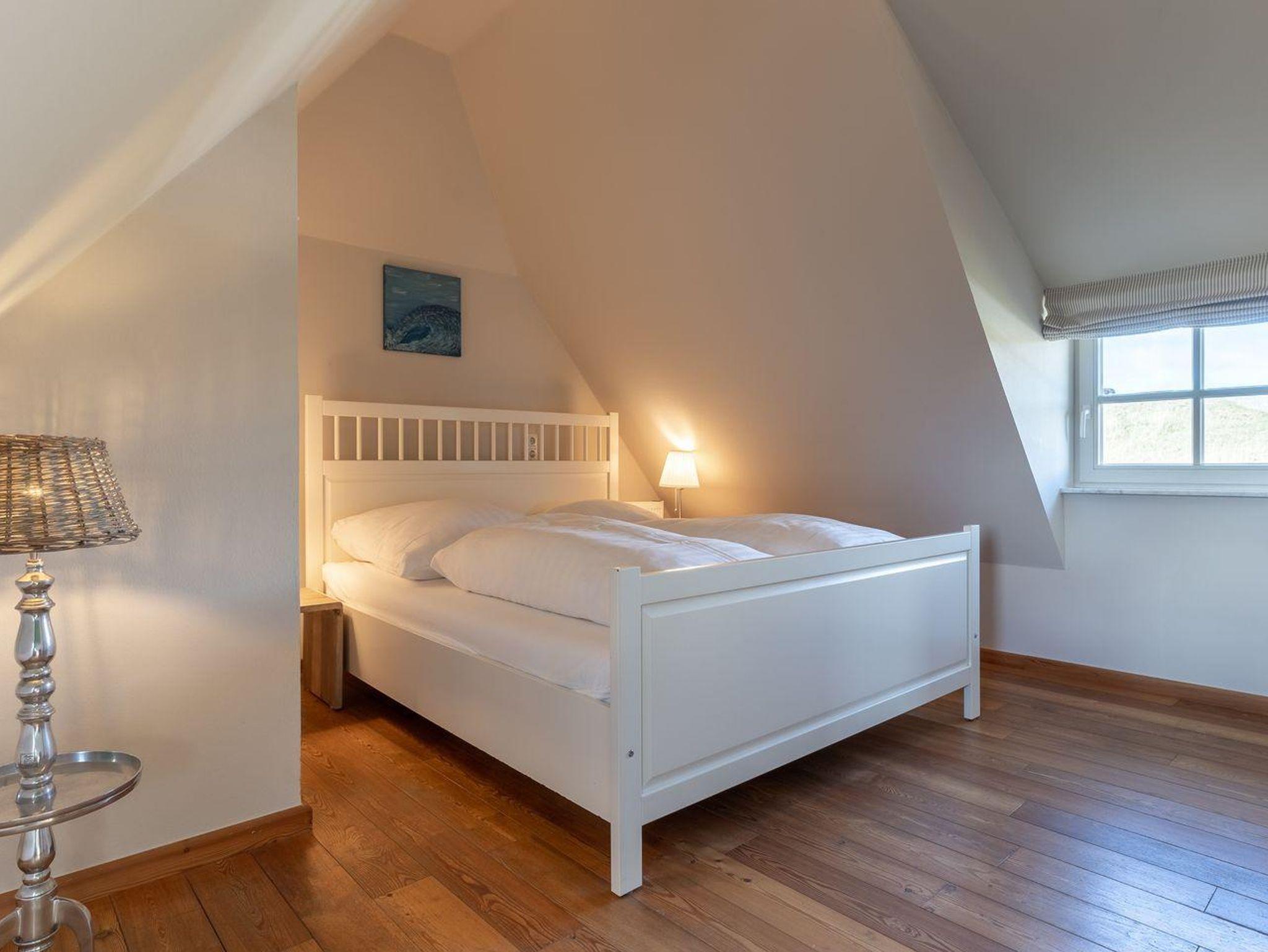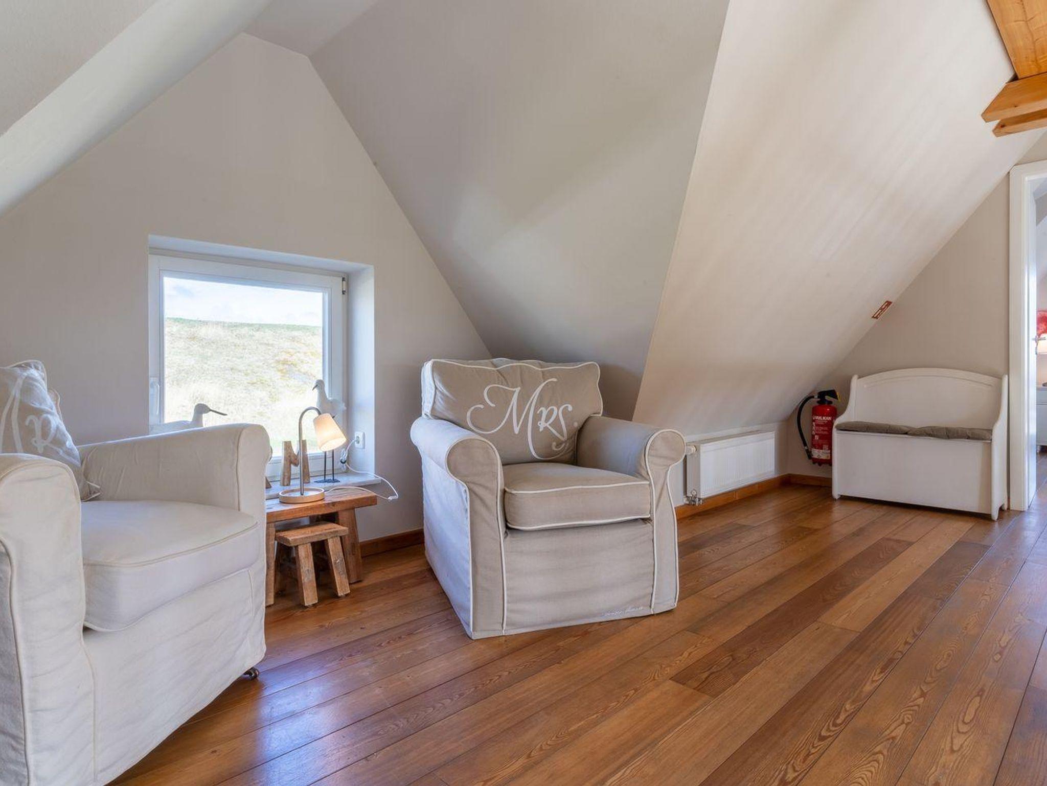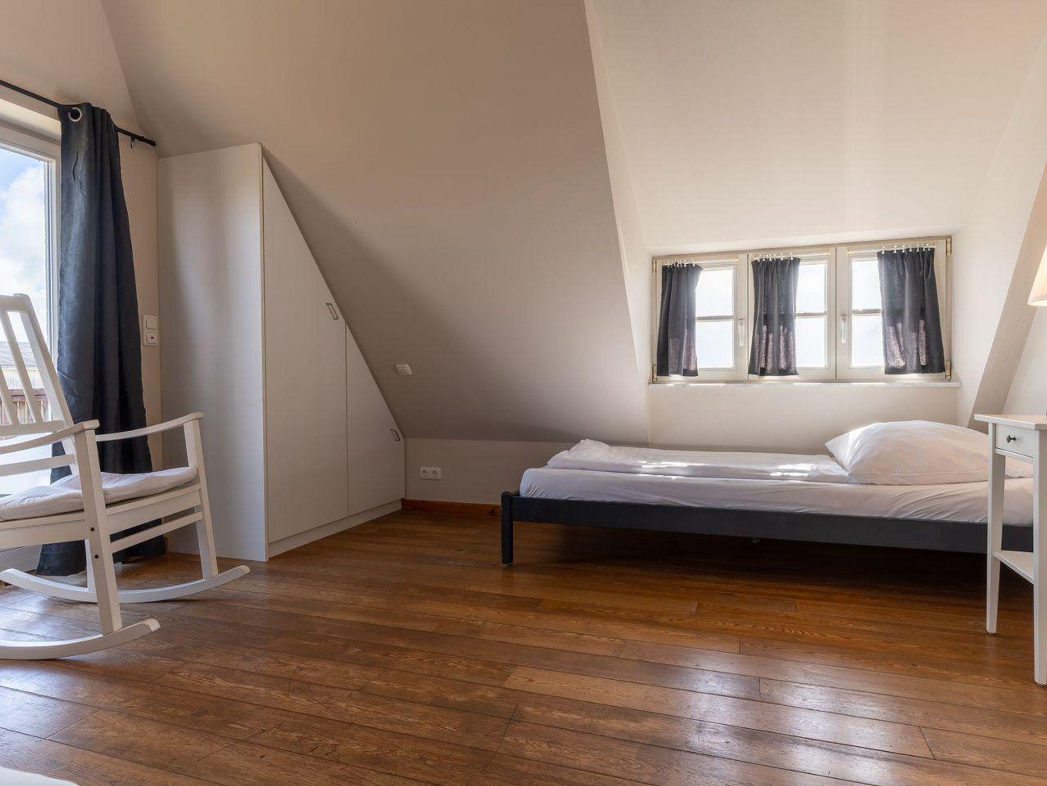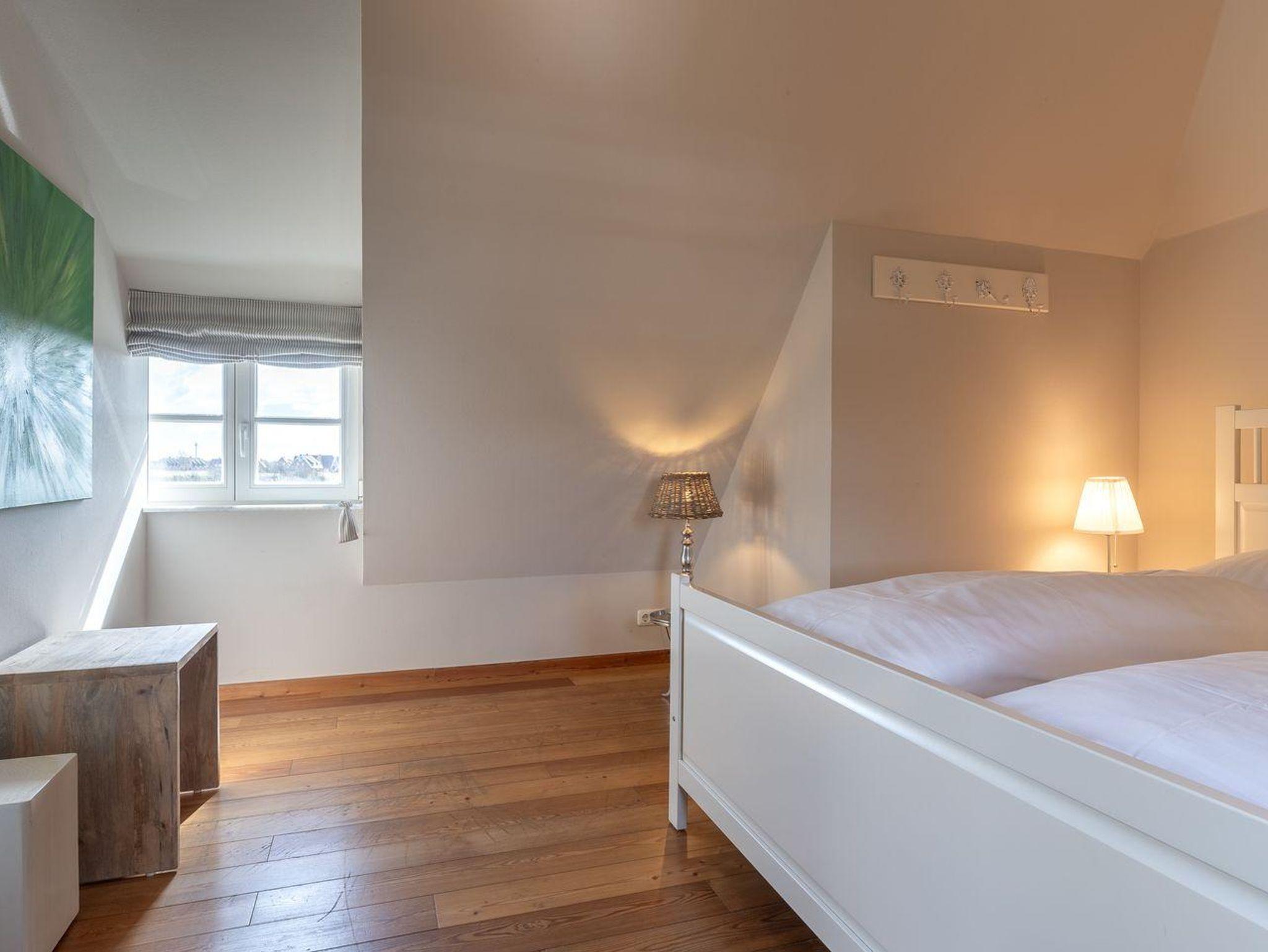 Eine große Dachterrasse schließt sich an eines der beiden Doppelschlafzimmer im 1. OG an. Von beiden Zimmern können Sie den Blick auf den Deich und den Sonnenuntergang genießen. In den Zimmern im ersten Stock und der Galerie wurden Holzdielen verlegt. Seinen Charme erhält der obere Teil auch durch seine gemütlichen Dachschrägen.