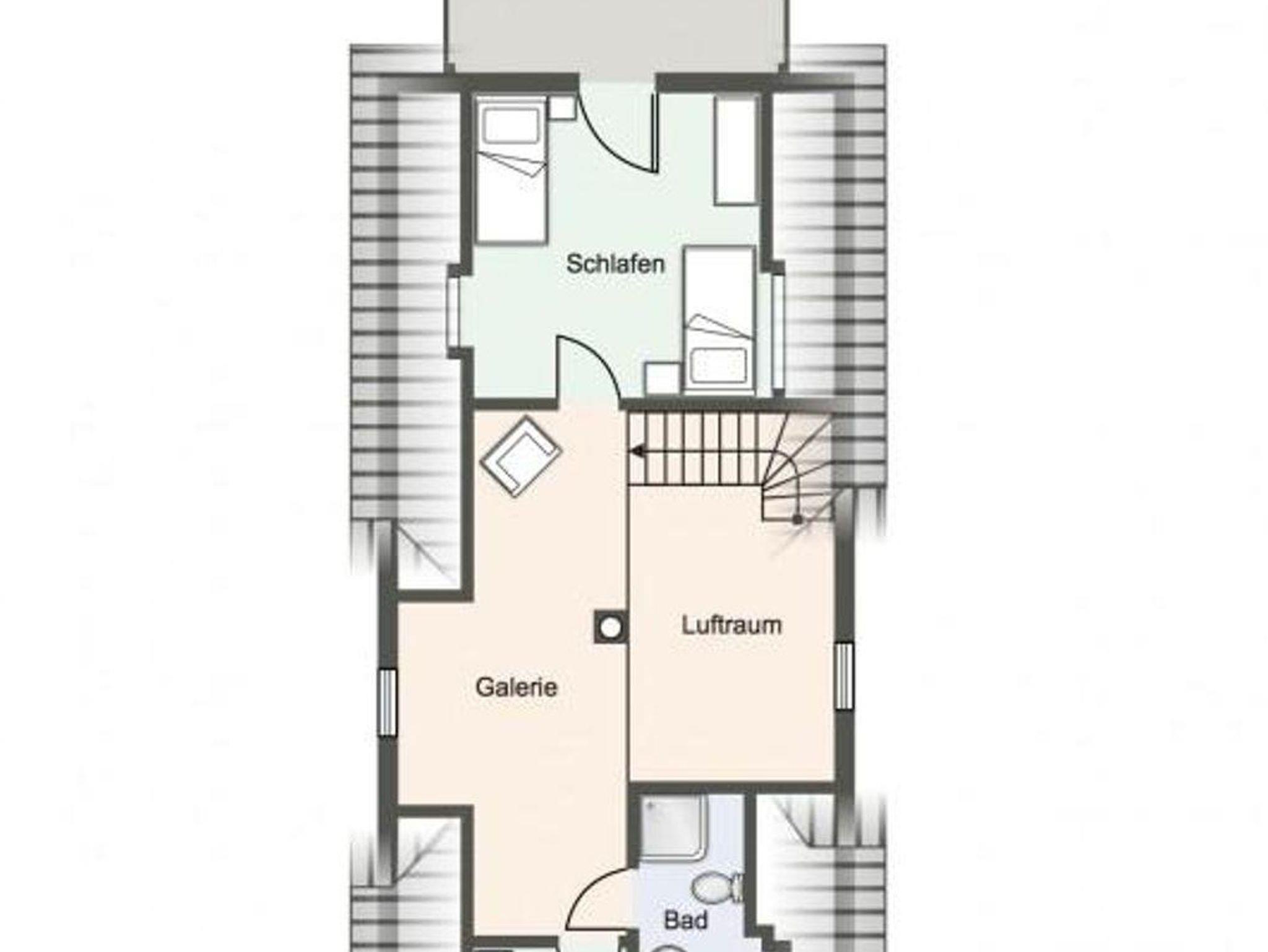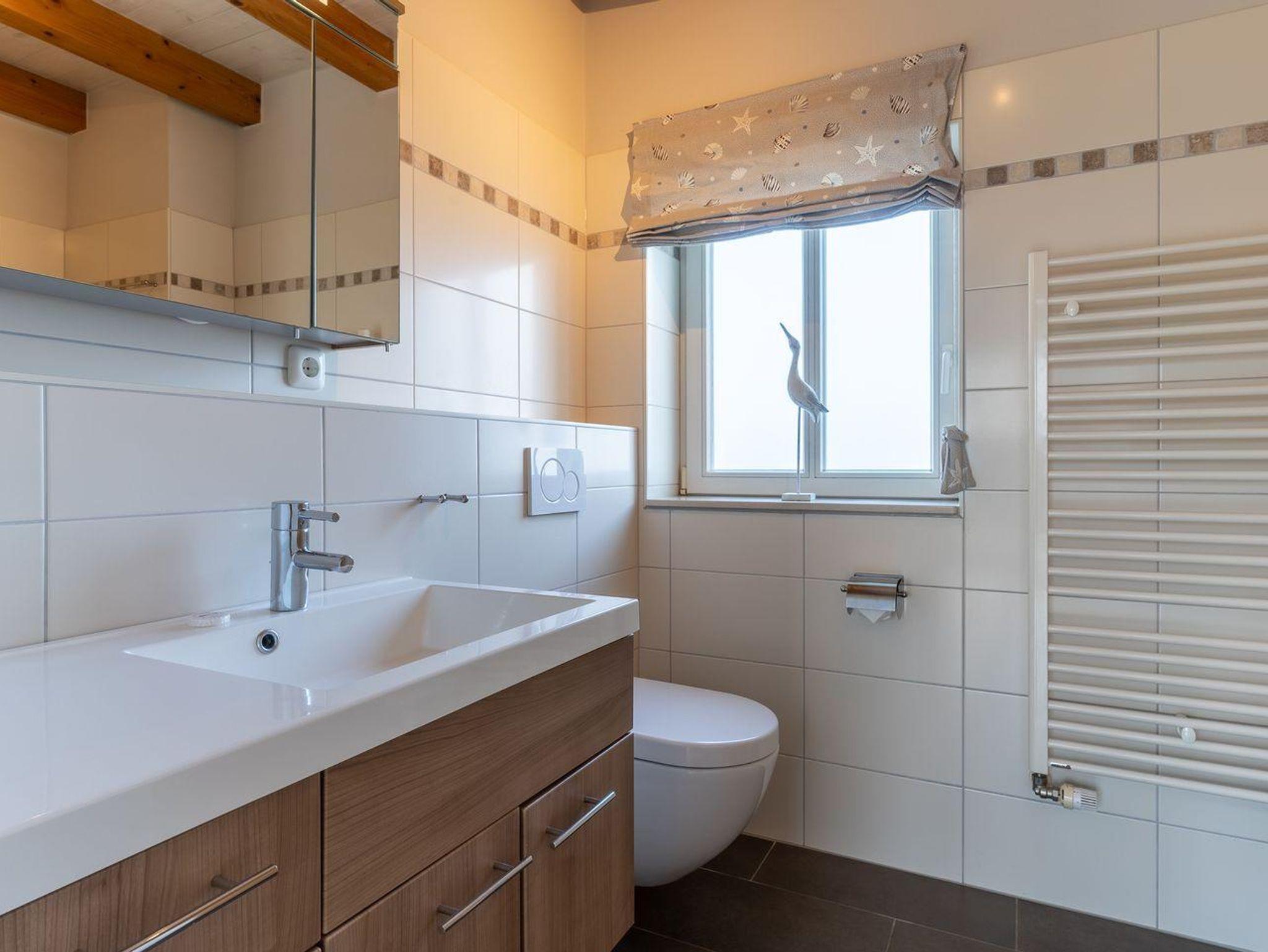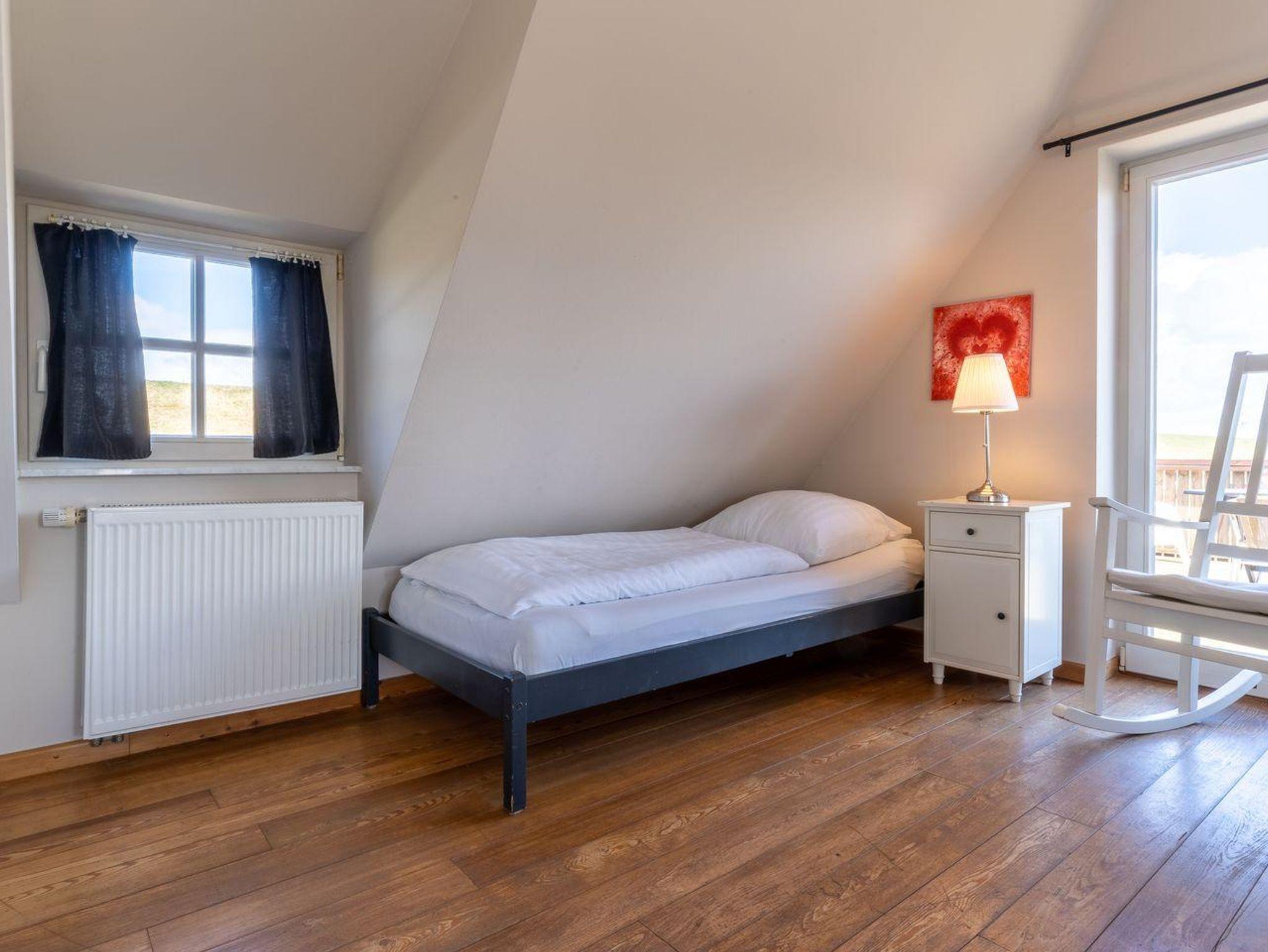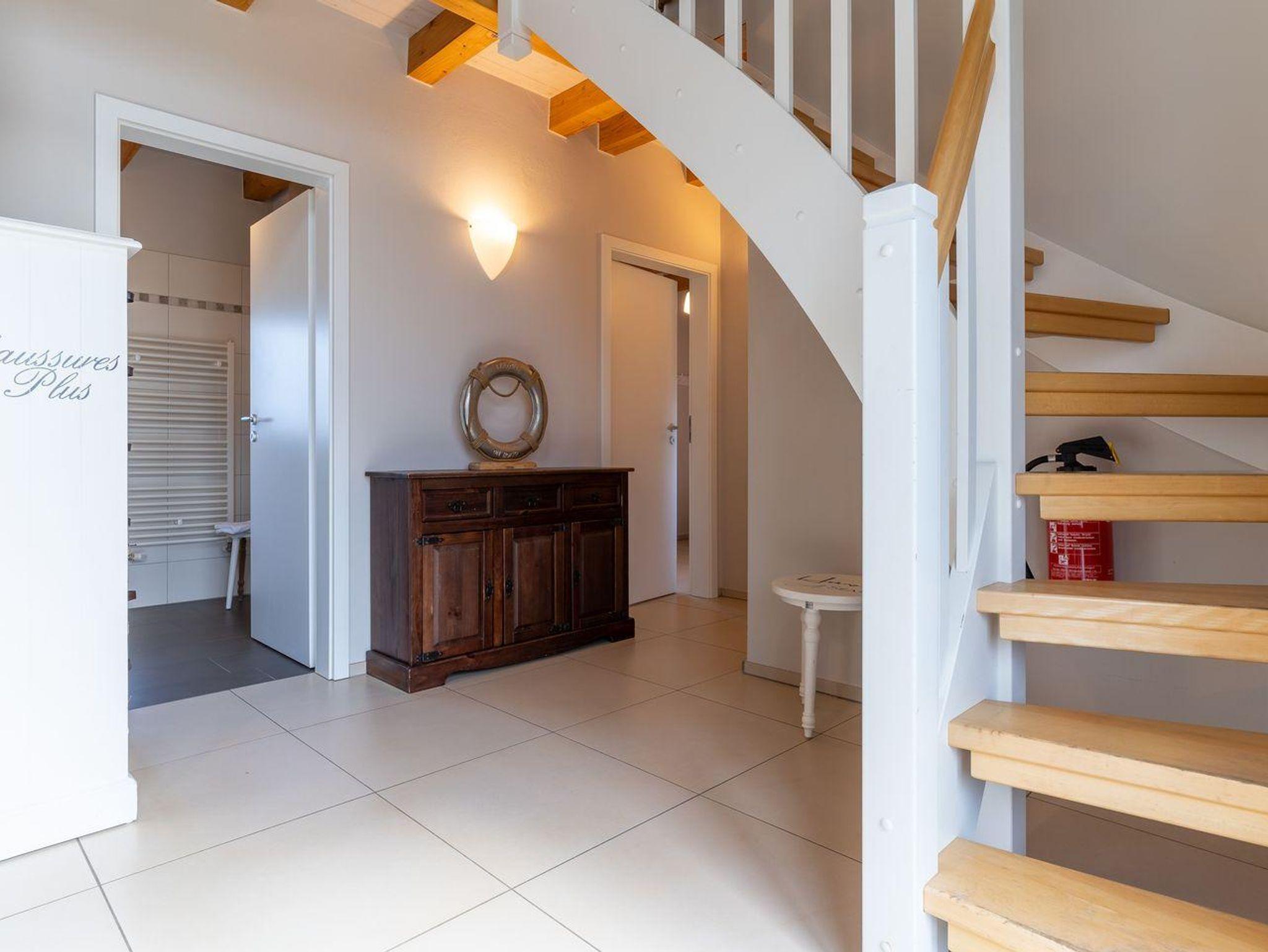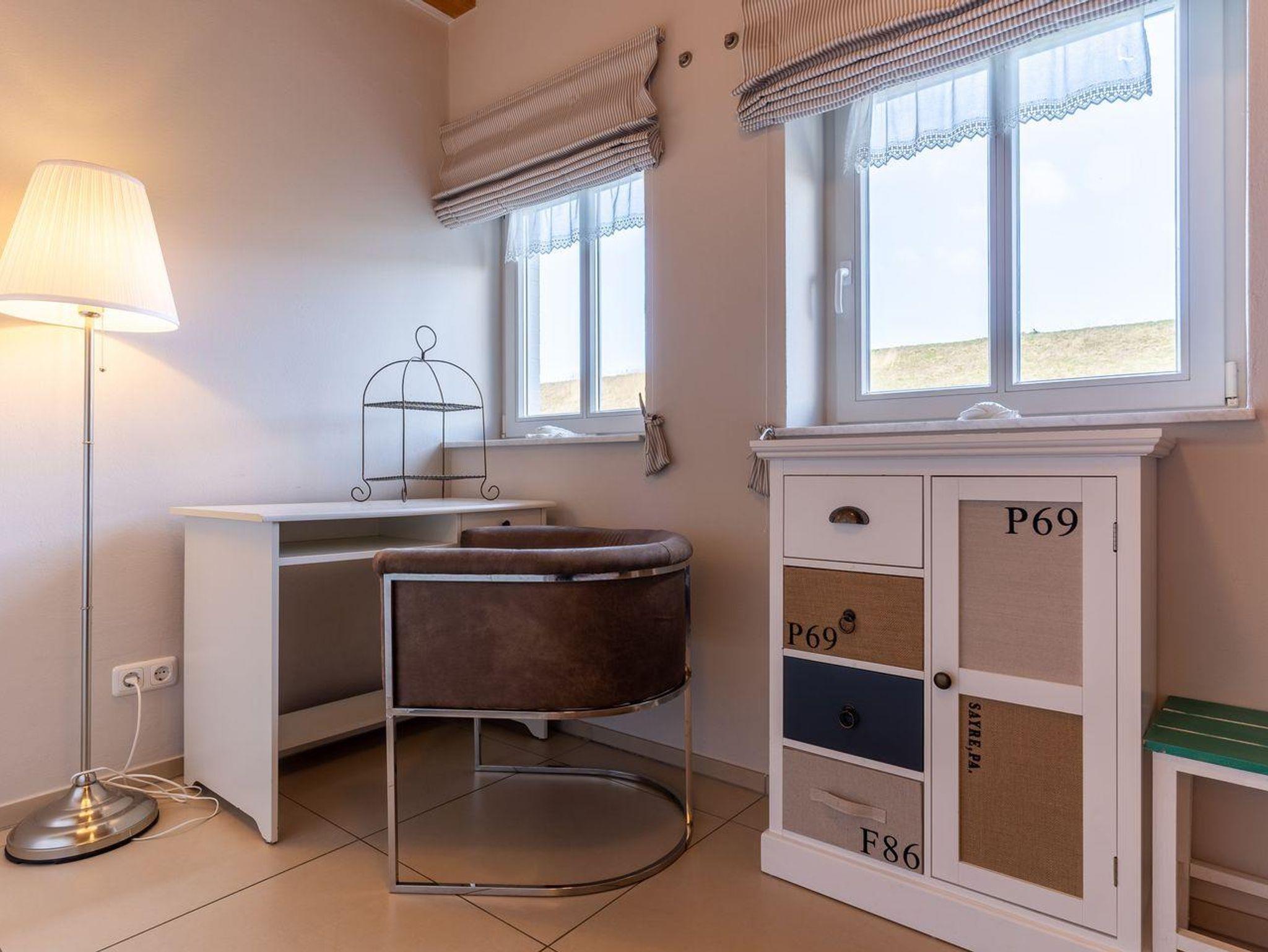 Eine große Dachterrasse schließt sich an eines der beiden Doppelschlafzimmer im 1. OG an. Von beiden Zimmern können Sie den Blick auf den Deich und den Sonnenuntergang genießen. In den Zimmern im ersten Stock und der Galerie wurden Holzdielen verlegt. Seinen Charme erhält der obere Teil auch durch seine gemütlichen Dachschrägen.