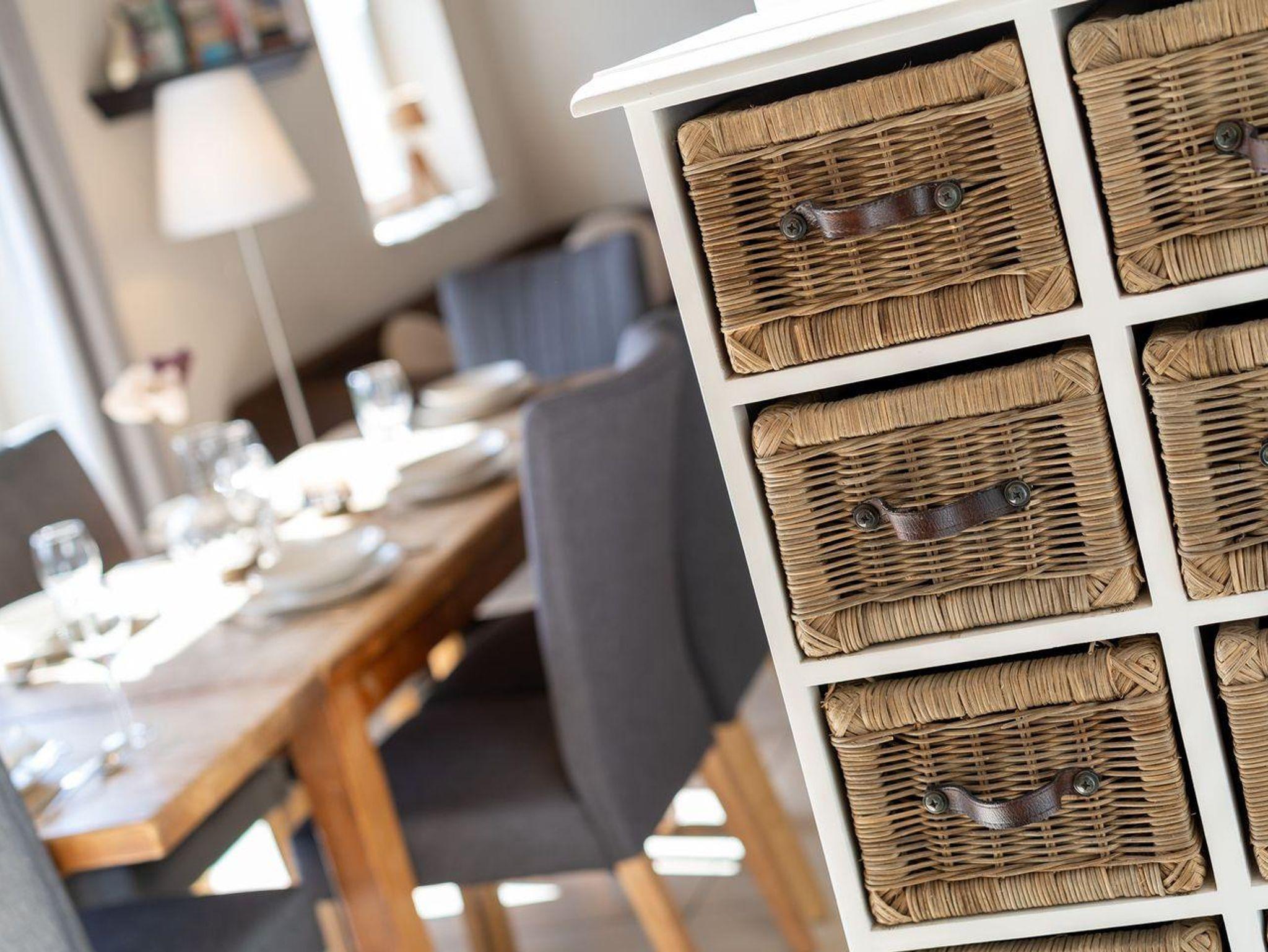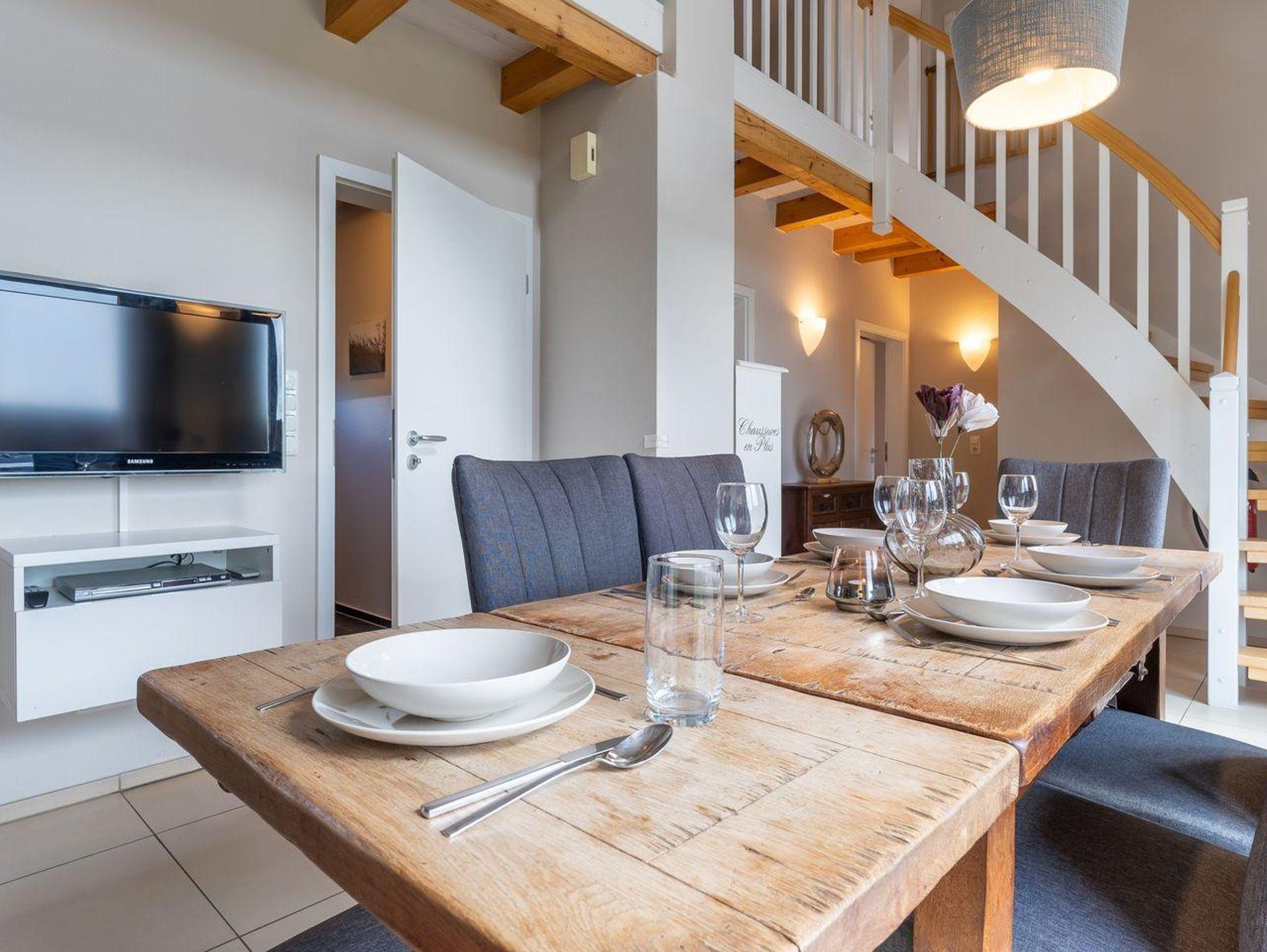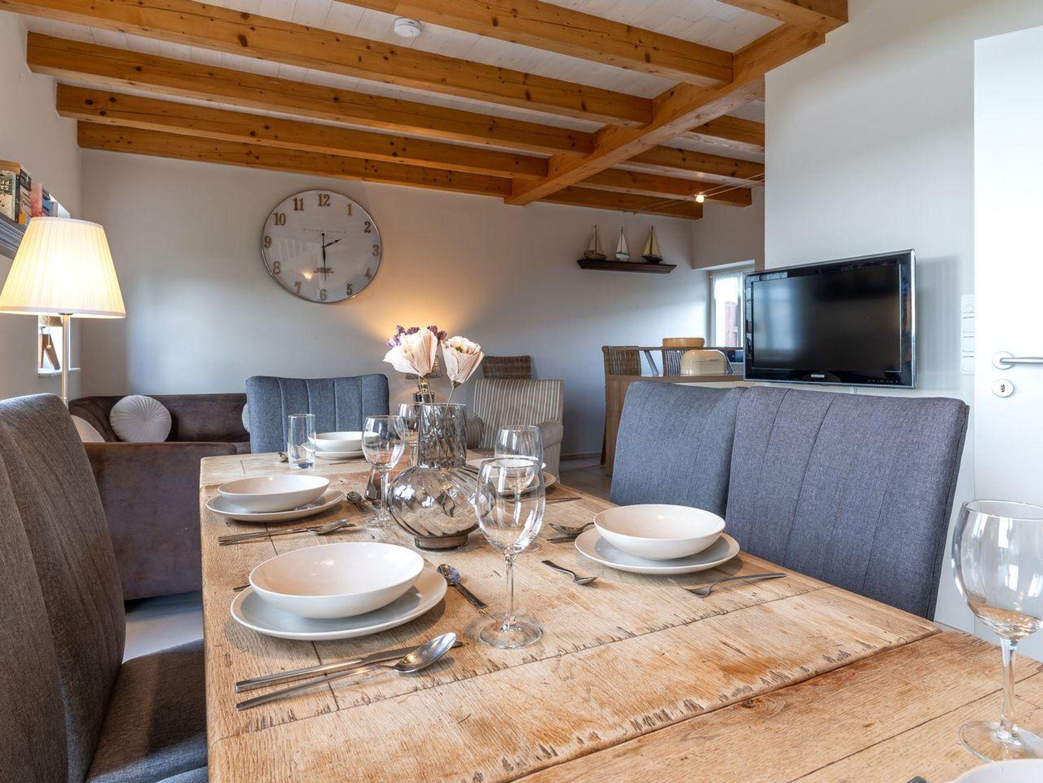 Die Friesenhaushälfte ist mit einem großen gefliesten Wohnraum mit offener Galerie ausgestattet. Hier befindet sich ein großer Esstisch, eine gemütliche Eckcouch mit Sessel sowie die offene, voll ausgestattete Einbauküche (inkl. Kaffeemaschine, Toaster, Wasserkocher, Backofen, Gefrierschrank, Cerankochfeld, Dunstabzugshaube, Geschirrspüler, Eierkocher, Staubsauger, Bügeleisen, Wäschegestell).