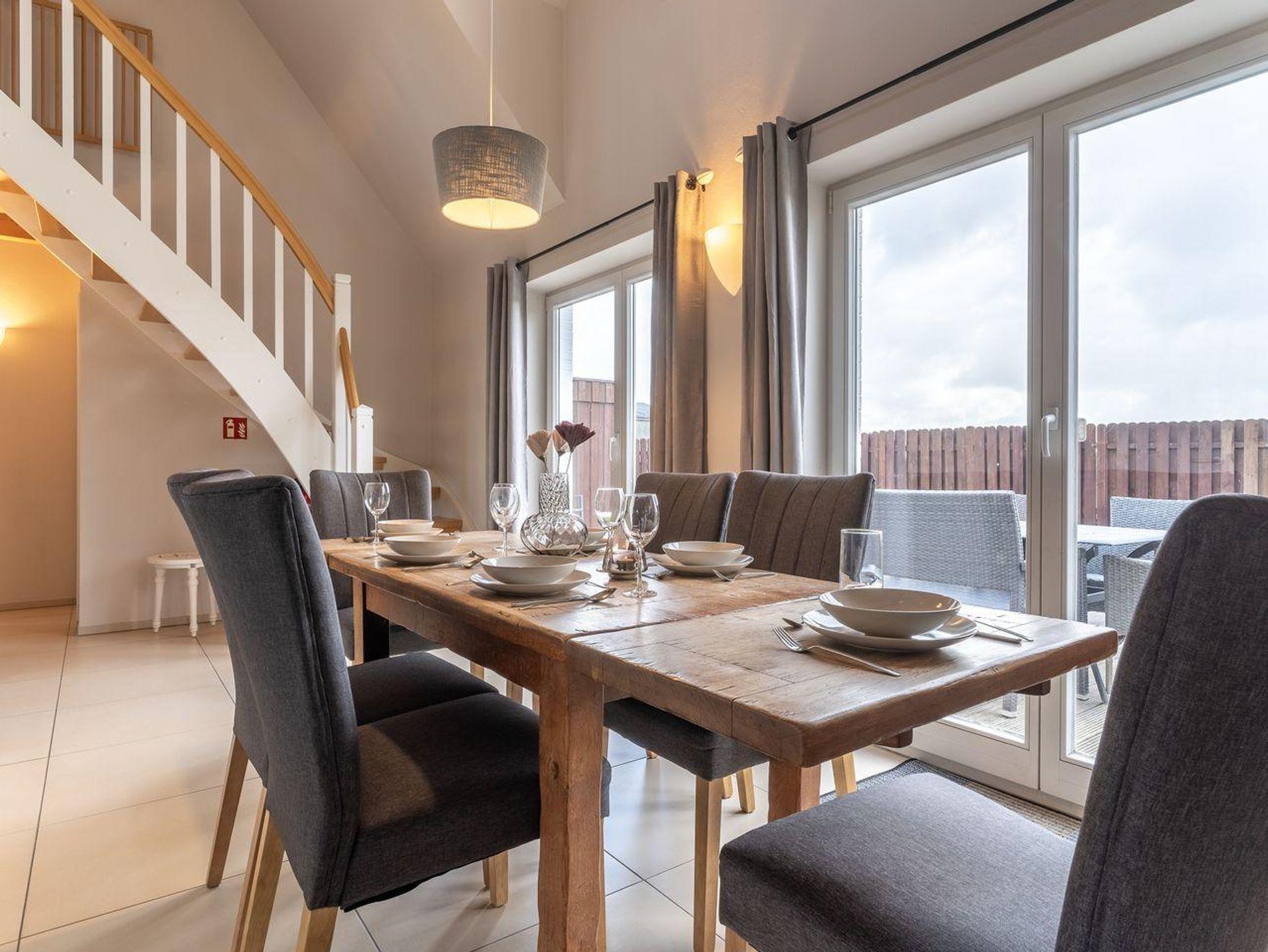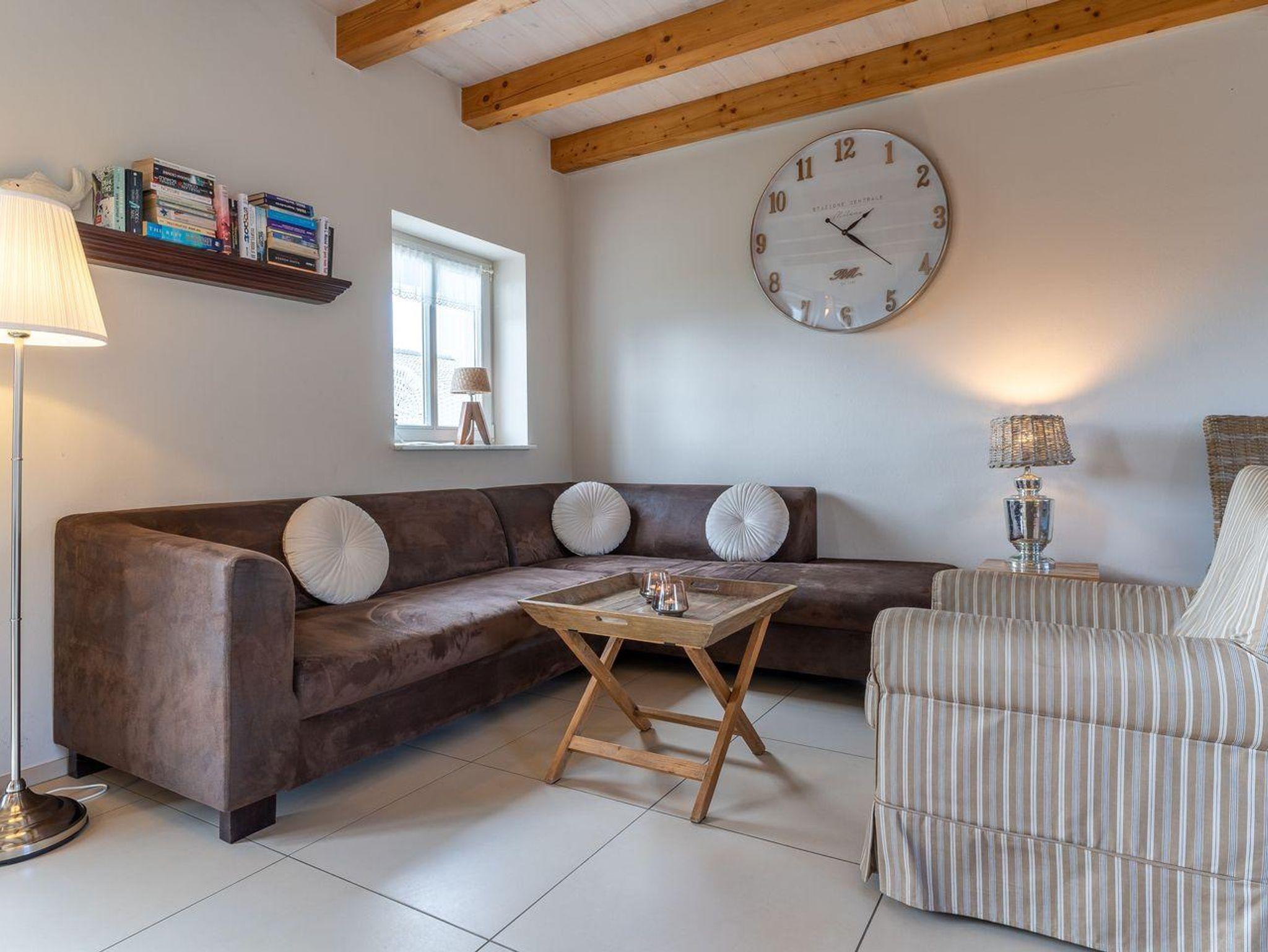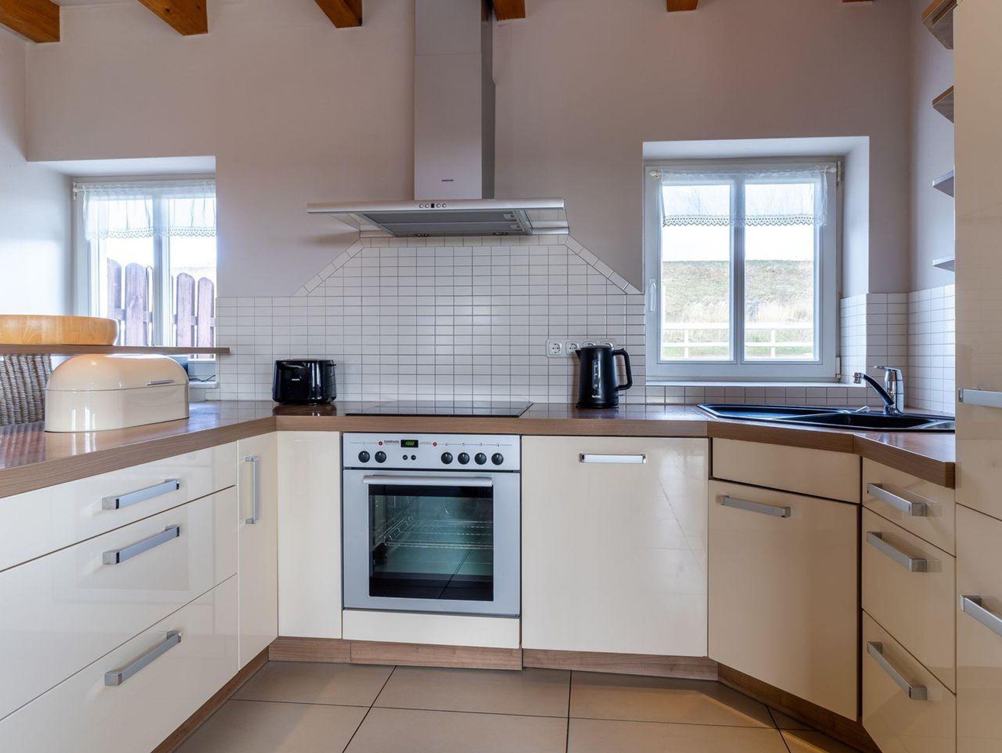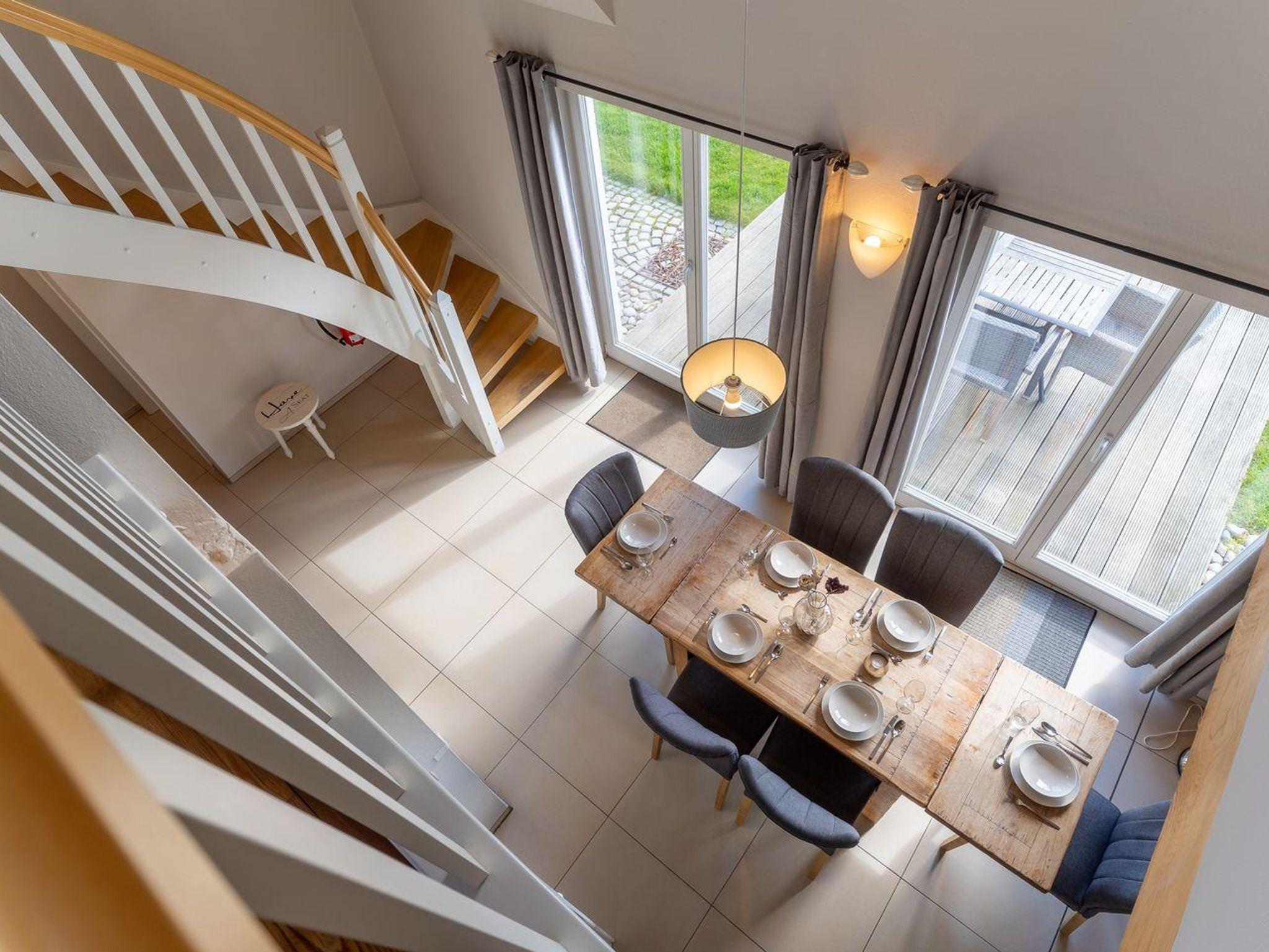 Die Friesenhaushälfte ist mit einem großen gefliesten Wohnraum mit offener Galerie ausgestattet. Hier befindet sich ein großer Esstisch, eine gemütliche Eckcouch mit Sessel sowie die offene, voll ausgestattete Einbauküche (inkl. Kaffeemaschine, Toaster, Wasserkocher, Backofen, Gefrierschrank, Cerankochfeld, Dunstabzugshaube, Geschirrspüler, Eierkocher, Staubsauger, Bügeleisen, Wäschegestell).