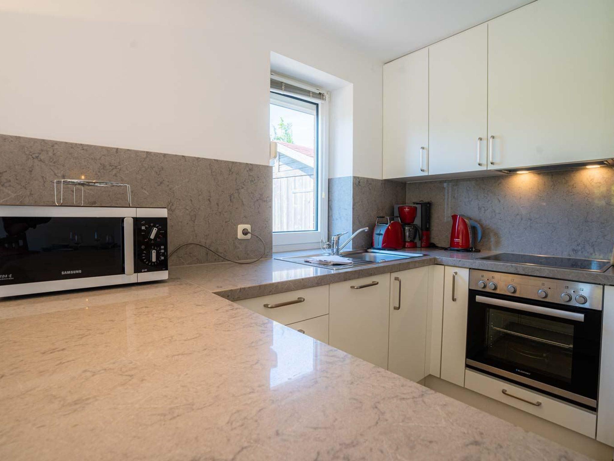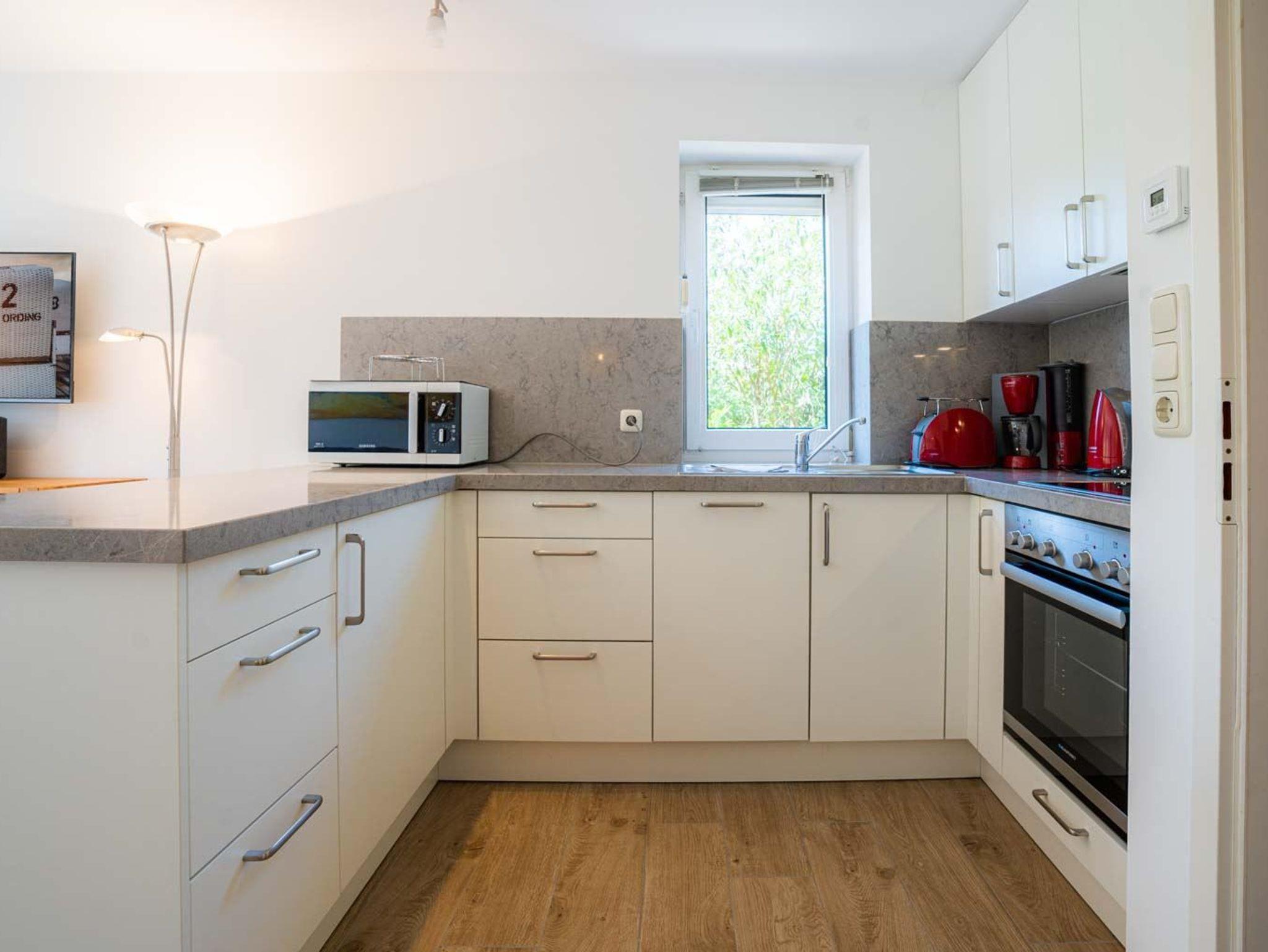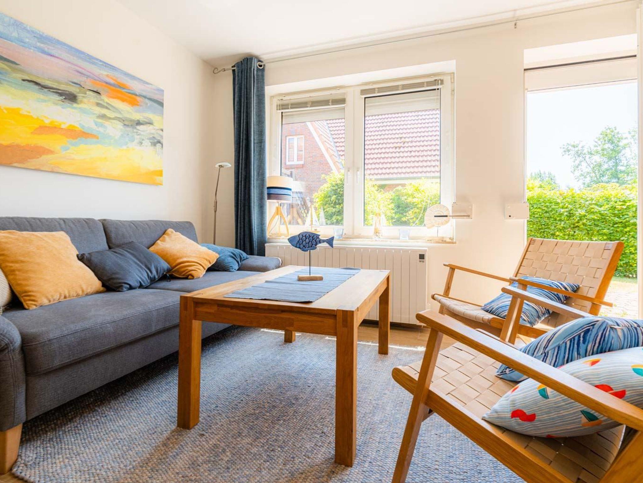 Wohnzimmer mit Sofa (2er), 2 Sesseln, Kommode, TV (Kabel), Hifi-Anlage und Esstisch mit 4 Stühlen. Direkter Zugang zur möblierten Gartenterrasse nach Südwesten. Offene Küche mit Backofen, Mikrowelle, Geschirrspüler und Kühlschrank mit Gefrierfach.