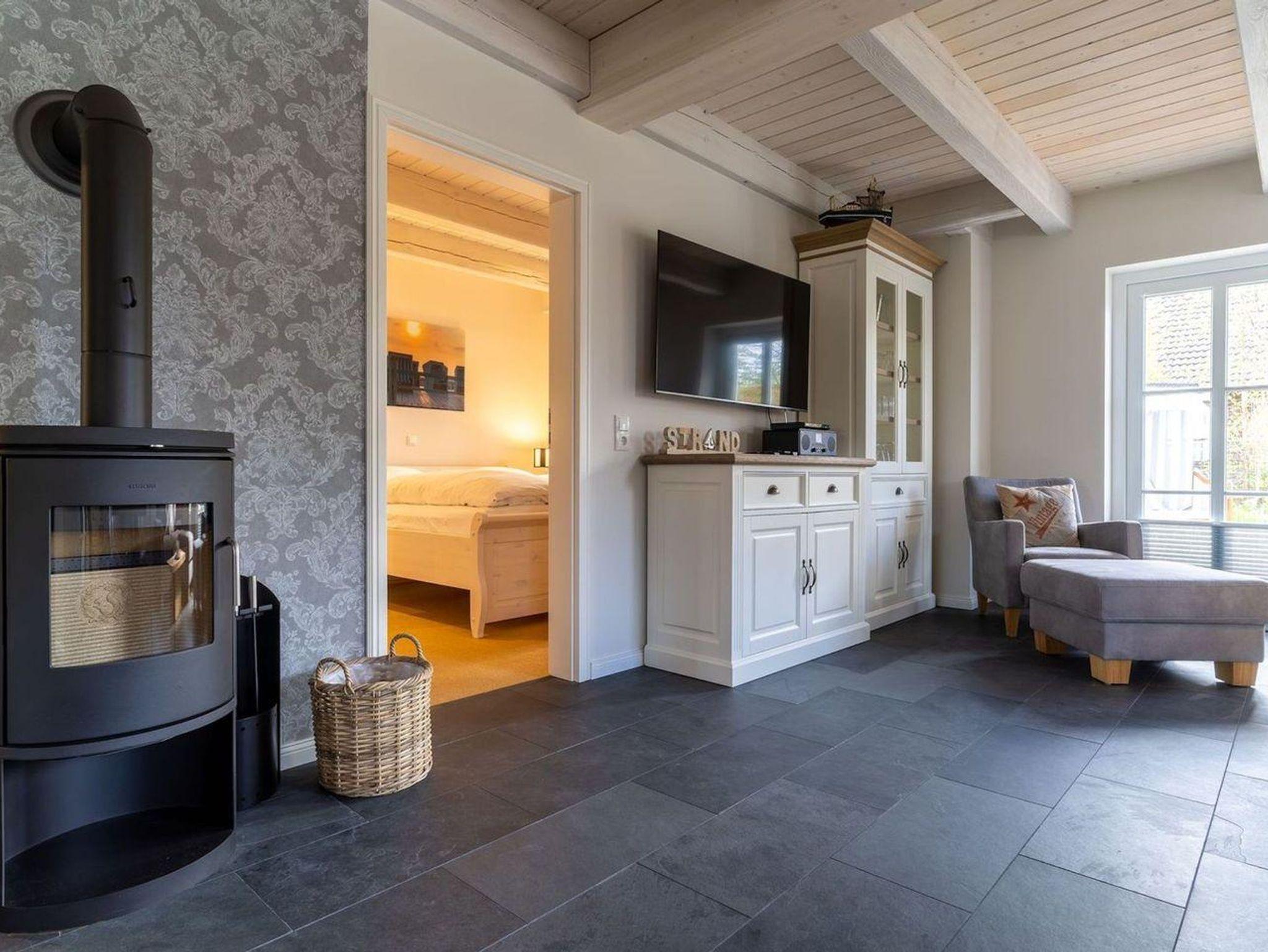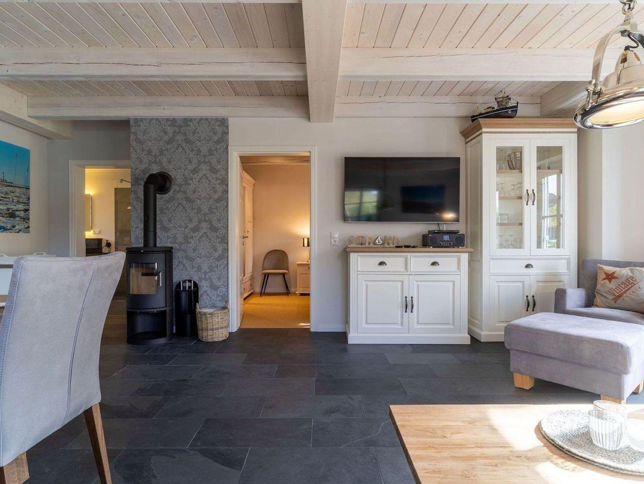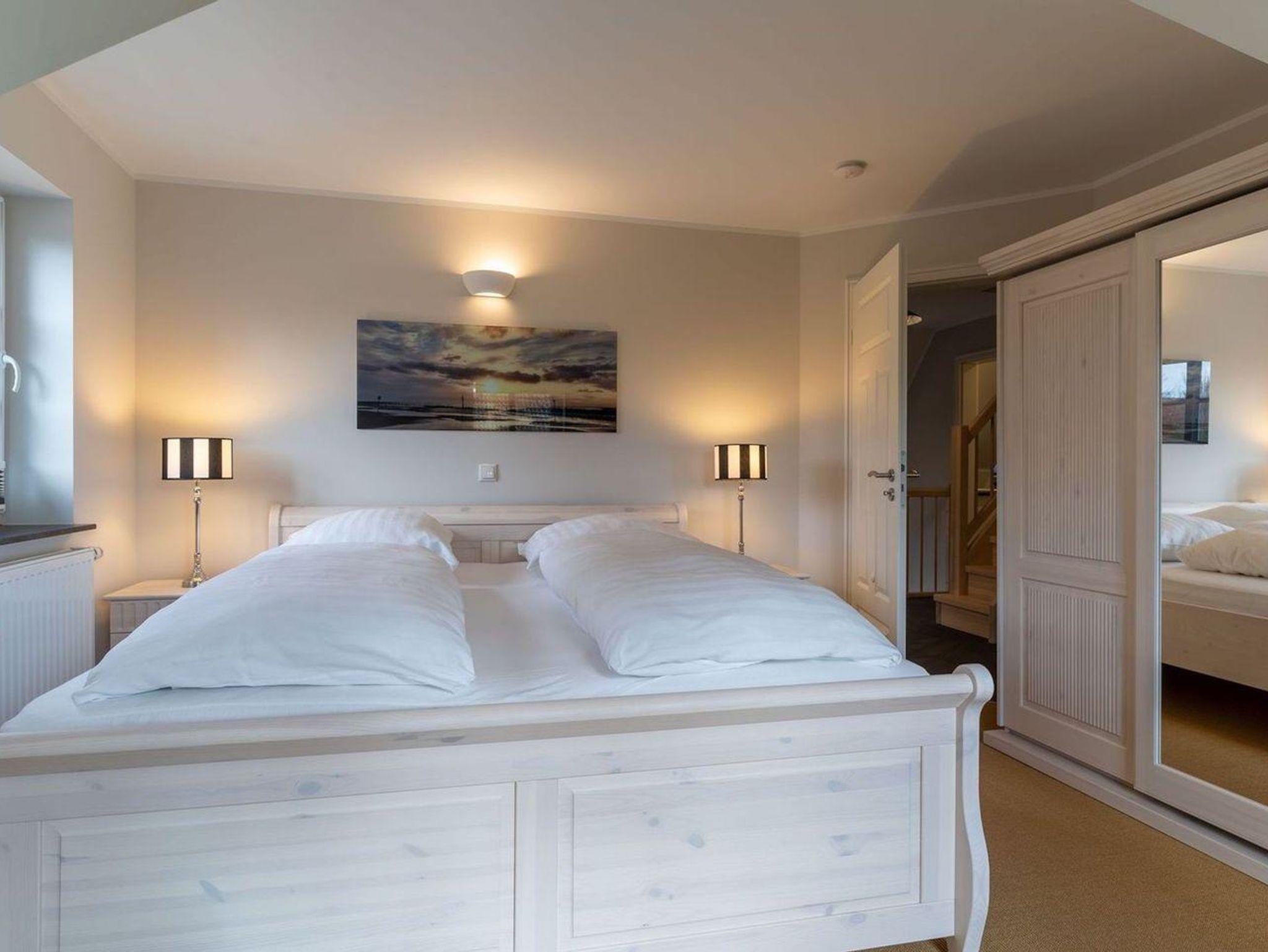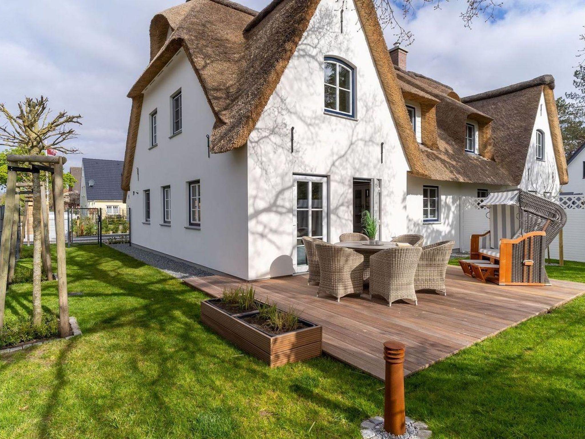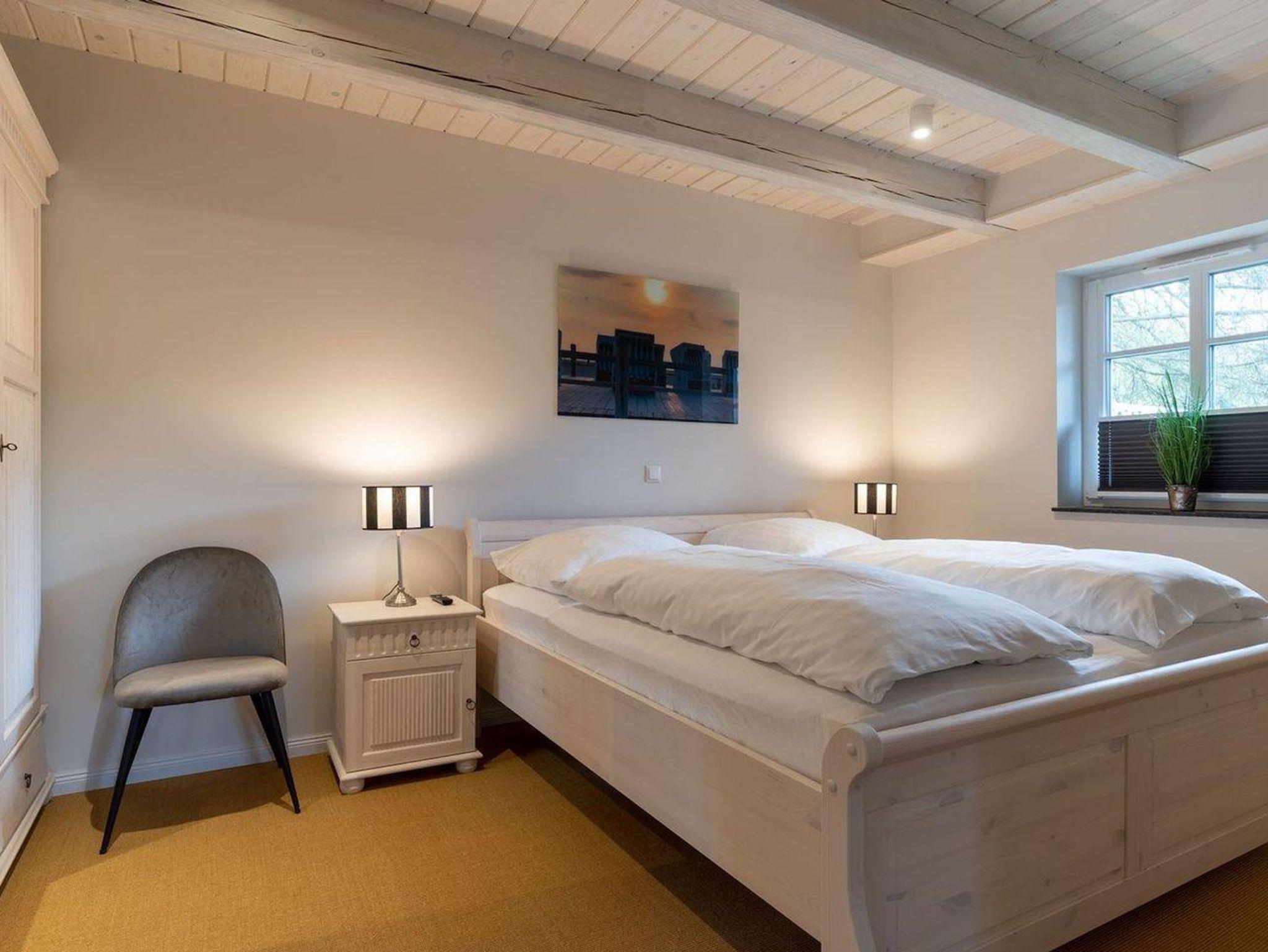 Das luxuriöse Reetdachhaus-Hälfte ist ca. 140 m² groß und bietet Platz für 6 Personen.Im Erdgeschoss befindet sich der lichtdurchflutete Wohnraum mit TV, Kamin, einer offenen Küche sowie einem stilvollen Essbereich.Die Küche ist ausgestattet mit Backofen und Geschirrspüler, sowie einem Esperto-Caffè-Automat, Toaster, Wasserkocher und den üblichen Küchenutensilien.An den Wohnbereich schließen sich ein Flur, ein Duschbad und ein Doppelschlafzimmer an.Das Erdgeschoss ist rollstuhlfreundlich.Über eine Holztreppe gelangt man in das Obergeschoss. Die beiden Schlafzimmer - jeweils mit einem Doppelbett - sorgen für ruhevolle Erholung.Im ersten Stock befindet sich ausserdem ein weiteres Duschbad sowie eine Sauna.