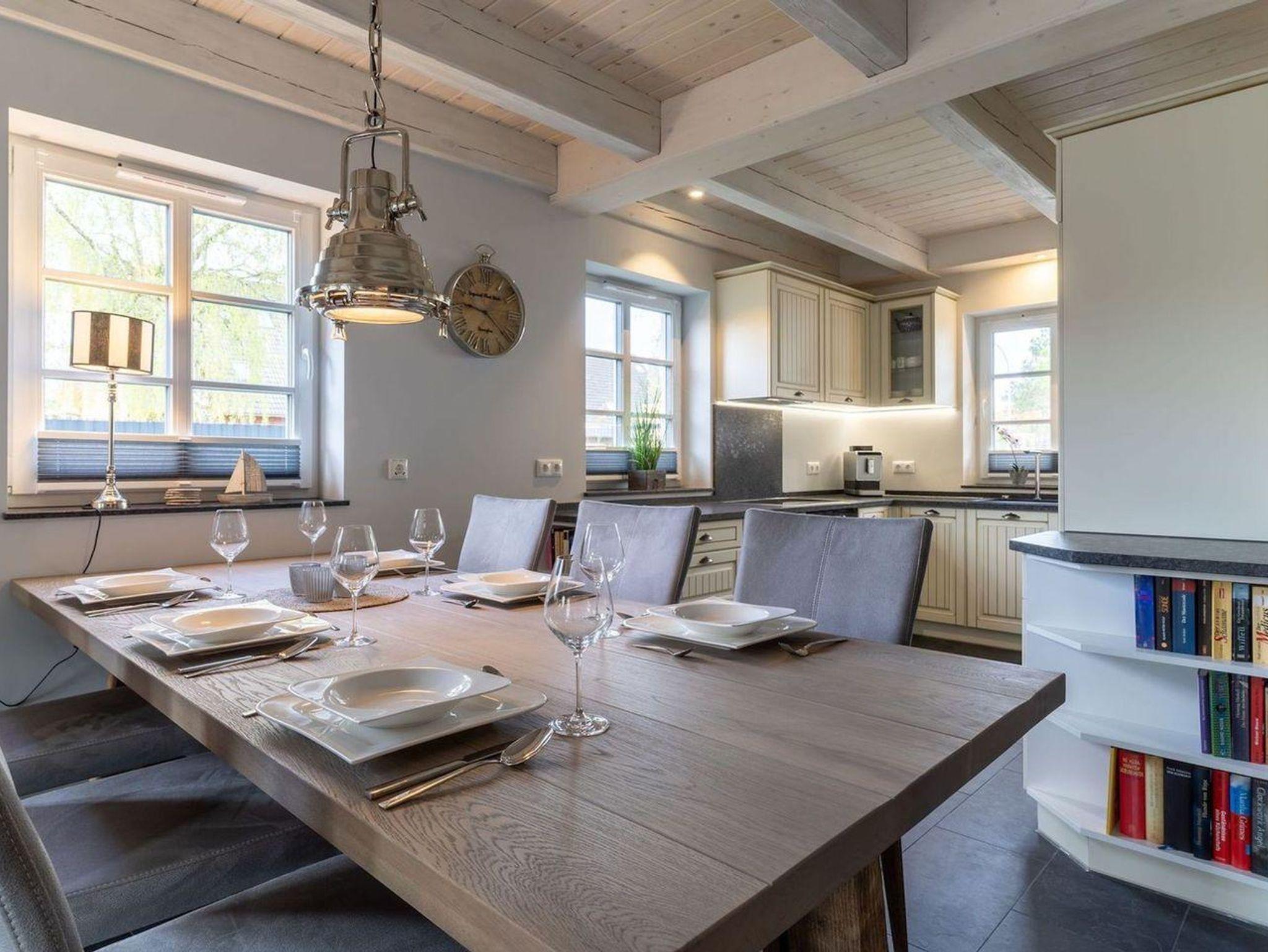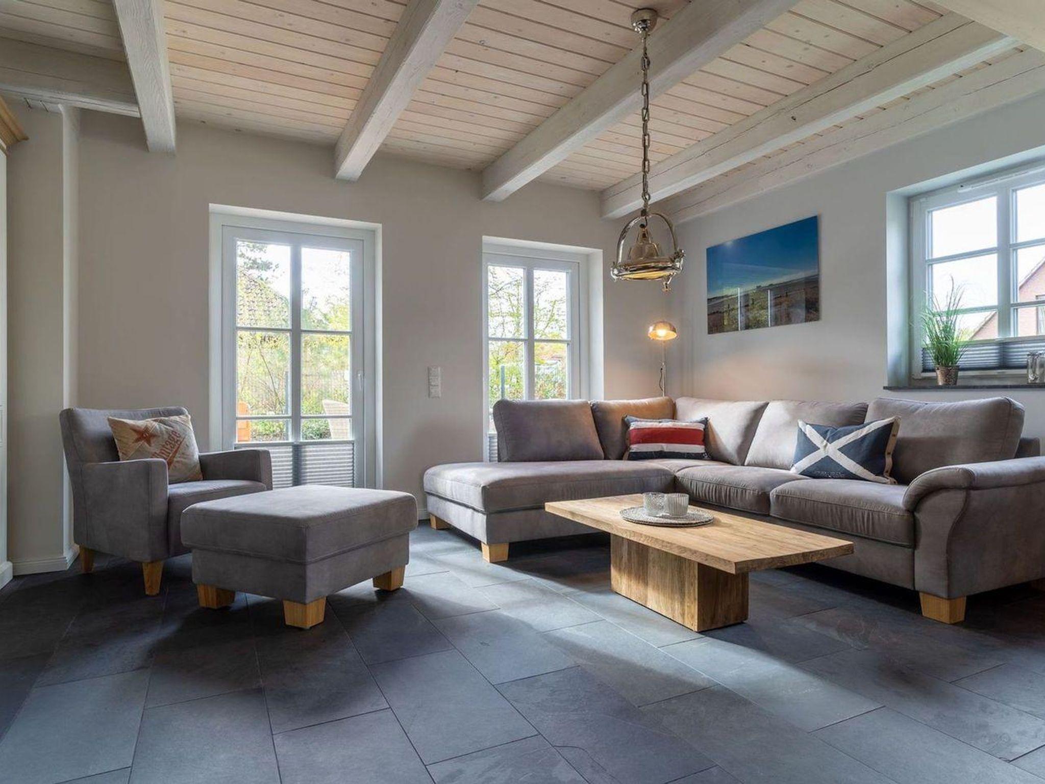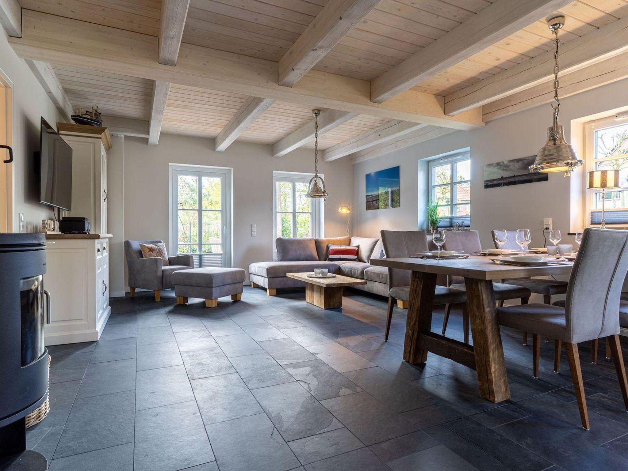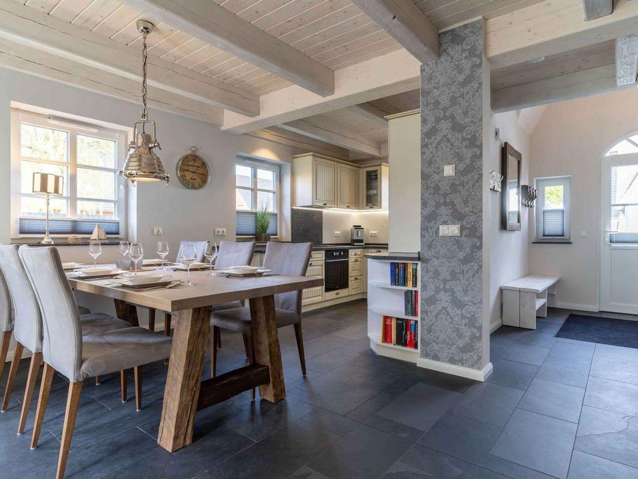 Das luxuriöse Reetdachhaus-Hälfte ist ca. 140 m² groß und bietet Platz für 6 Personen.Im Erdgeschoss befindet sich der lichtdurchflutete Wohnraum mit TV, Kamin, einer offenen Küche sowie einem stilvollen Essbereich.Die Küche ist ausgestattet mit Backofen und Geschirrspüler, sowie einem Esperto-Caffè-Automat, Toaster, Wasserkocher und den üblichen Küchenutensilien.An den Wohnbereich schließen sich ein Flur, ein Duschbad und ein Doppelschlafzimmer an.Das Erdgeschoss ist rollstuhlfreundlich.Über eine Holztreppe gelangt man in das Obergeschoss. Die beiden Schlafzimmer - jeweils mit einem Doppelbett - sorgen für ruhevolle Erholung.Im ersten Stock befindet sich ausserdem ein weiteres Duschbad sowie eine Sauna.