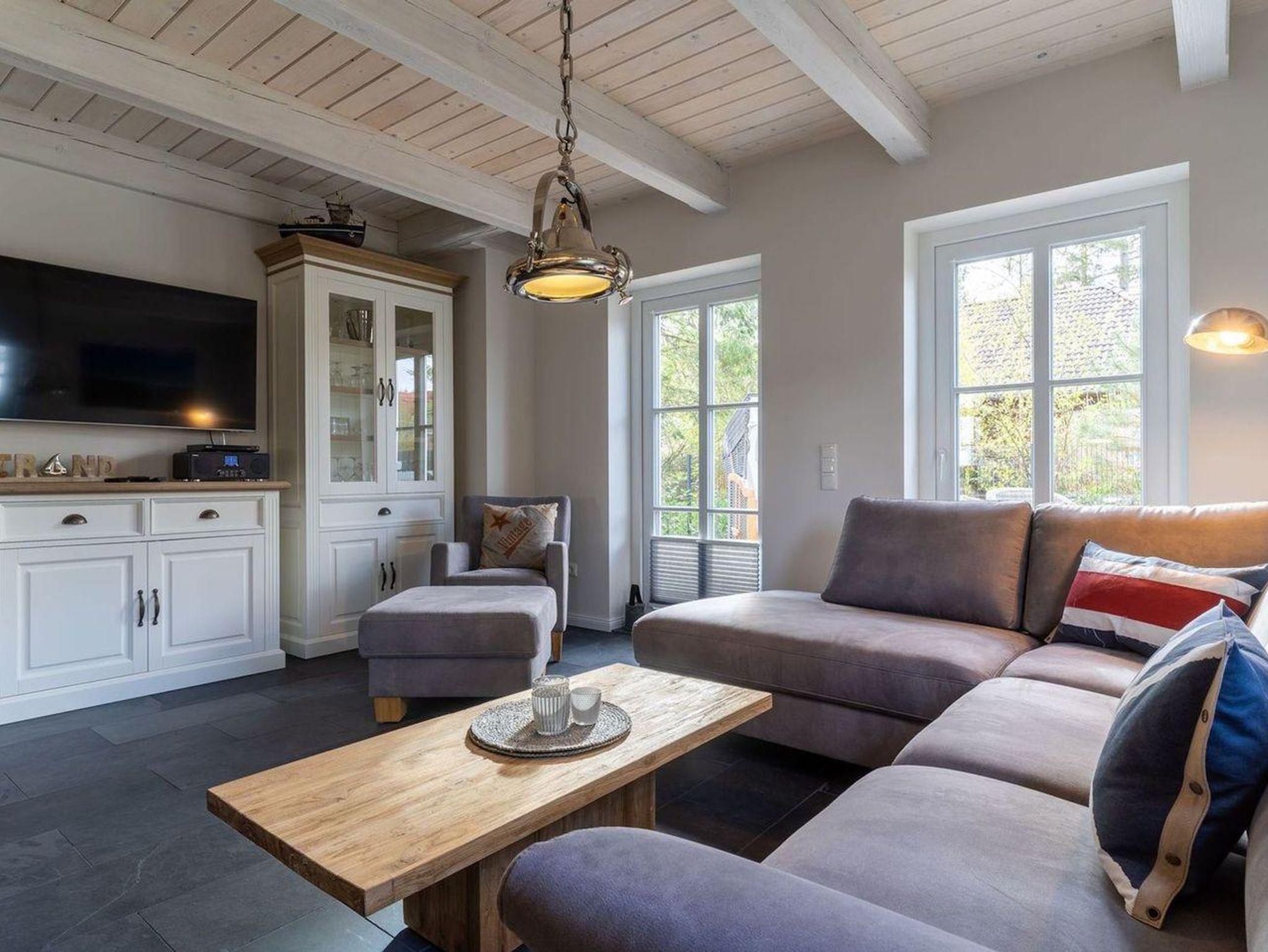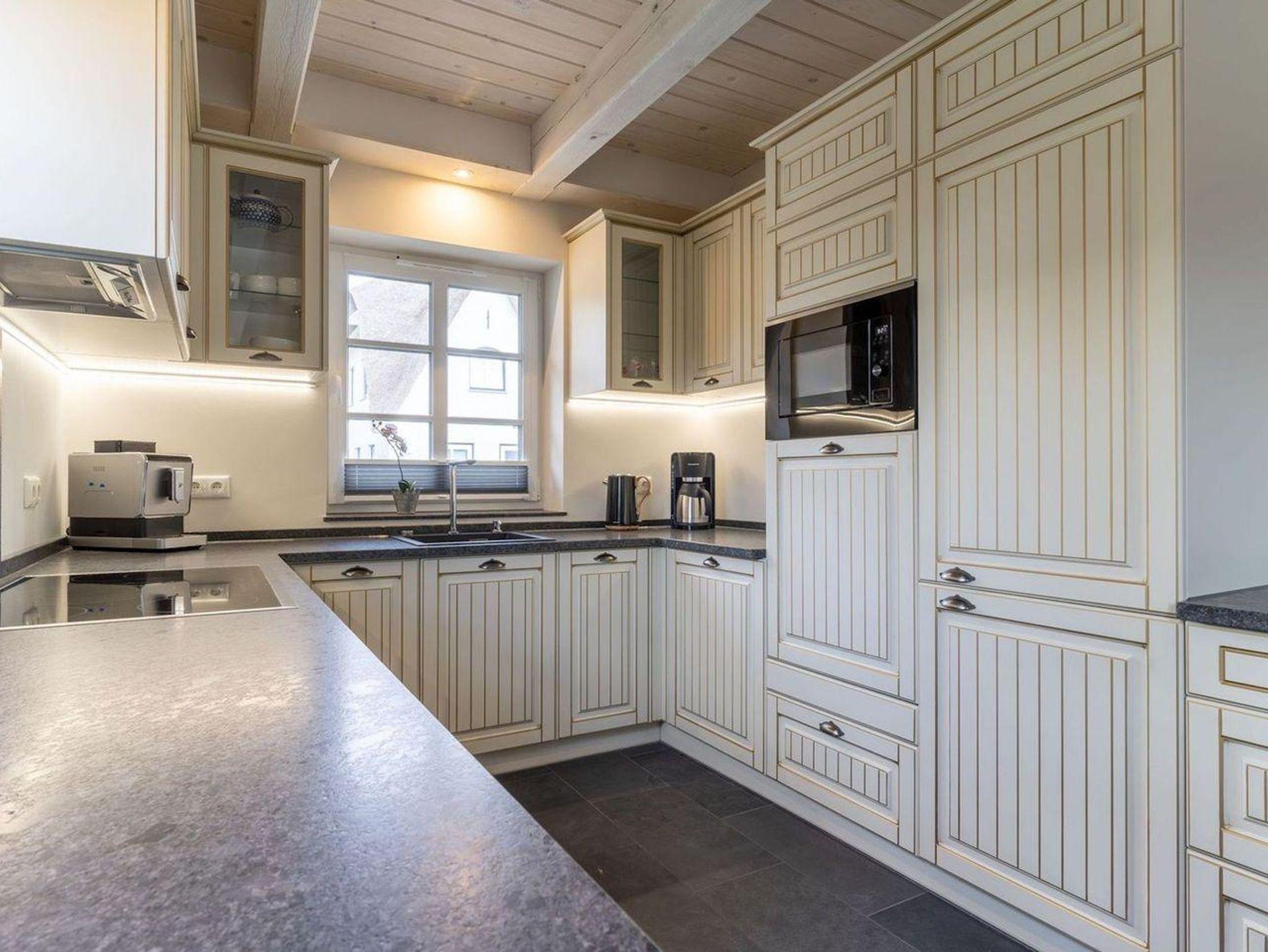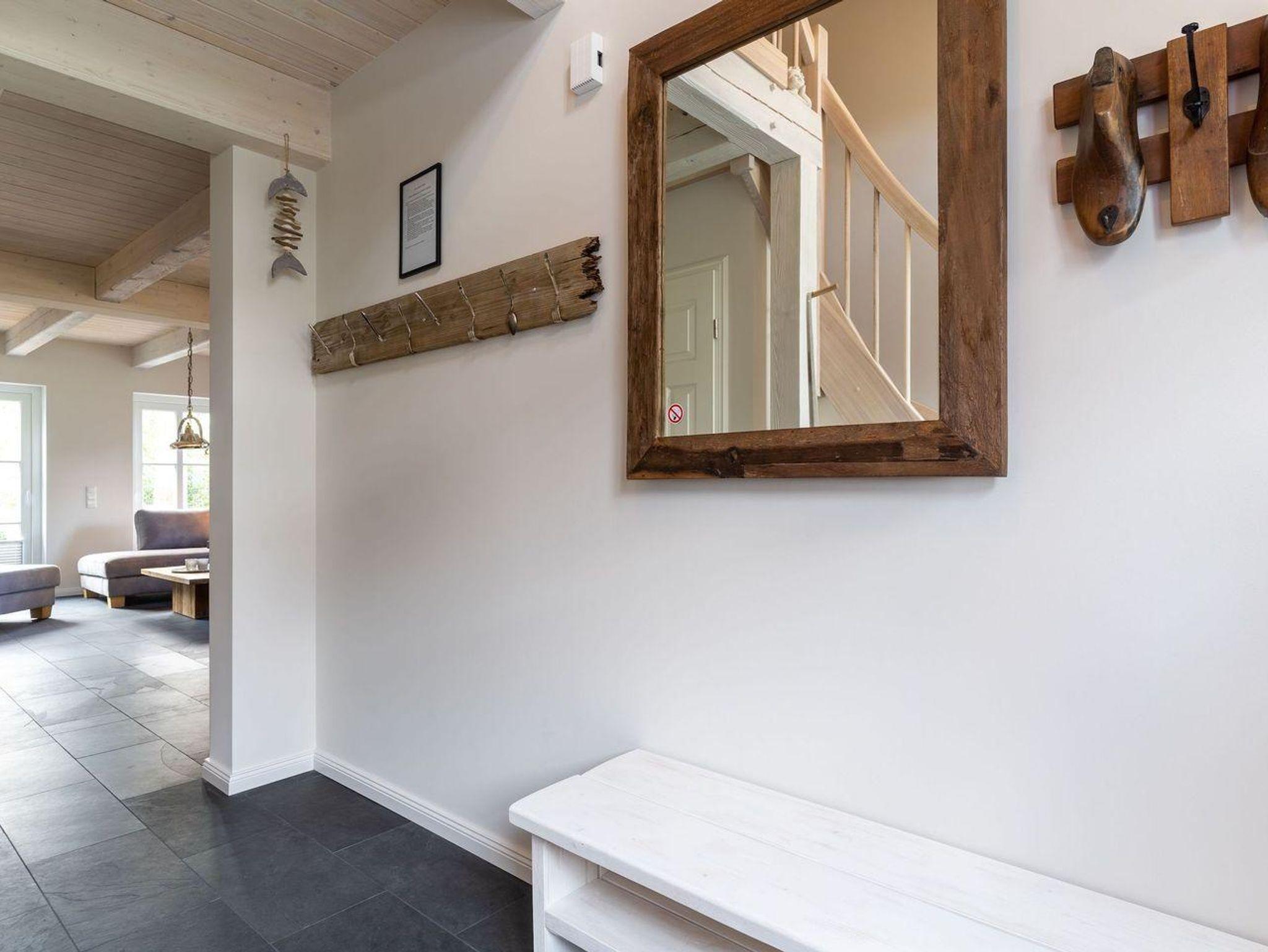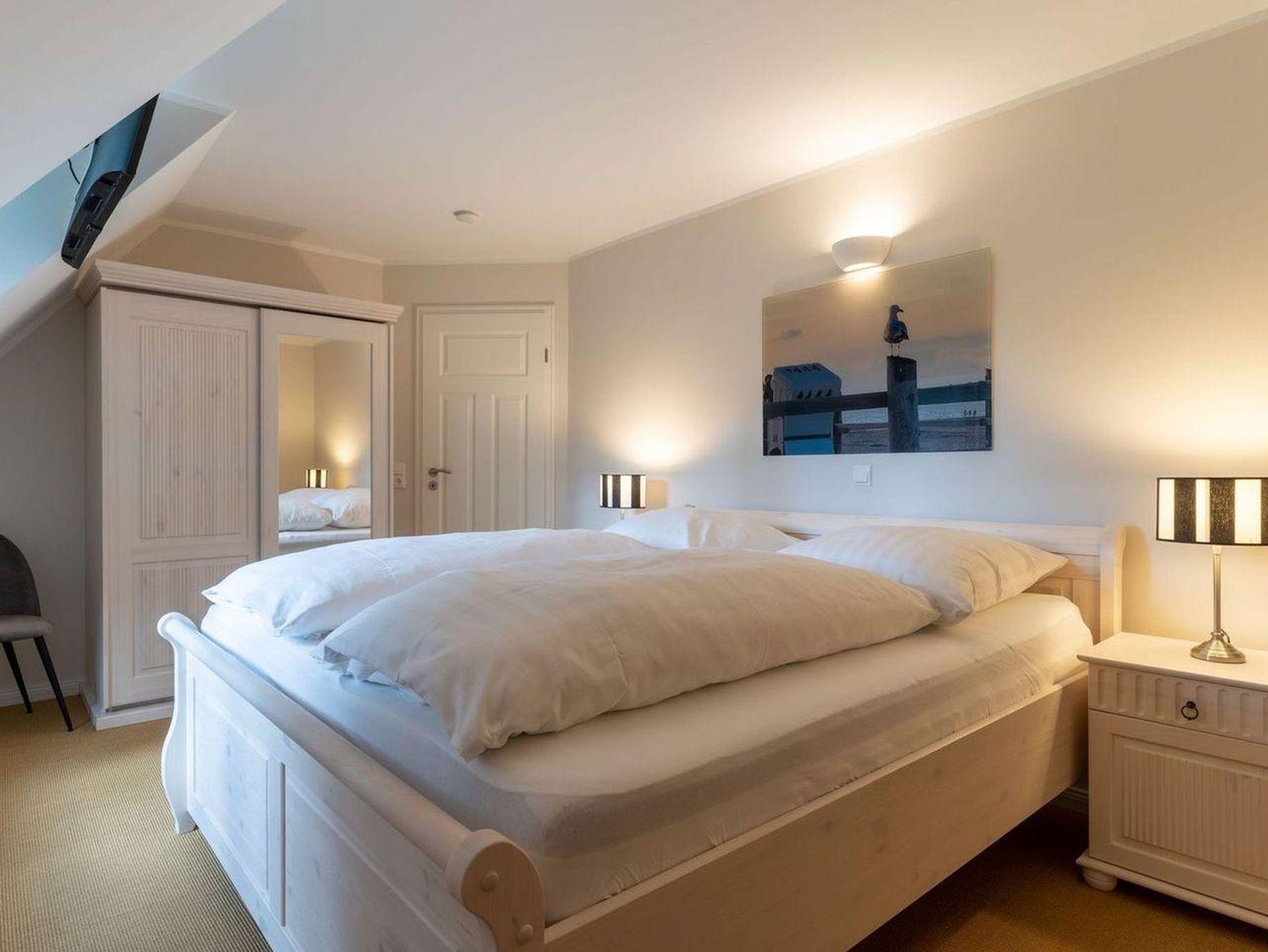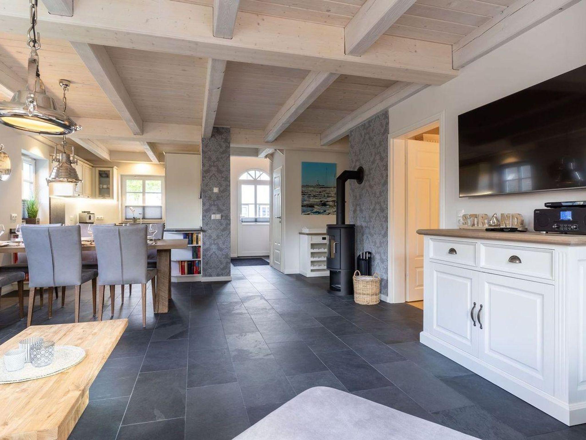 Das luxuriöse Reetdachhaus-Hälfte ist ca. 140 m² groß und bietet Platz für 6 Personen.Im Erdgeschoss befindet sich der lichtdurchflutete Wohnraum mit TV, Kamin, einer offenen Küche sowie einem stilvollen Essbereich.Die Küche ist ausgestattet mit Backofen und Geschirrspüler, sowie einem Esperto-Caffè-Automat, Toaster, Wasserkocher und den üblichen Küchenutensilien.An den Wohnbereich schließen sich ein Flur, ein Duschbad und ein Doppelschlafzimmer an.Das Erdgeschoss ist rollstuhlfreundlich.Über eine Holztreppe gelangt man in das Obergeschoss. Die beiden Schlafzimmer - jeweils mit einem Doppelbett - sorgen für ruhevolle Erholung.Im ersten Stock befindet sich ausserdem ein weiteres Duschbad sowie eine Sauna.
