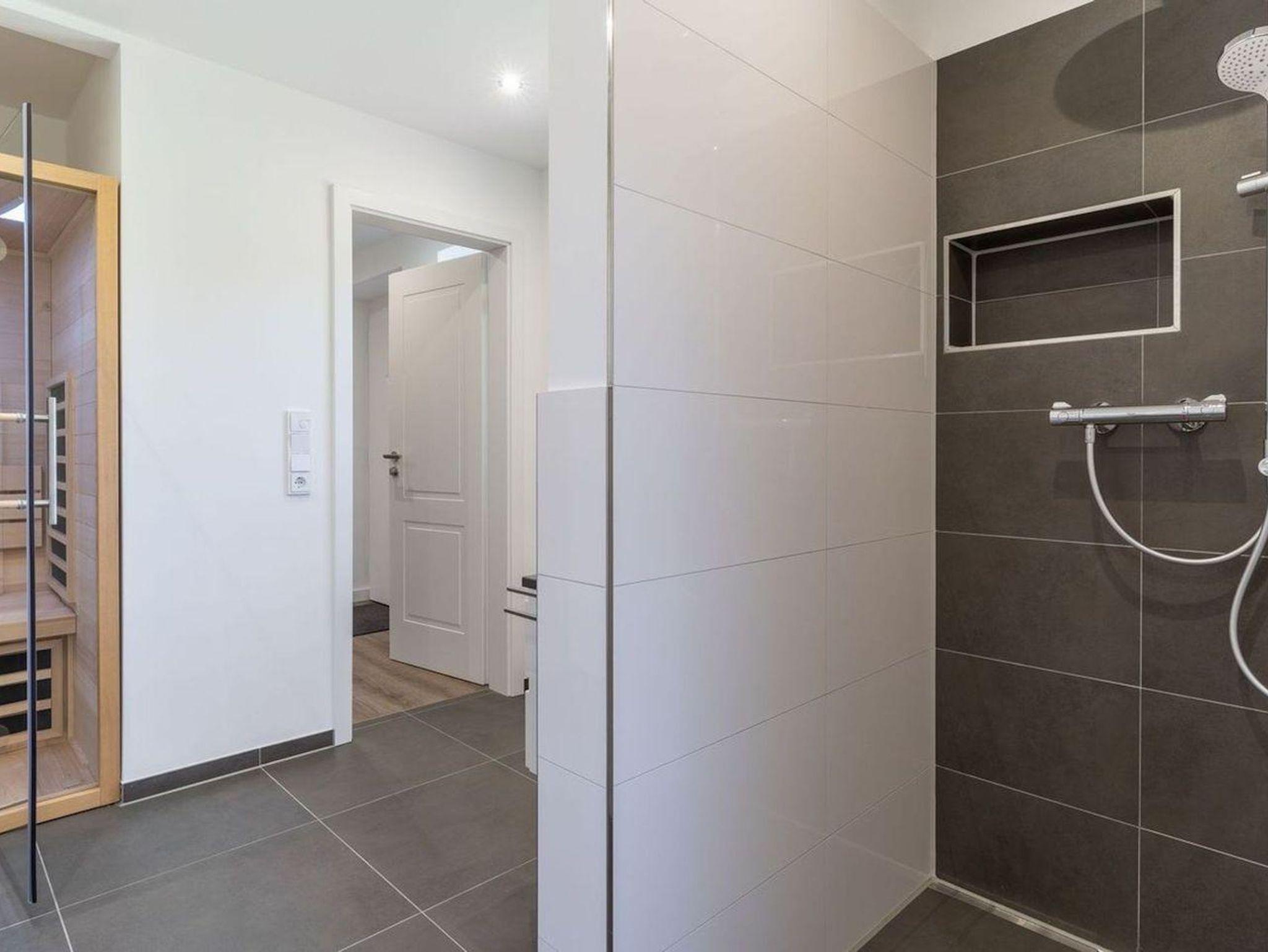 An den Wohnbereich schließen sich ein Flur, ein Duschbad mit einer Infrarot-Wärmekabine sowie ein Abstellraum an.