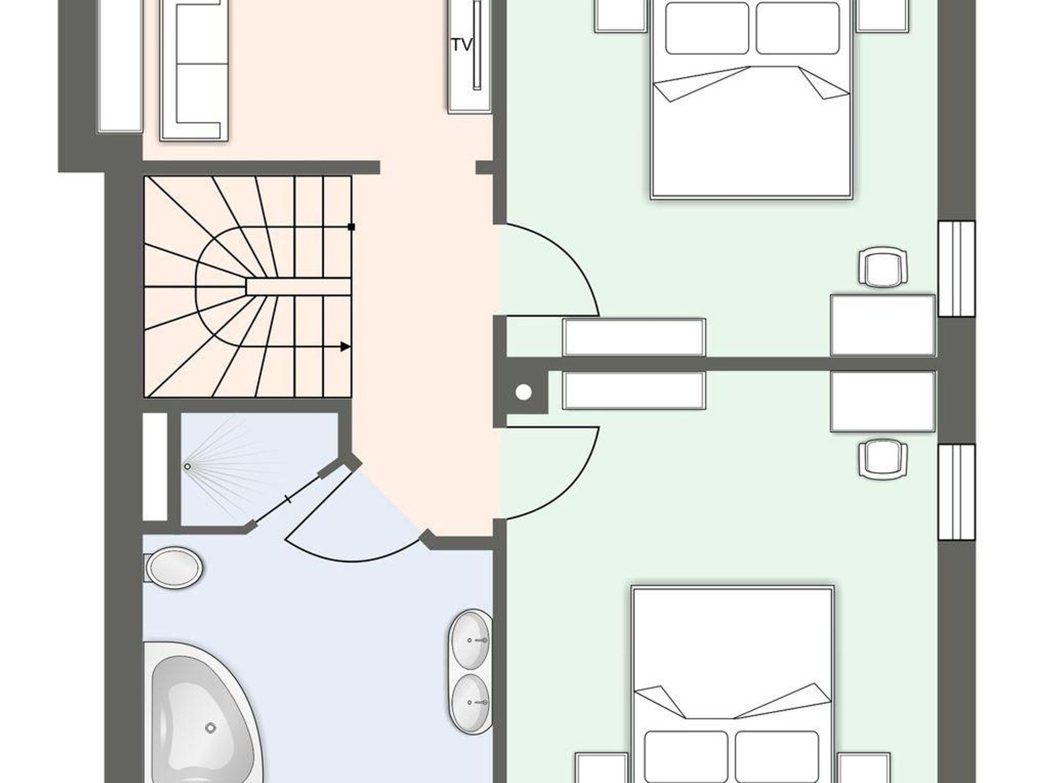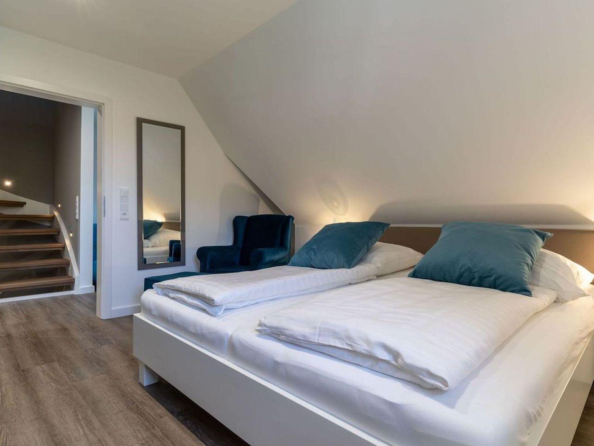Über eine Holztreppe gelangt man in das Obergeschoss. Die beiden Schlafräume verfügen über komfortable Doppelbetten (1,80 × 2 m), Kleiderschränke gewähren Ihnen hinreichend Ablageflächen.