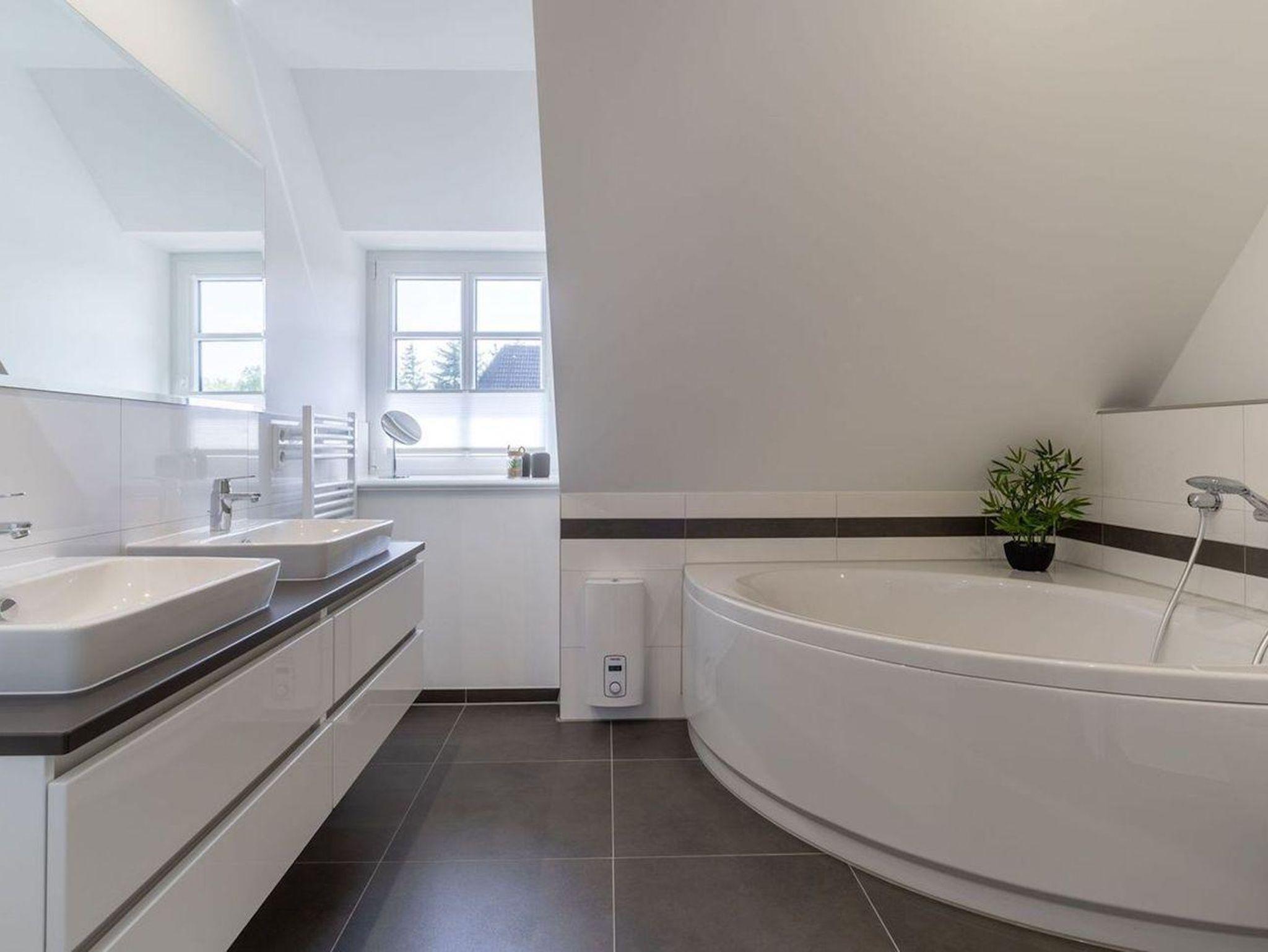 Ein weiteres Badezimmer mit einer Badewanne, einer Dusche und zwei einzelnen Waschbecken runden das hochwertige Hauskonzept ab und lassen keine Wünsche offen.