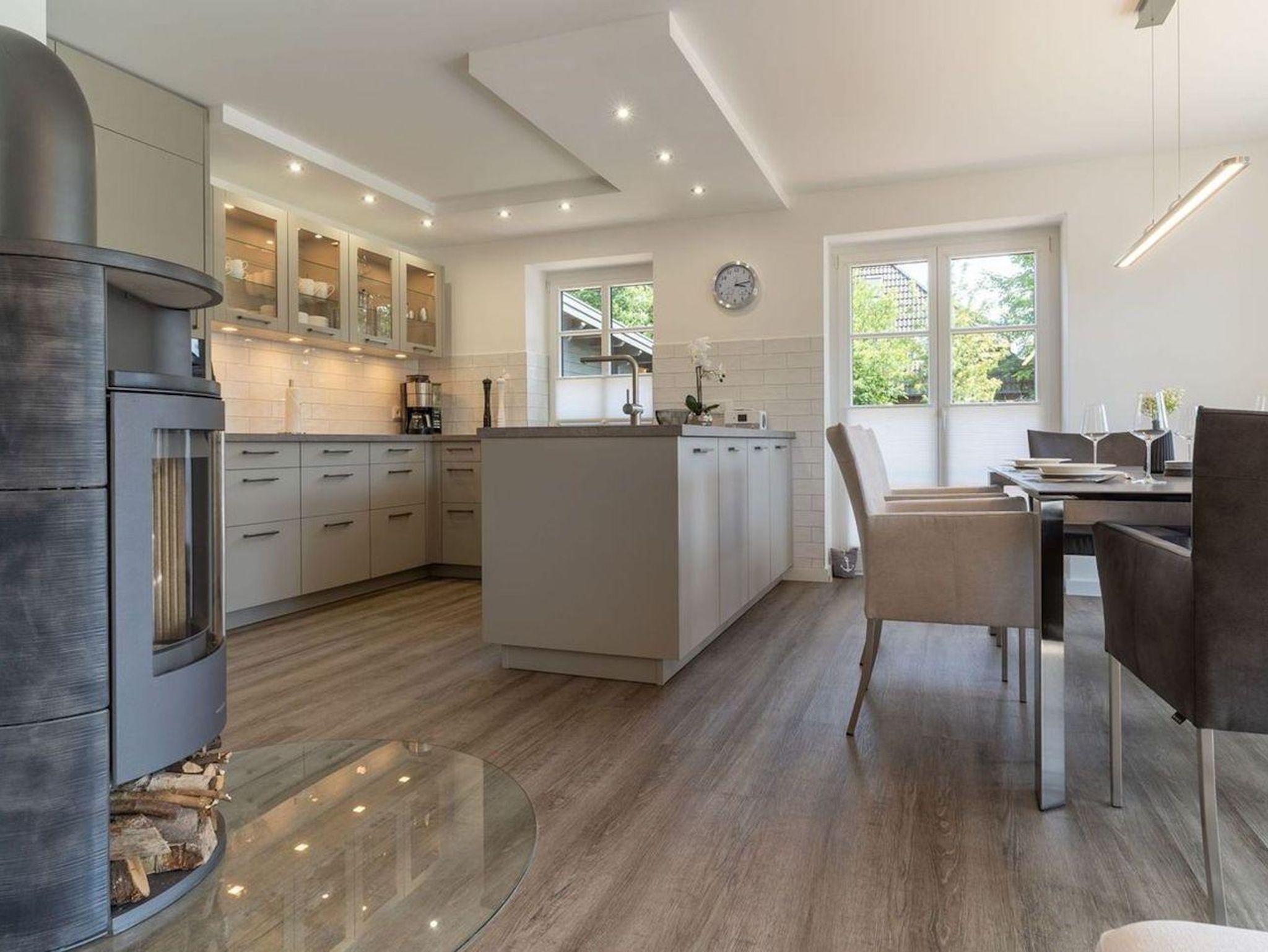 Im Erdgeschoss erwartet Sie ein lichtdurchflutetes Wohnzimmer mit einem Kamin, einer offenen Küche sowie einem integrierten Esszimmer mit hochwertigen Möbeln. Die Küche verfügt über hochwertige Elektrogeräte und genügend Platz zum gemeinsamen Kochen.