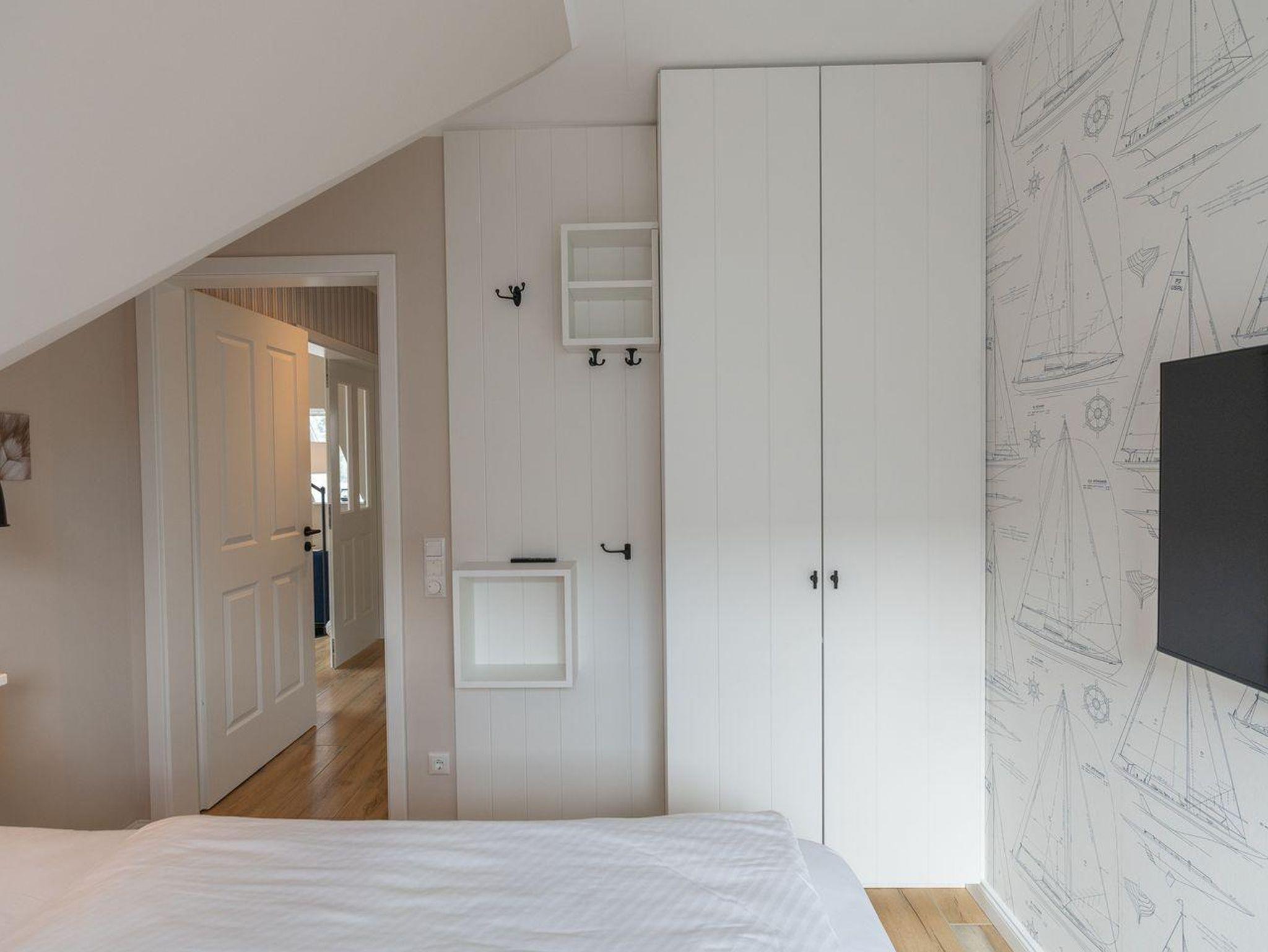 Ihre wunderschöne Ferienwohnung im Obergeschoss mit einer Fläche von ca. 50 qm empfängt Sie morgens mit der wärmenden Sonne und lädt ein, das Frühstück auf der separaten Terrasse im Garten zu genießen. Vom Französischen Balkon aus haben Sie einen Blick auf den Deich und können direkt den Strand von St. Peter-Ording spüren.
