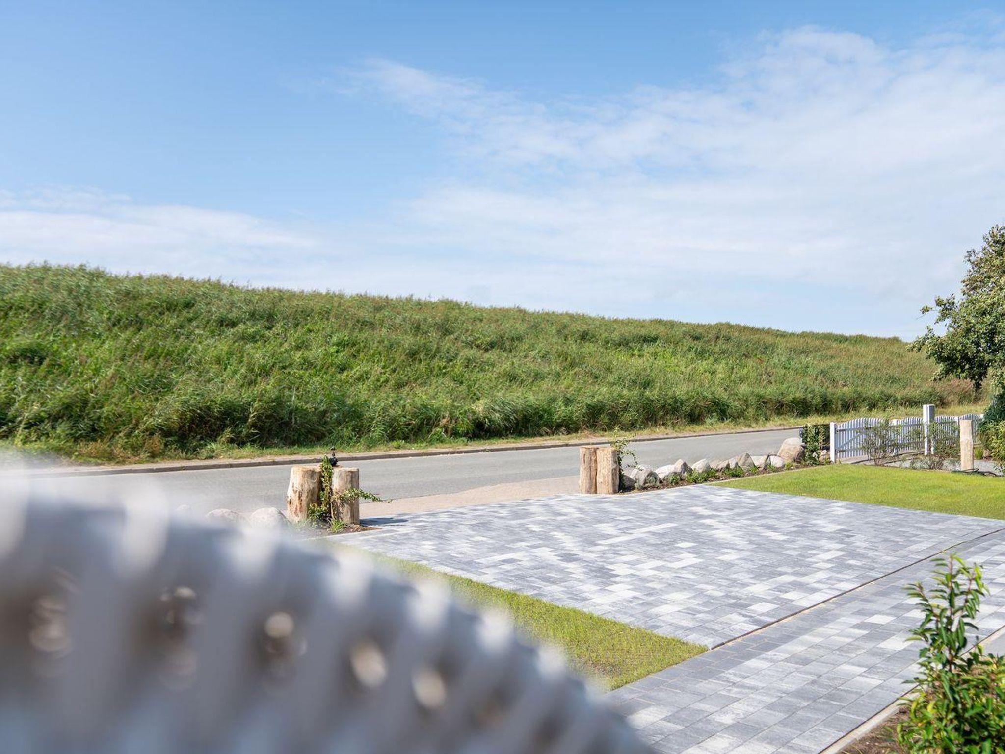 Helle Ferienwohnung in St. Peter-Ording mit Terrasse, Blick auf den Deich und Nähe zum Strand.