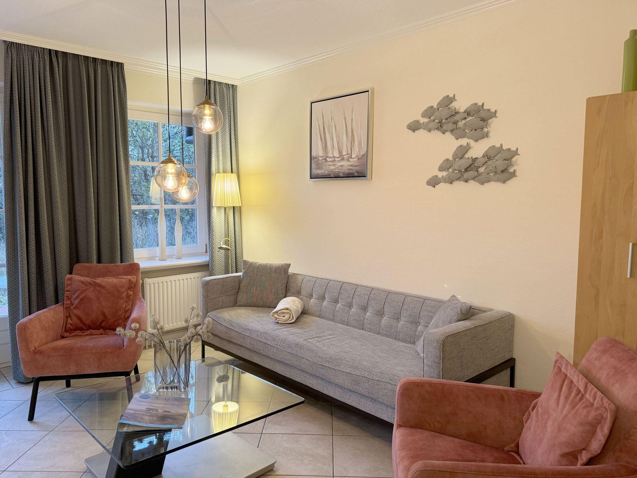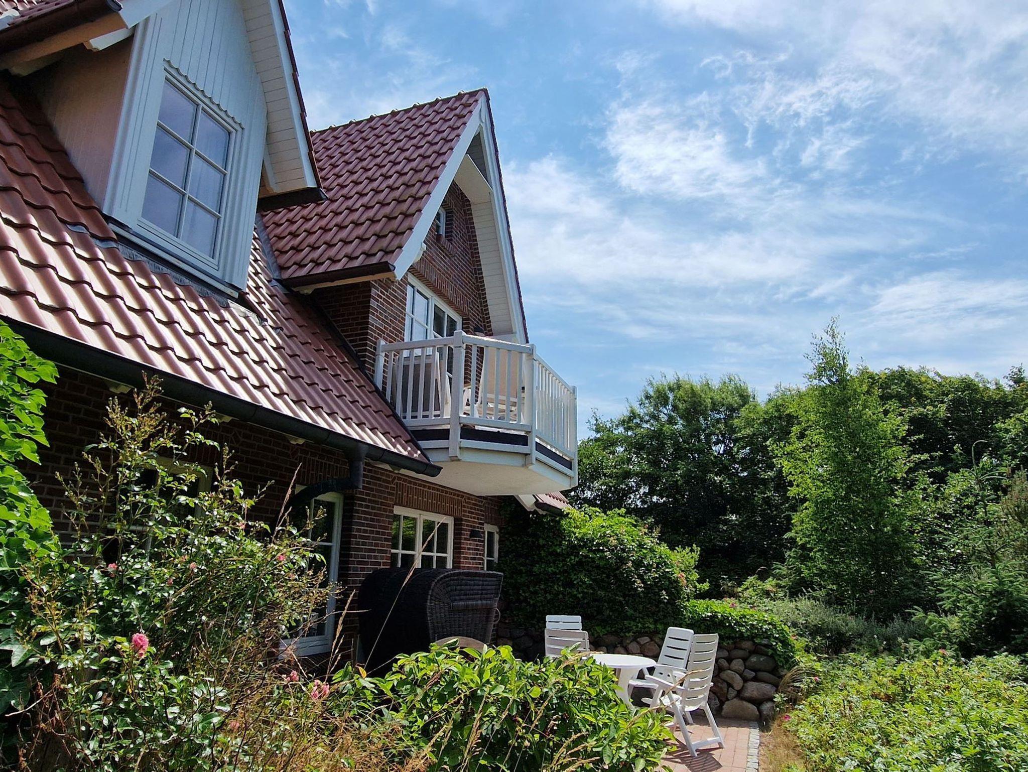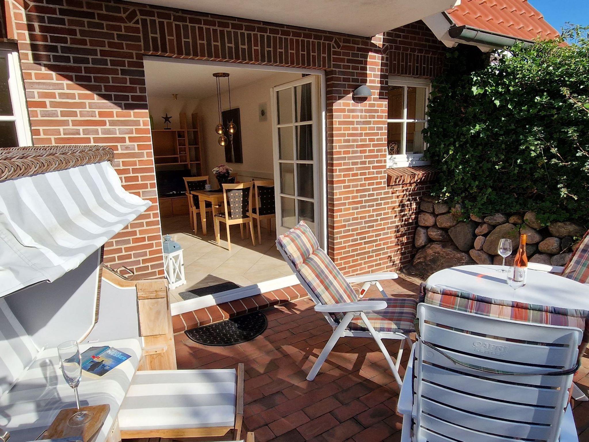 Die 75 qm große Ferienwohnung ist für 4 Pers. geplant und teilt sich wie folgt auf: Eingangsbereich; Eingangsdiele mit Garderobe; großzügiger Wohn-Essbereich mit direktem Zugang auf eine große, durch Friesenwälle und Gehölze abgeschirmte Terrasse mit Gartenmöbeln und einem Strandkorb. Zwei Schlafzimmer mit Doppelbetten, zwei Duschbäder/WC. Separate Küche. Im Untergeschoss befindet sich eine Gemeinschaftssauna, Ruheruam, verschiedene Duschen, Fußbäder, Solarium, Fitnessraum, Tischtennis. Im Außenbereich: ein Spielplatz für die Kleinsten, Stellplatz, Fahrradständer
