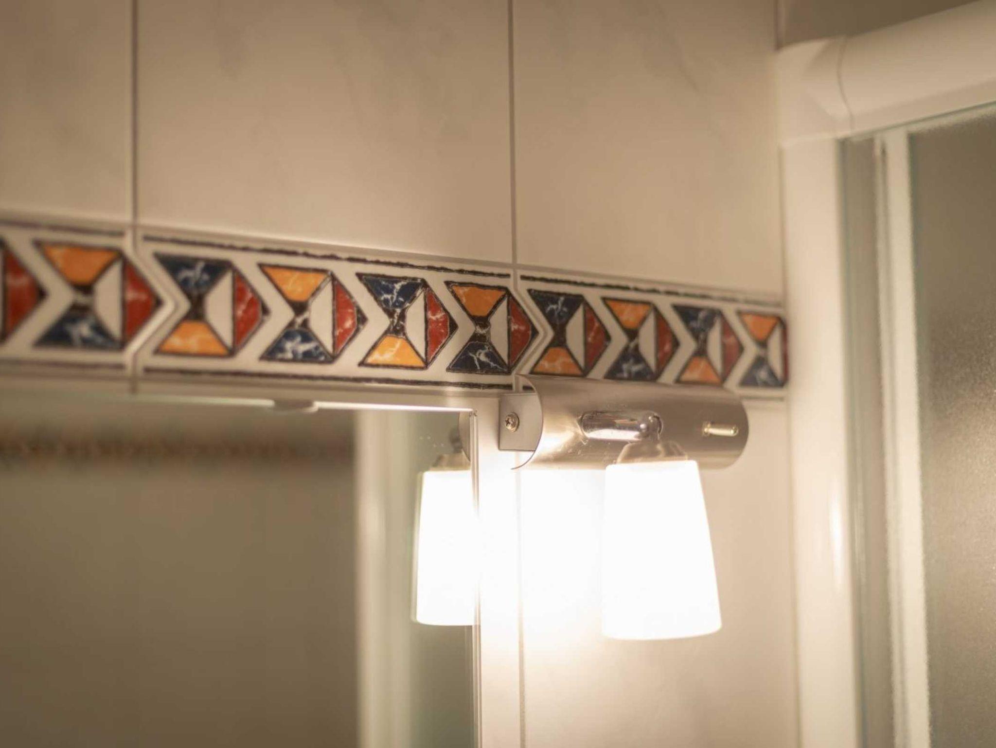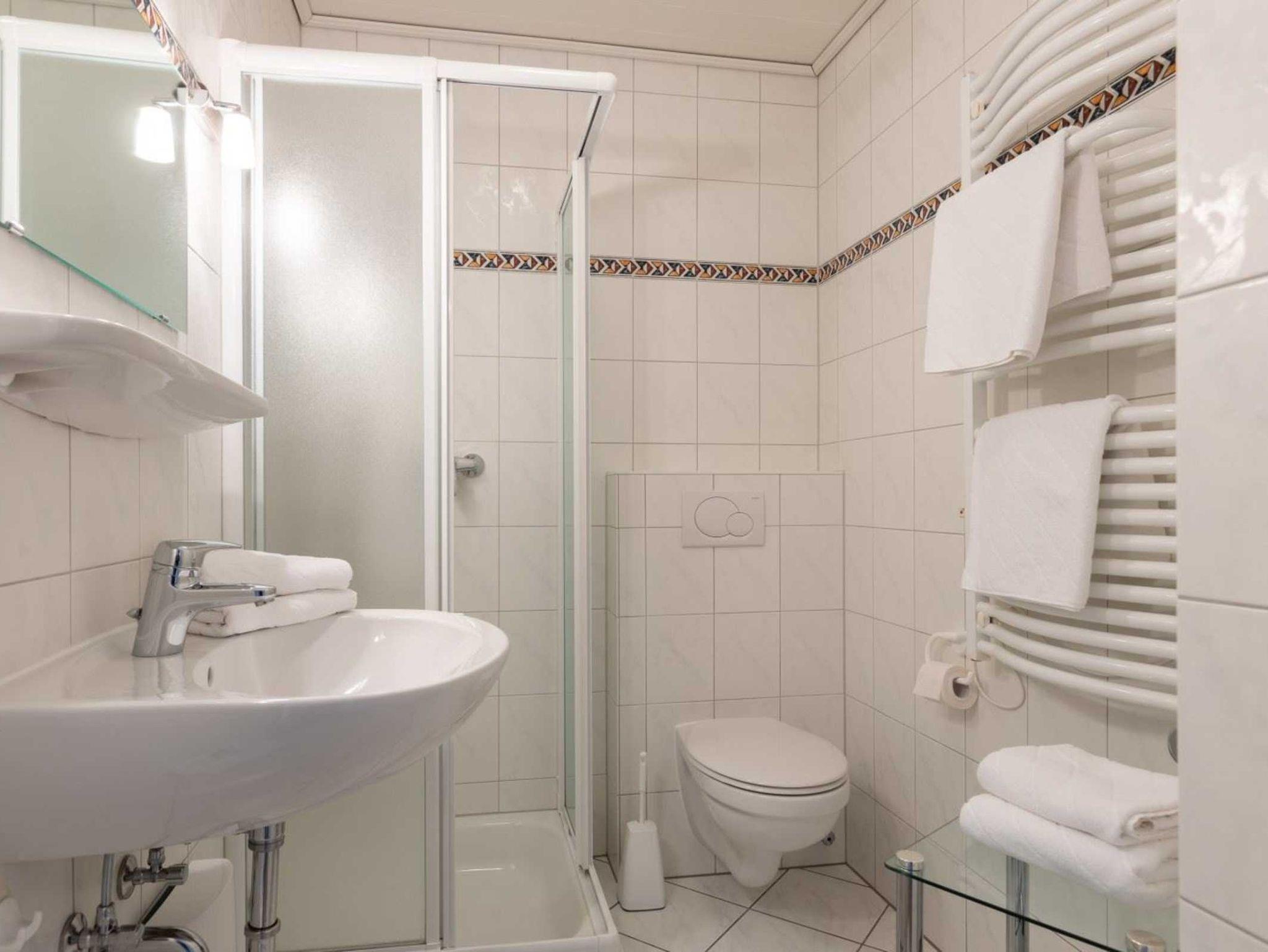 Badezimmer (Duschbad) mit Dusche, WC, Handtuchwärmer und Föhn.