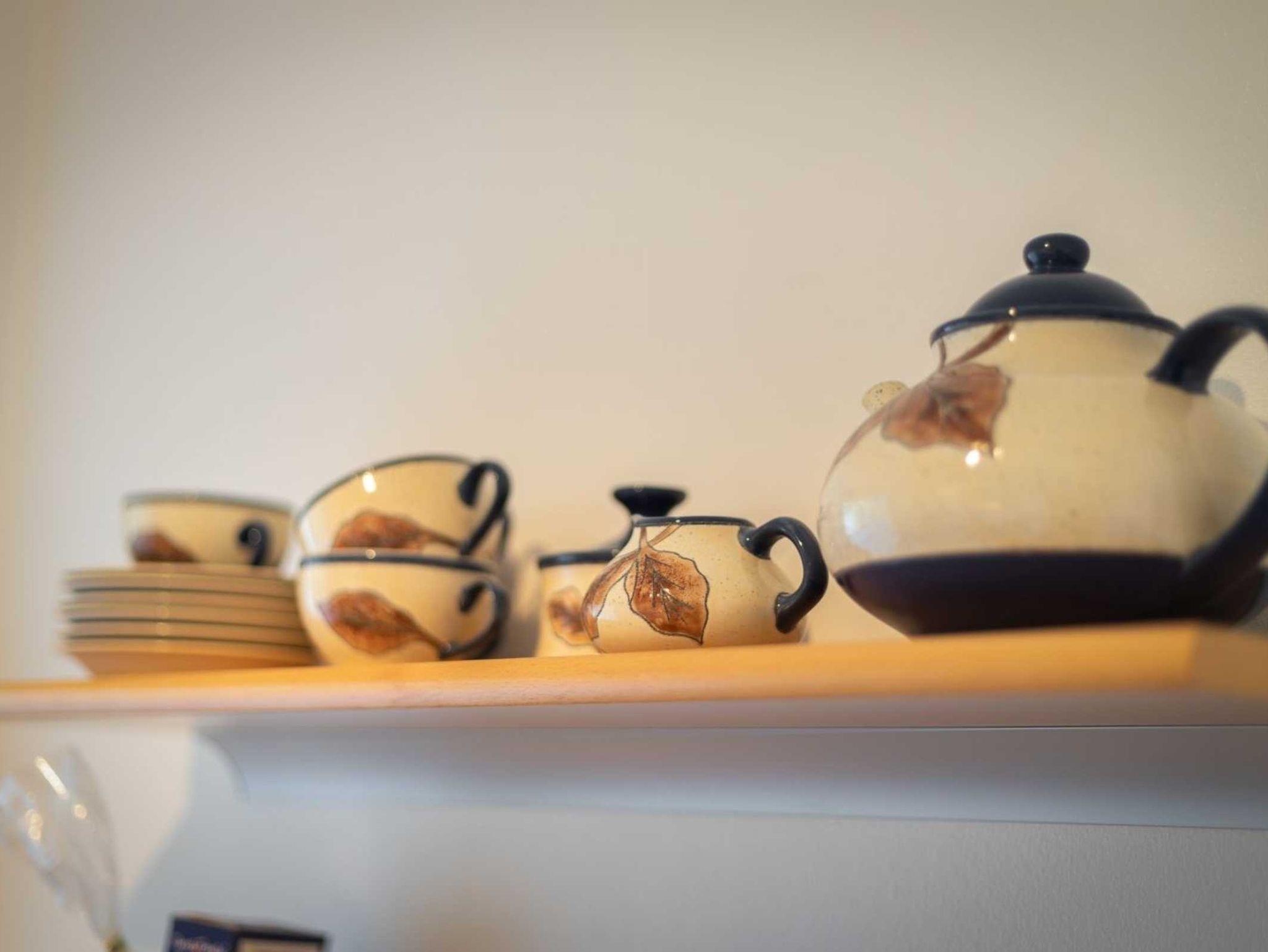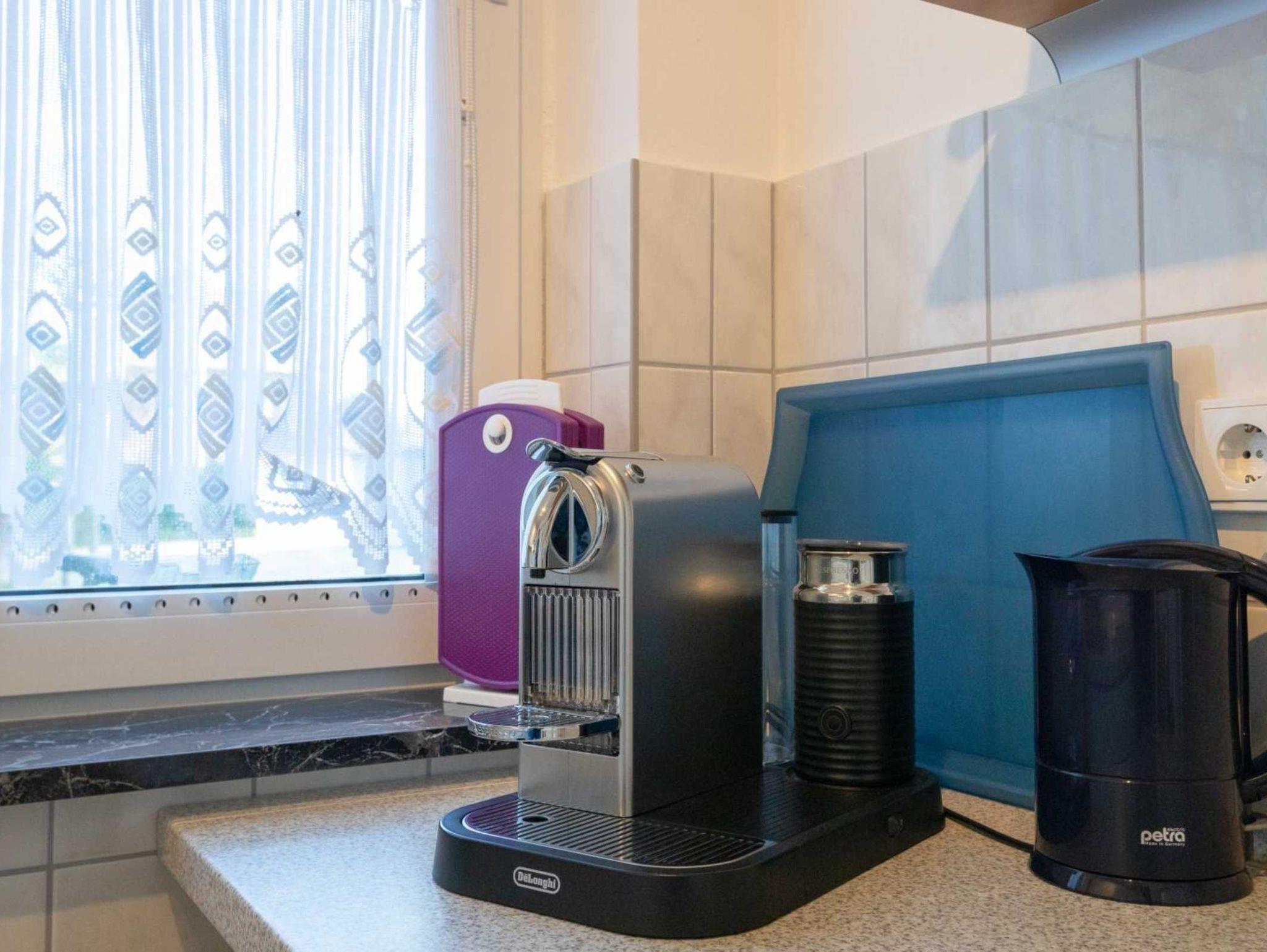 Separate Küche mit Backofen, Geschirrspüler, Kühlschrank mit Gefrierfach und DeLonghi Nespresso Kapsel-Kaffeemaschine.