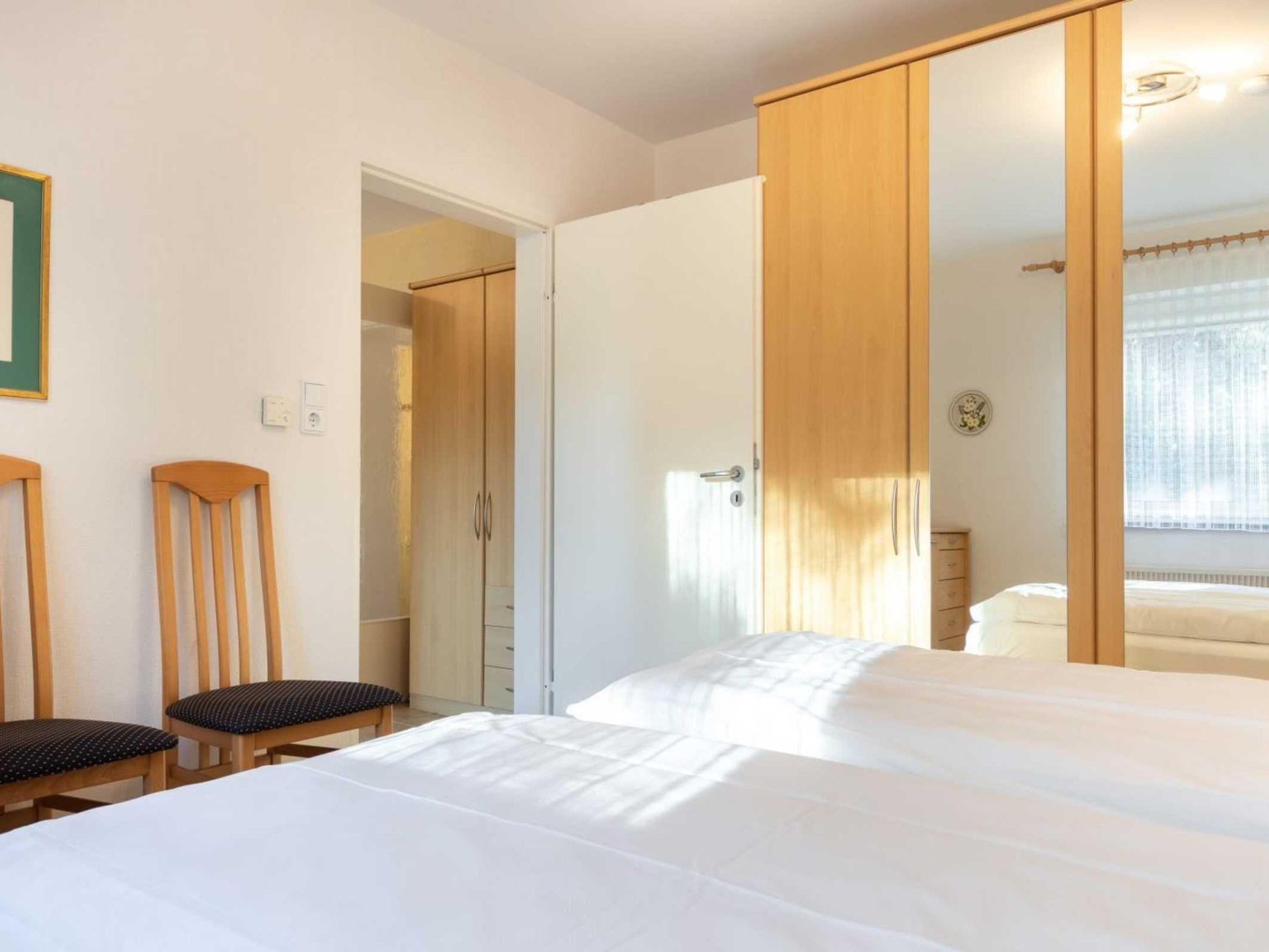 Schlafzimmer mit Doppelbett (2x 90x200cm), Kleiderschrank, Kommode und 2 Stühlen.
