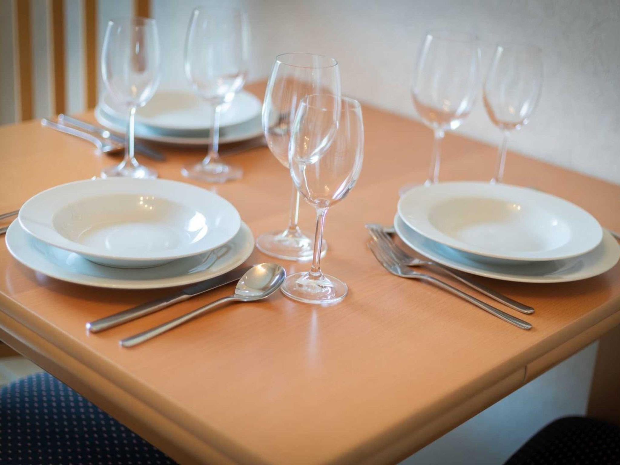 Flur mit Esstisch für 4 Personen und Garderobe im Eingangsbereich. Abstellraum mit Bügelset, Staubsauger und Mikrowelle.