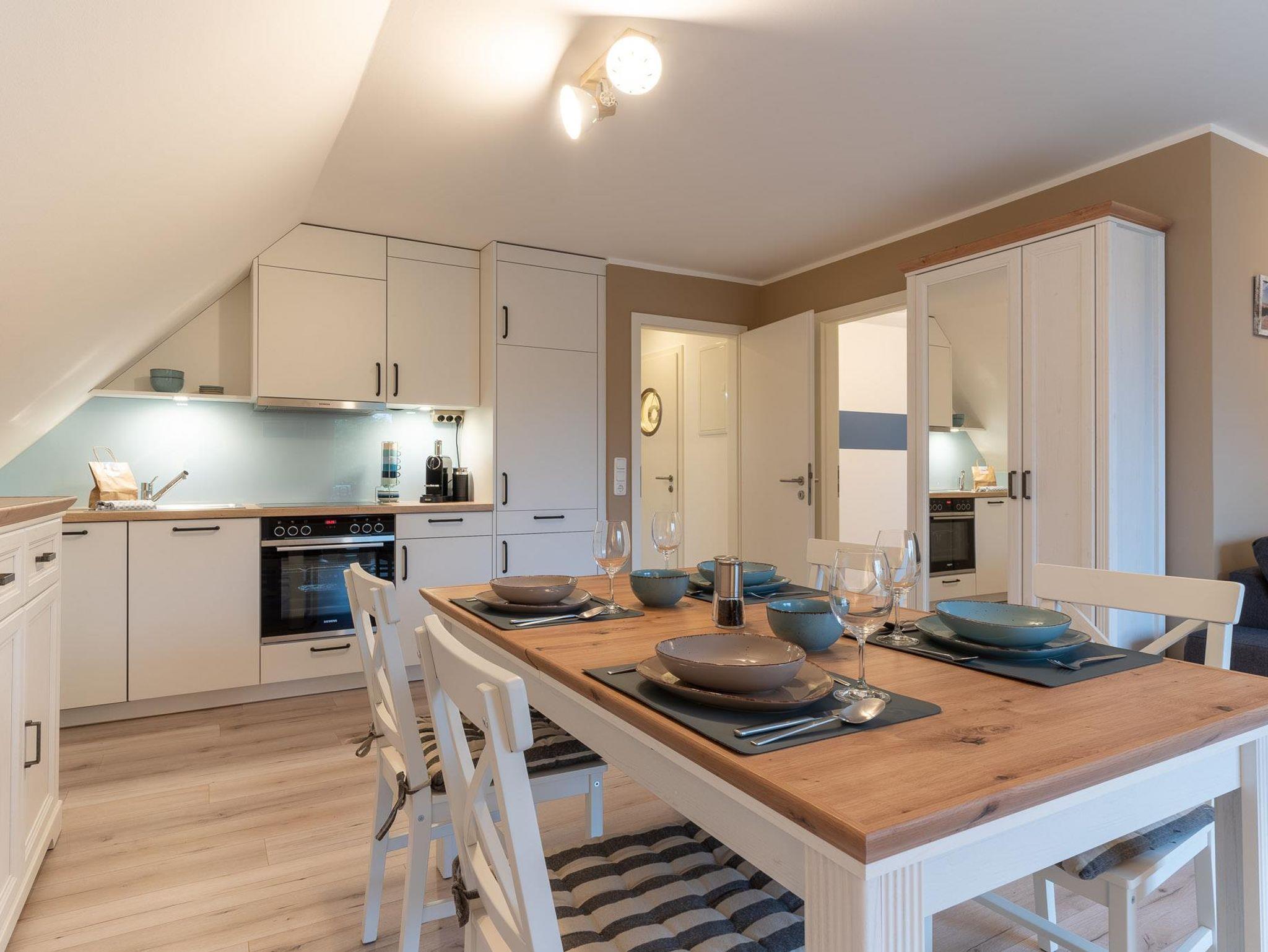 Die Obergeschoss-Ferienwohnung ist frisch renoviert und besticht durch eine geschmackvoll und zeitlose Einrichtung. Hinter der Eingangstür befindet sich direkt auf der linken Seite die großzügige Wohn-Essküche von der man auch Zugang zum Balkon hat. Ebenfalls geht das 1. Schlafzimmer hiervon ab. Über den Flur gelangt man sowohl in das Duschbad als auch in das 2. Schlafzimmer mit angrenzender Waschküche.