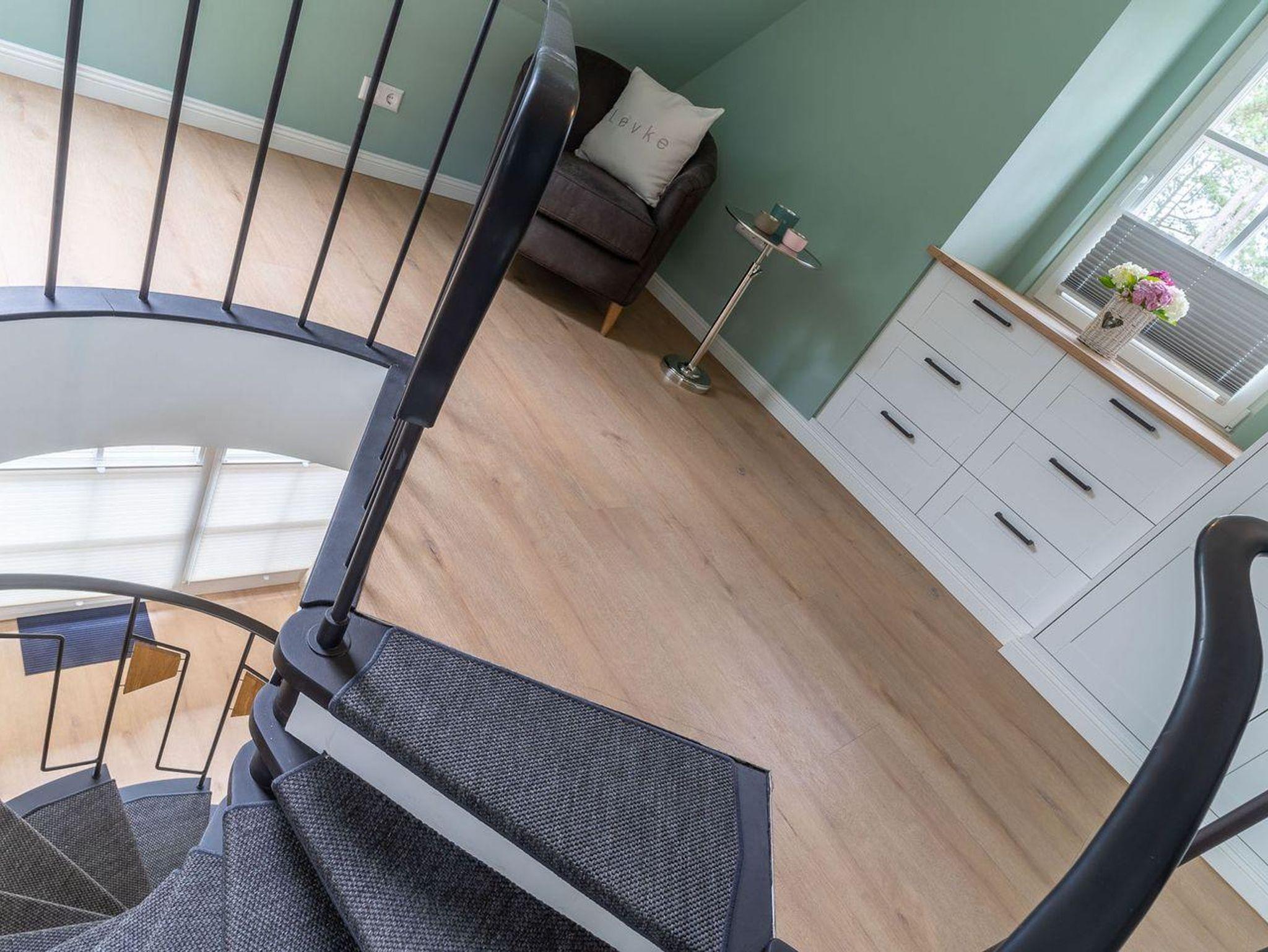 Über eine Wendeltreppe aus dem Wohnraum gelangt man in das Obergeschoss. Hier befindet sich das gemütliche Schlafzimmer, mit einem Doppelbett.