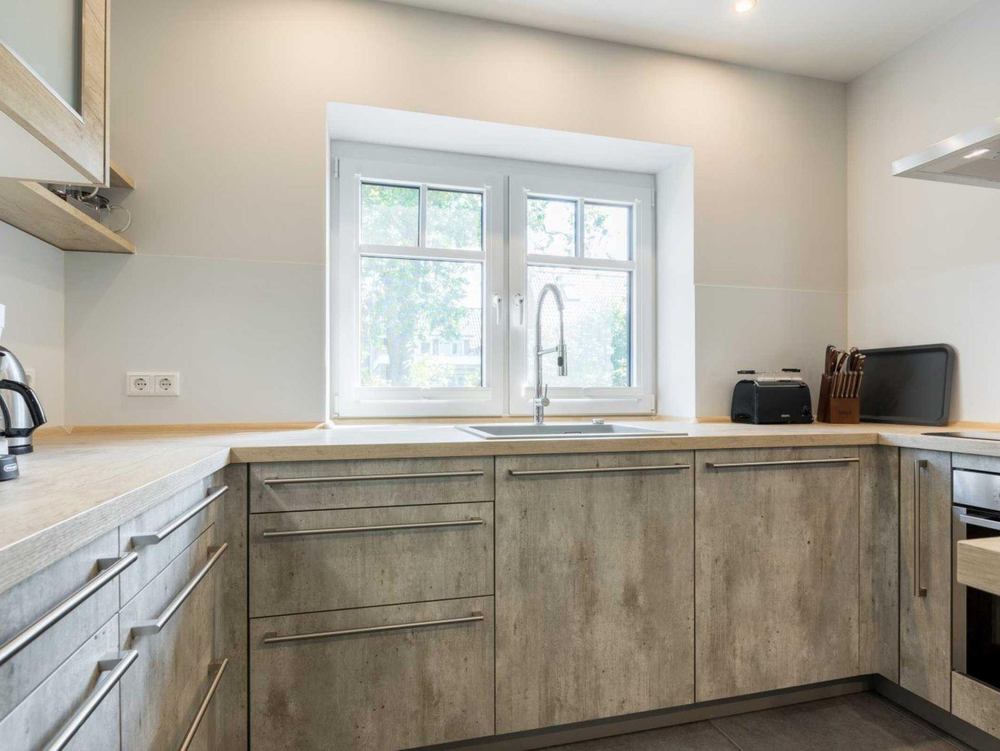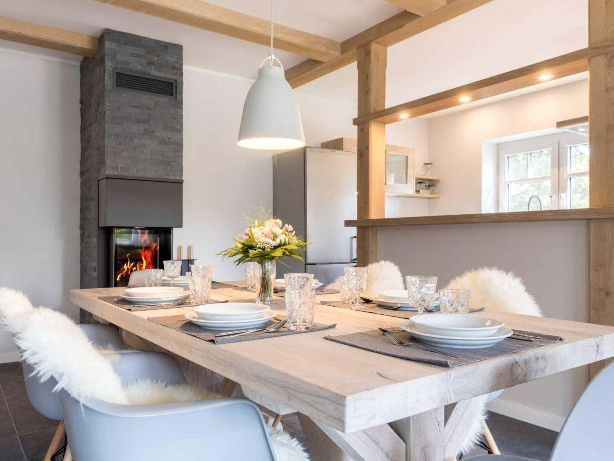 Wohnzimmer mit großem Ecksofa, Sesseln, SMART-TV (Sat), YAMAHA-Bluetooth-Soundsystem, gemütlichem Kaminofen, Esstisch für 6 Personen und Austritt zur schönen, möblierten Gartenterrasse nach Südwesten mit Strandkorb. Moderne, offene Küche mit Backofen, Mikrowelle, Geschirrspüler, Induktionskochfeld und Kühl-Gefrier-Kombination.