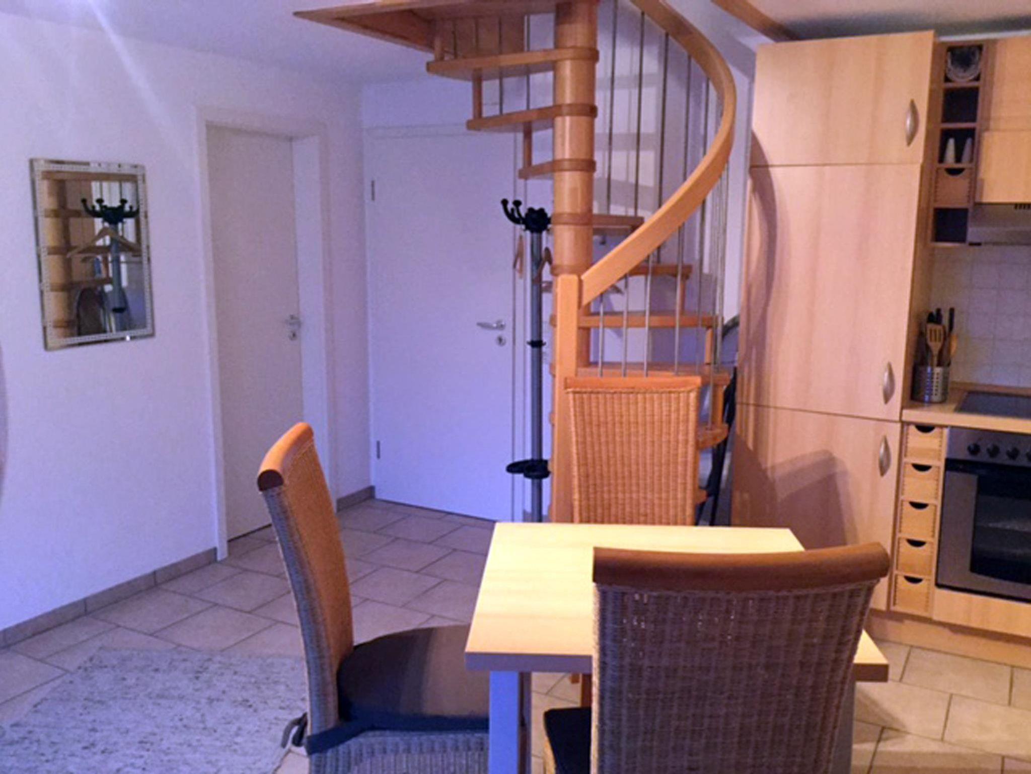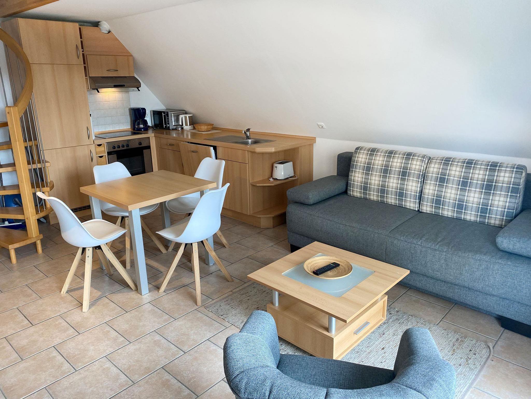 Über die Wendeltreppe ins Schlafzimmer. Die moderne 2-Zimmer-Ferienwohnung Möweninsel Nr. 04 liegt im 1. OG und DG. Die 2 Einzelbetten unterm Dach und das Boxspringbett im Wohnraum versprechen eine angenehme Nachtruhe. Auf dem Süd-Ost-Balkon können Sie würzige Nordseeluft schnuppern. Das geschmackvolle Bad und die moderne Küchenzeile mit Cerankochfeld, Backofen und Spülmaschine machen den Urlaub sehr angenehm.