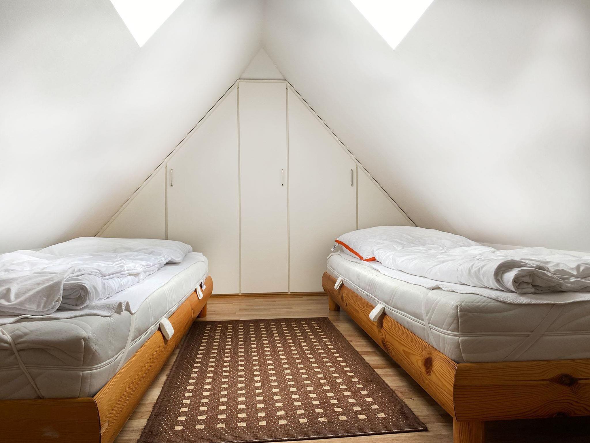 Schlafzimmer: 2 Einzelbetten, Einbaukleiderschrank, Bodenlampe, Klappstuhl, Wendeltreppe nach unten