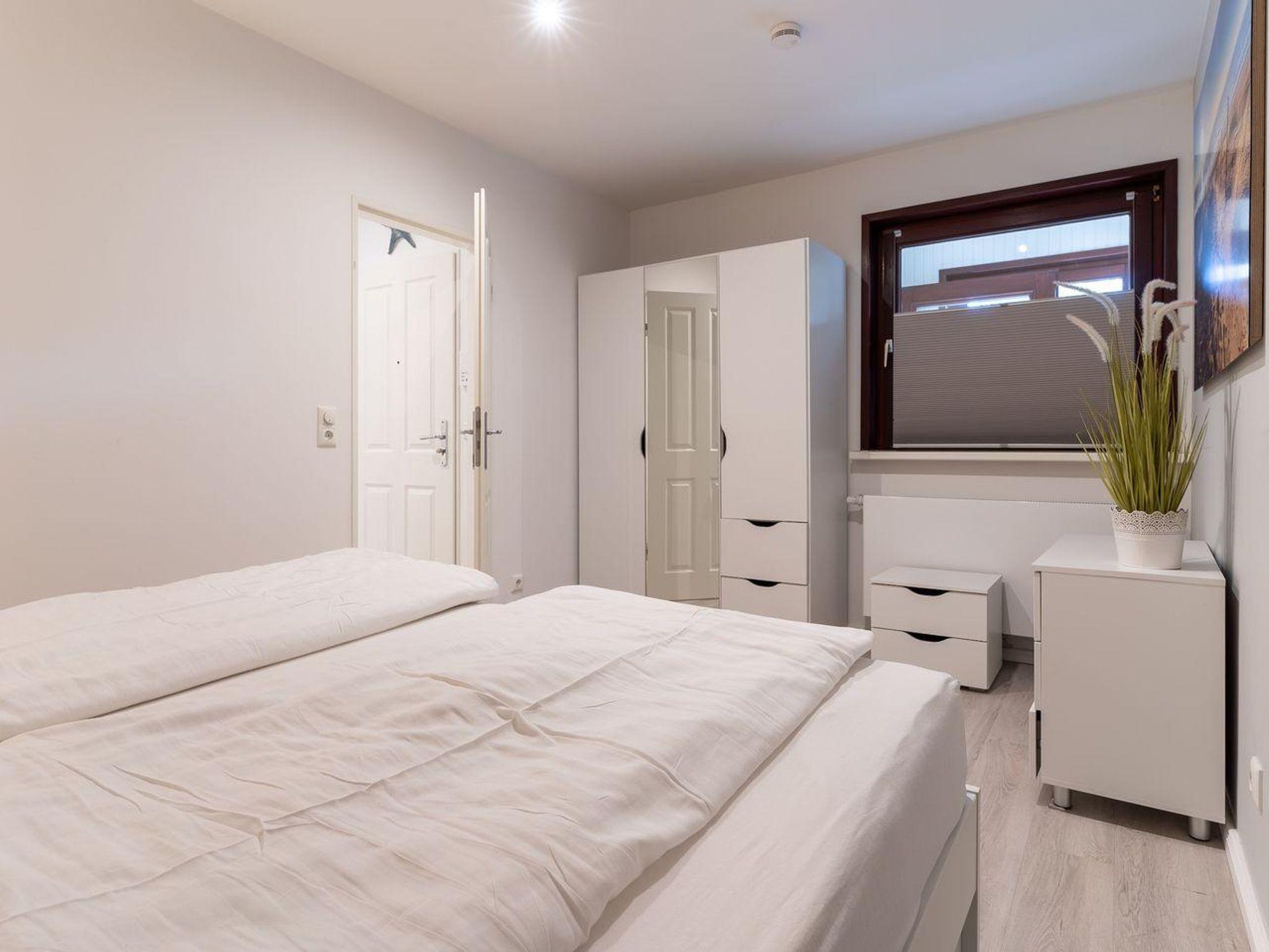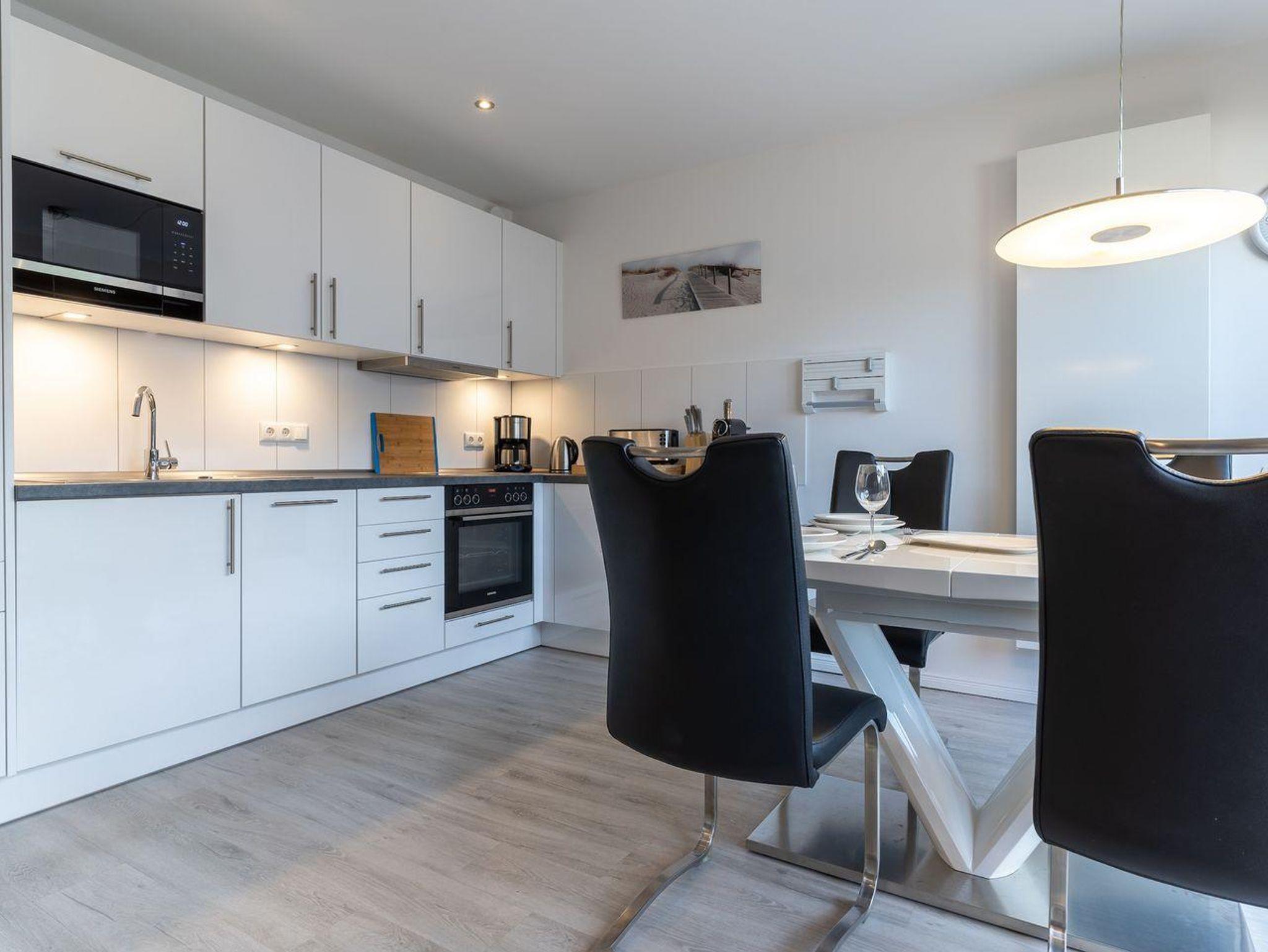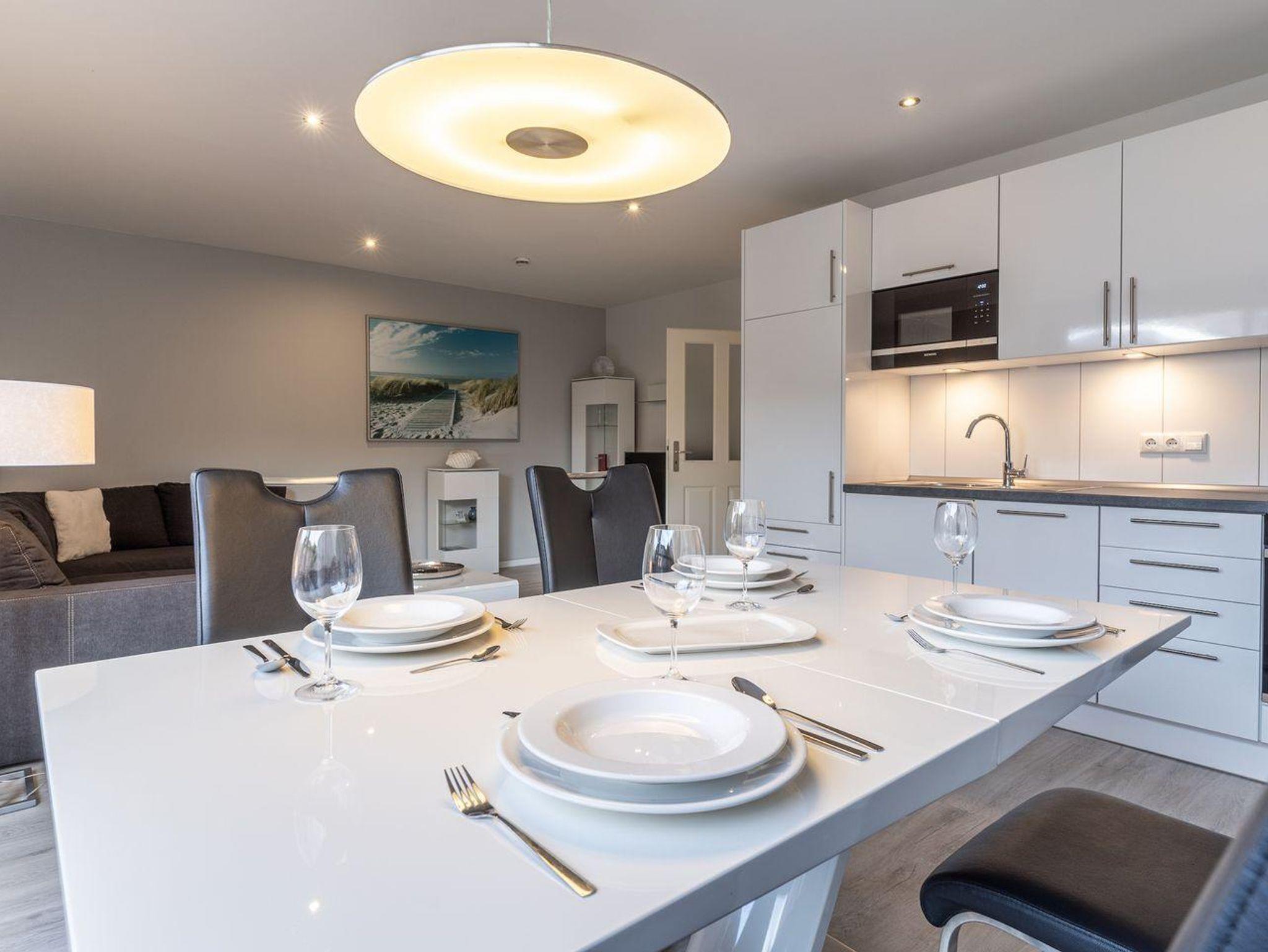 Die 55m² große Ferienwohnung, welche im Jahr 2020 vollständig saniert wurde, liegt im Obergeschoss und bietet bis zu 4 Personen Platz für einen unvergesslichen Urlaub in St. Peter-Ording. Durch die Lage und Ausstattung ist die Ferienwohnung besonders familienfreundlich, Kinder sind hier herzlich willkommen. Die Ferienwohnung verfügt über einen nach Südwesten hin ausgerichteten, vollständig möblierten Balkon, der Abendsonne für ein herrliches Beisammensein bietet. Auch Urlaub mit Hund ist hier möglich, ein Hund begleitet die Familie in den Urlaub. Das modern eingerichtete Wohnzimmer wirkt durch die große Fensterfront und den Übergang zum Balkon wunderbar hell und freundlich. Zur Ausstattung gehören hier eine urgemütliche Couch und der große Esstisch, an dem die ganze Familie Platz findet. Die komfortable Couch lässt sich zum komfortablen Schlafplatz für 2 Personen umfunktionieren. Für die multimediale Unterhaltung sorgen ein großer Flachbild-TV, Radio mit Bluetooth und kostenfreies W-LAN. Für die Versorgung im Urlaub sorgt die vollumfassend ausgestattete, in den Raum integrierte Küche der Ferienwohnung. Hier stehen neben Cerankochfeld und Backofen noch Kühlschrank, Mikrowelle und Nespresso-Maschine bereit. Orangenpresse und Milchaufschäumer gehören ebenfalls zum Inventar. Im hellen, einladenden Schlafzimmer steht ein komfortables 180x200cm Doppelbett zur Verfügung. Zur edlen Ferienwohnung gehören weiterhin Duschbad mit WC und Haartrockner. Alle Fenster der Ferienwohnung sind mit Fliegenschutzgitter und Verdunklungsplissees ausgestattet. Die große Fensterfront ist mit elektrischem Außenrollo ausgestattet, um Licht und Sichtschutz nach Belieben regulieren zu können. Feriengästen steht kostenlos ein Waschtrockner zur Verfügung.