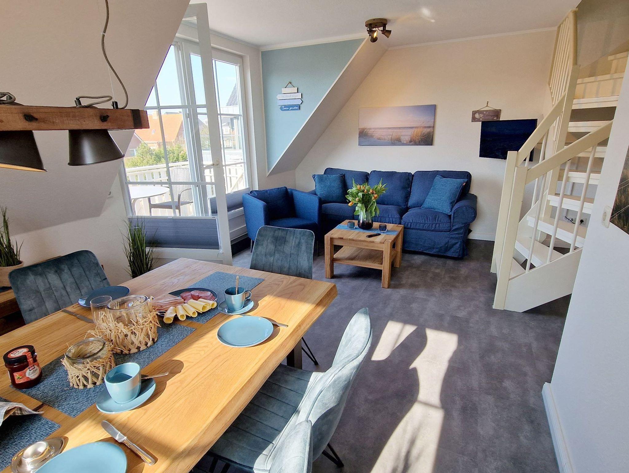 Moderne Einrichtung: Die Küchenzeile ist harmonisch im Wohn-Essbereich integriert und bietet direkten Zugang zum sonnigen Balkon, sodass Sie während Ihrer Mahlzeiten die frische Luft und den Blick auf den Nordseedeich genießen können.