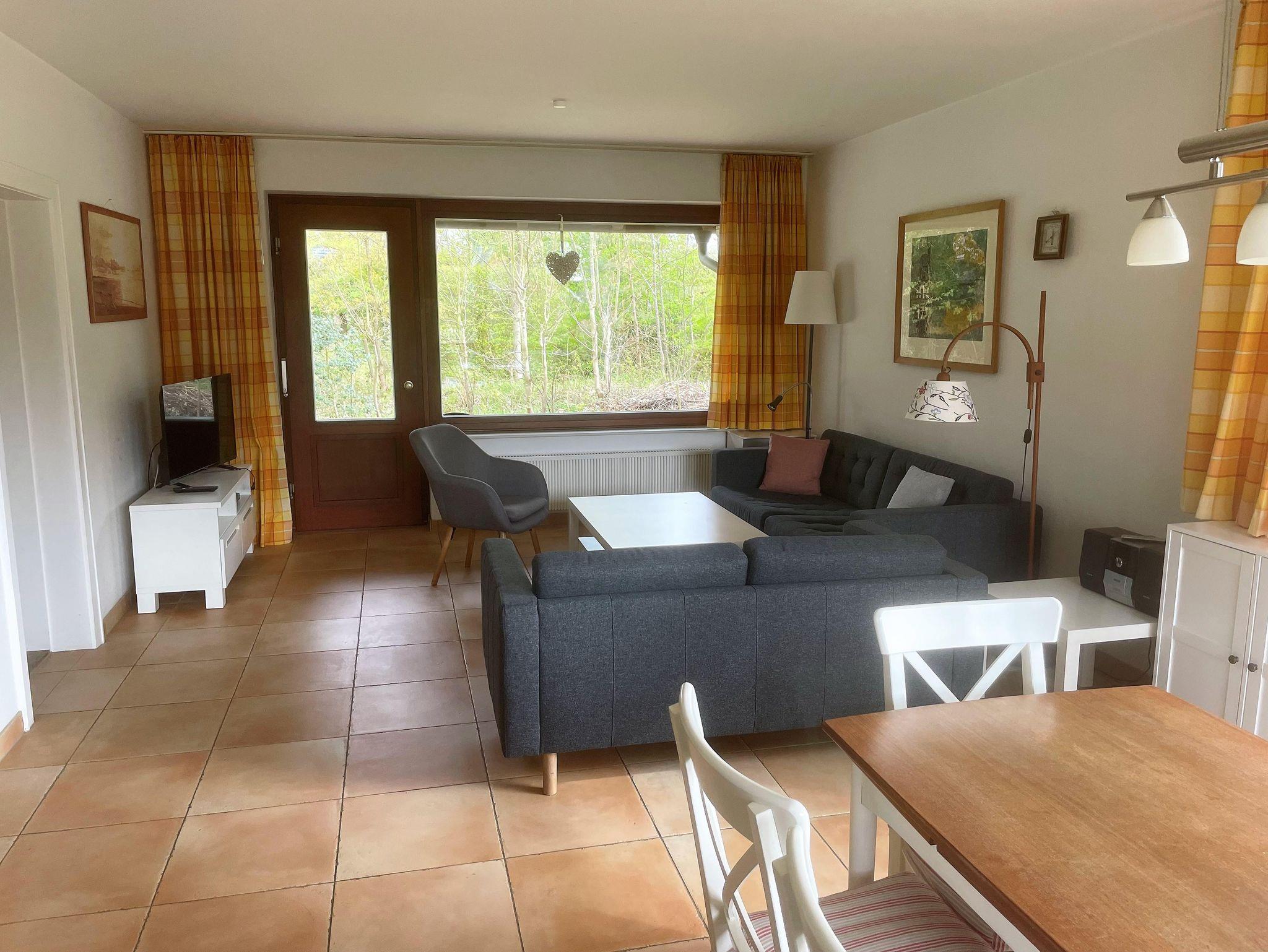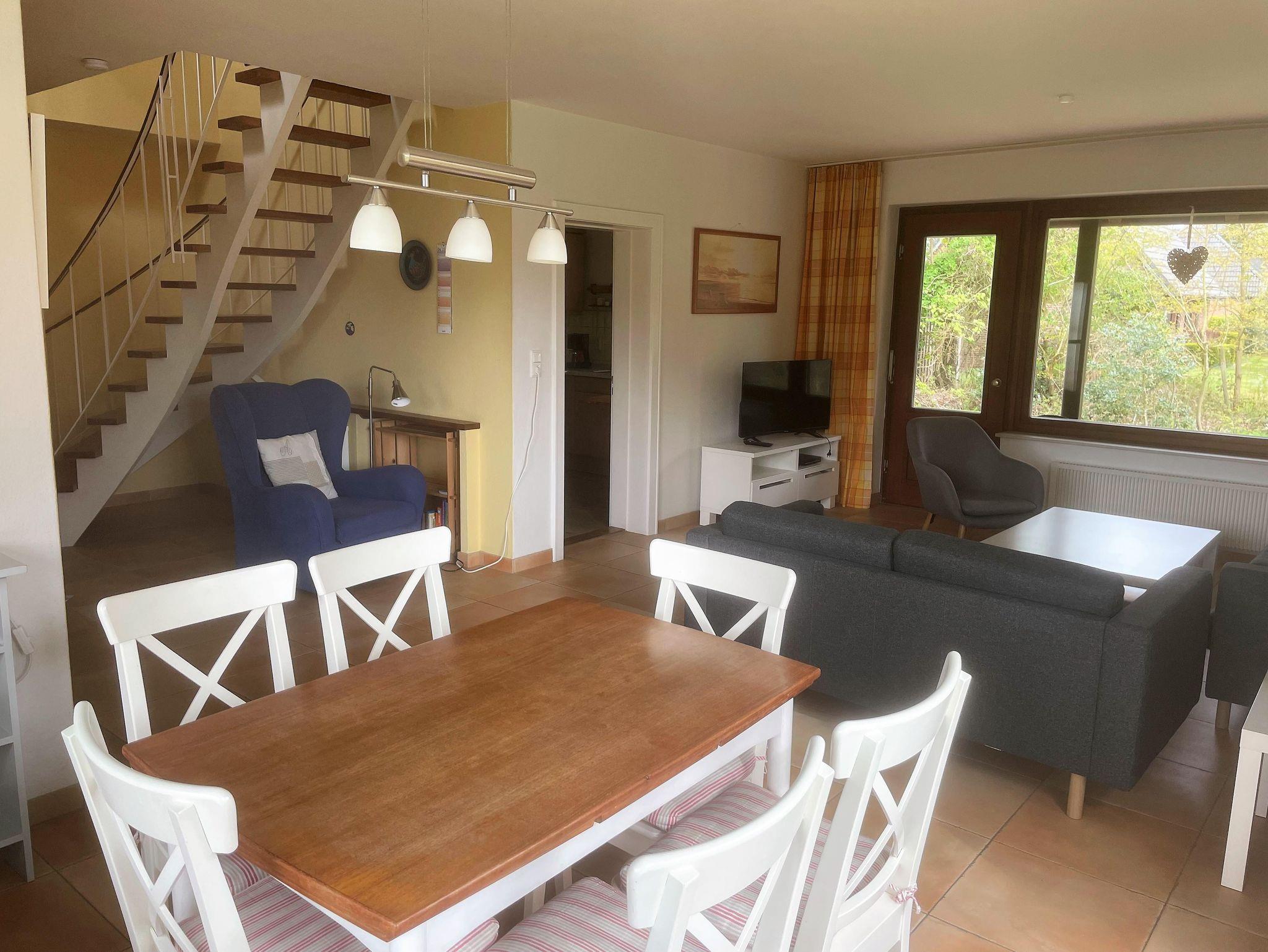 Schön, hell blicken Sie ins Wohnzimmer mit SAT Flachbildschirm, DVD-Player und Hifi Anlage,sowie einer Essecke.