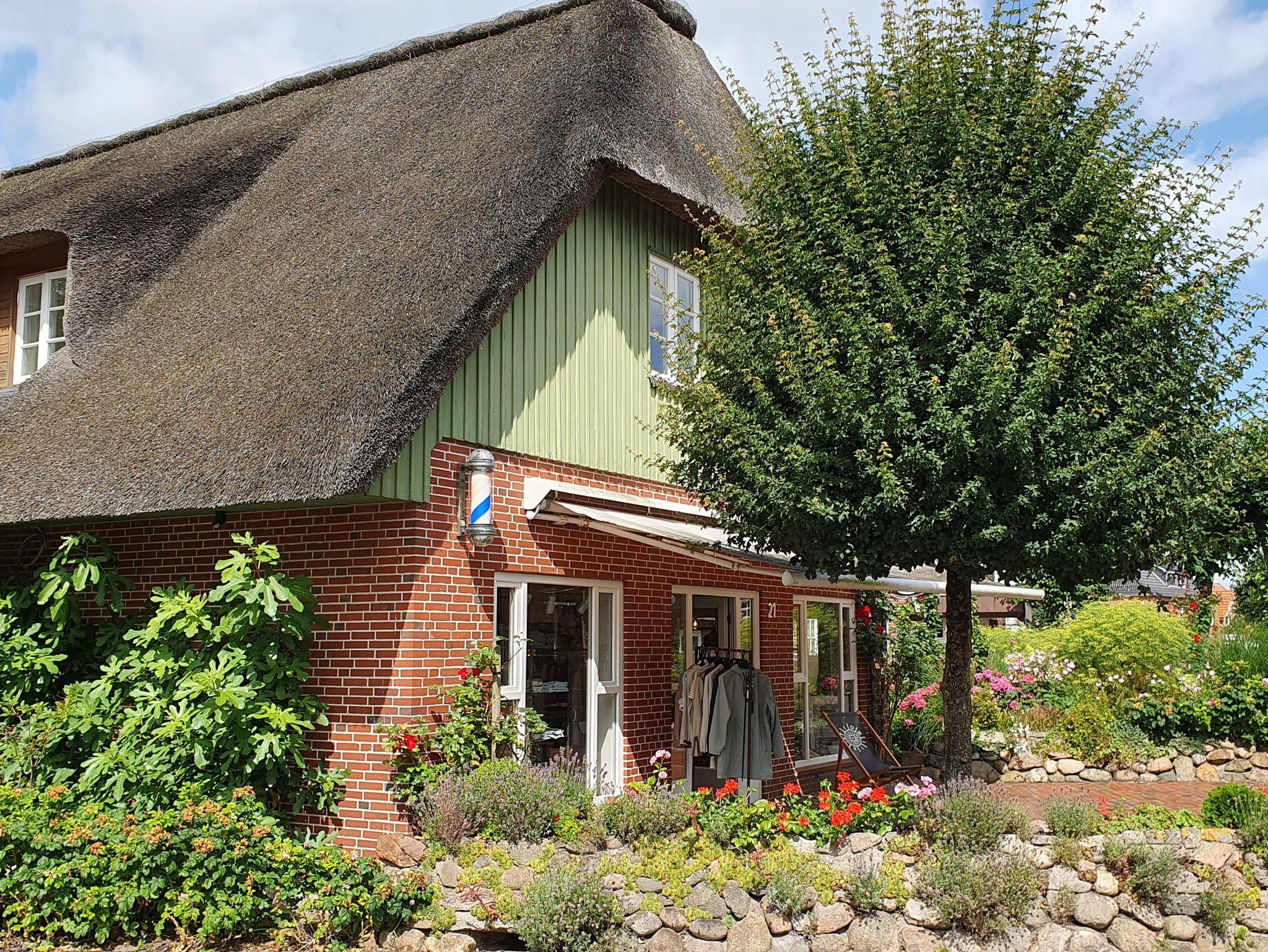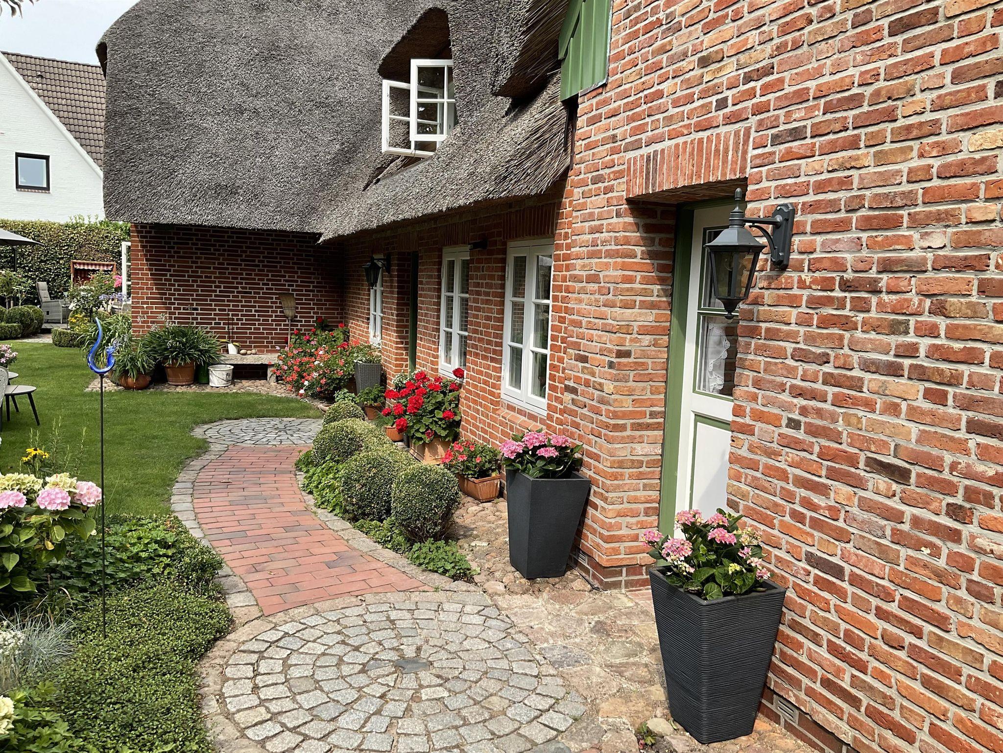 Charmantes Reetdachhaus im historischen St. Peter-Ording mit Garten, Terrasse und Strandkorb für erholsame Urlaubstage.