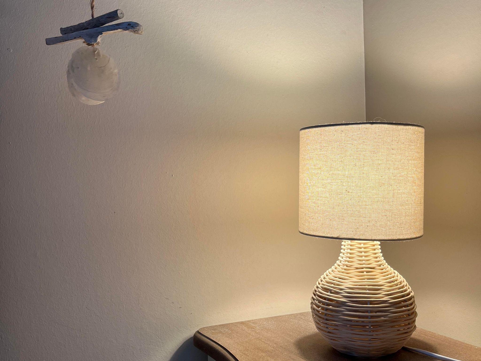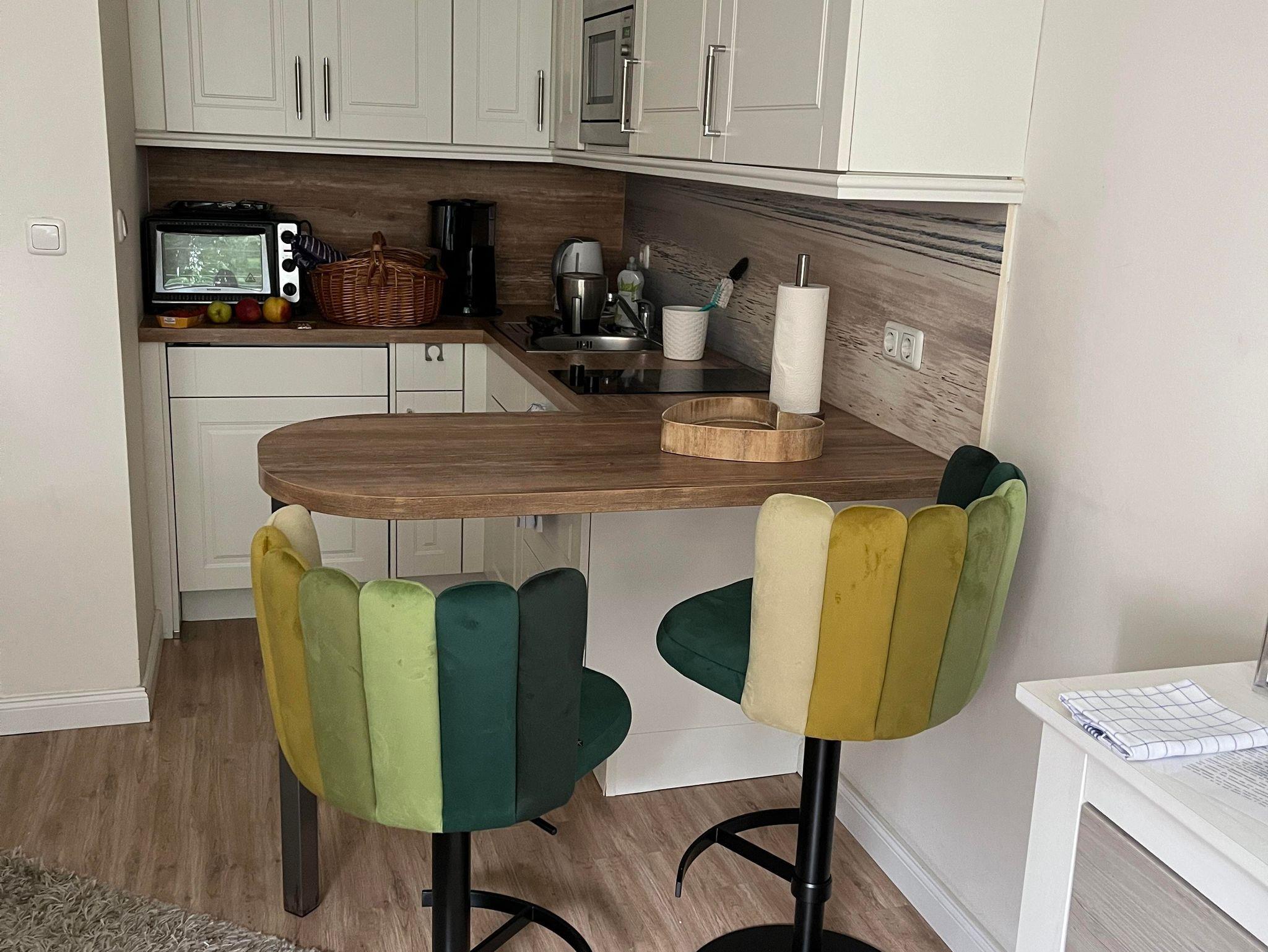 Zur modern-gehobenen Ausstattung gehören ein hochwertiges Boxspringbett mit 180 cm breiter Liegefläche, 2x 2 Sitzhocker, ein 1,50 m breiter Kleiderschrank, 1 Nachtschrank, ein Flat-TV. In der Küche gibt es einen Kühlschrank mit kleinem Gefrierfach, Mikrowelle, 2 Herdplatten (Ceranfeld), Kaffeemaschine, Wasserkocher, Toaster, Geschirr, Besteck, Gläser und Töpfe. Im Bad ist ein Fön vorhanden.