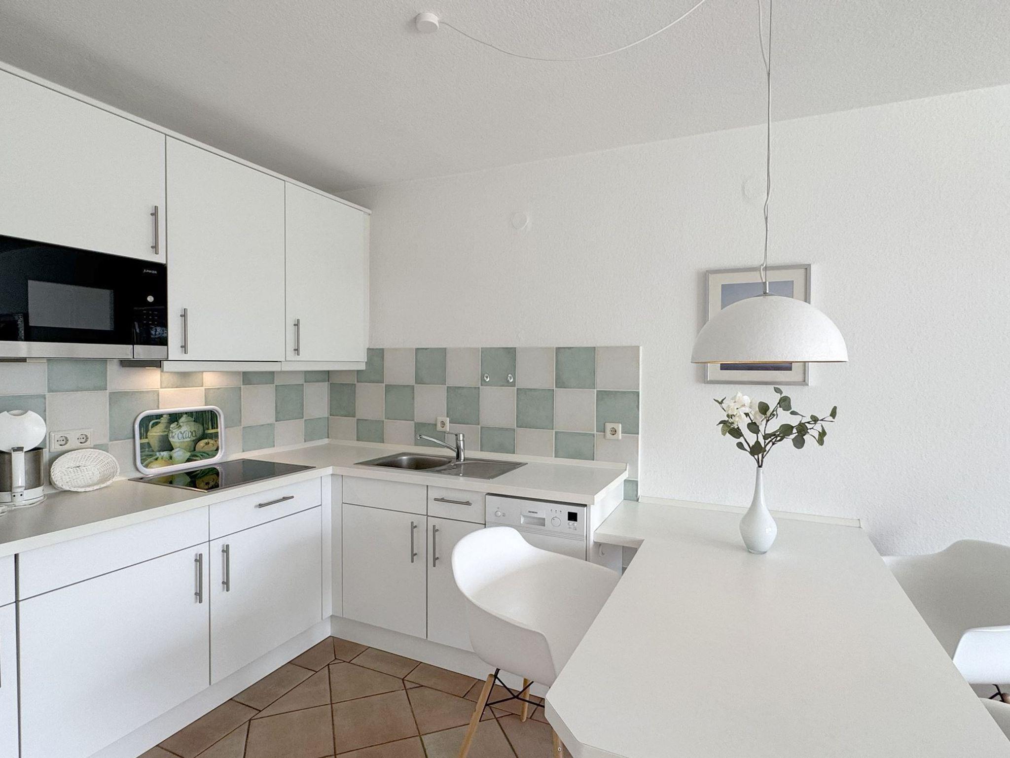 Die ca. 55 qm teilen sich folgendermaßen auf:Eingangsbereich mit Garderobe, offener Wohnraum mit Essbereich und integrierter Einbauküche,Einzelschrankbett (90x200cm,Matratze ), direkter Zugang zur Loggia und Garten, Schlafzimmer mit Doppelbett (180x200cm,getrennte Matratzen), 1 Duschbad mit WC und Waschbecken.