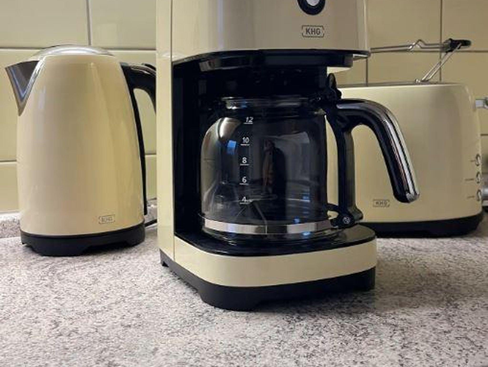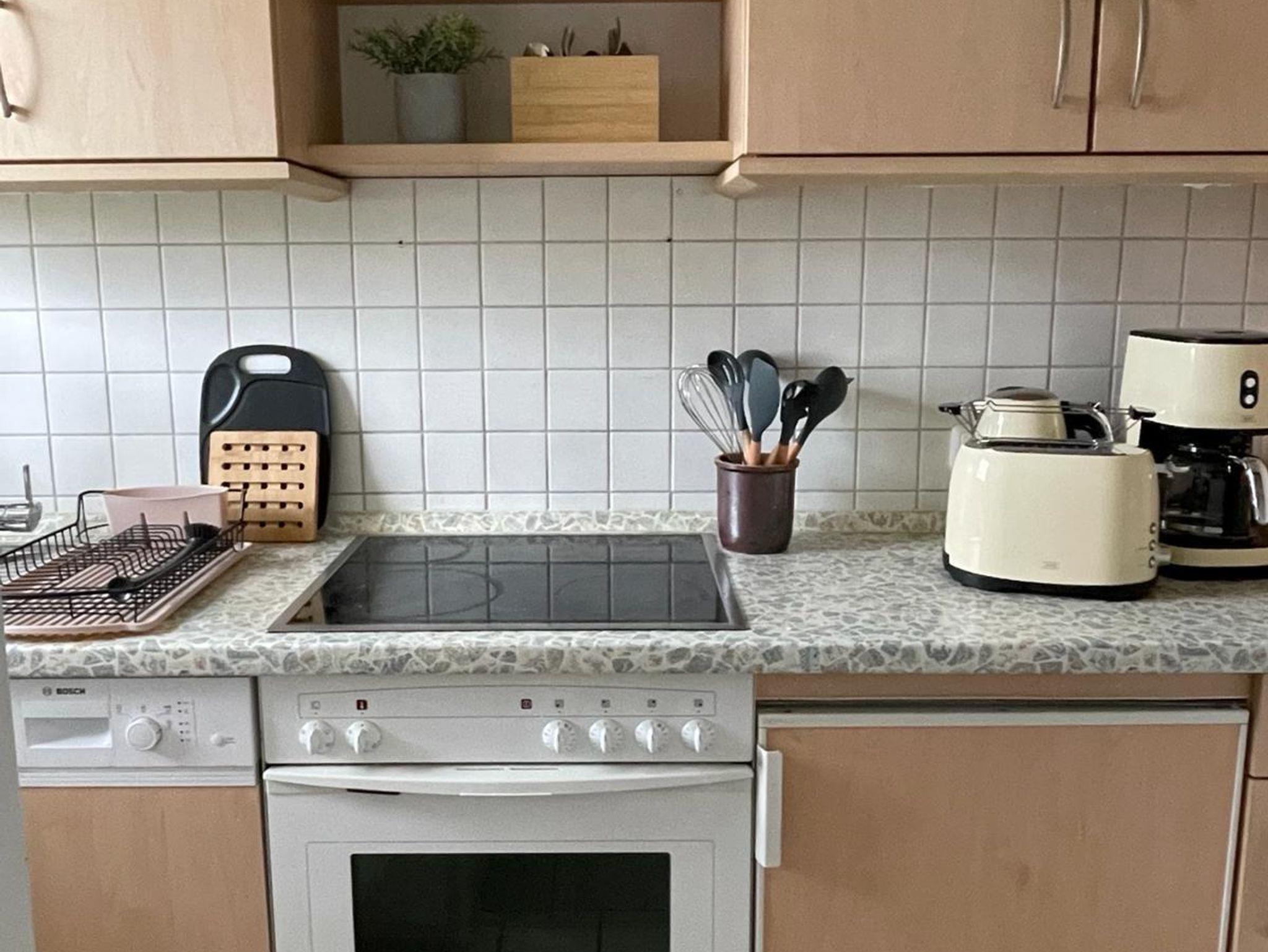 Küche mit Ceran-Kochfeld, Backofen, Kühlschrank.