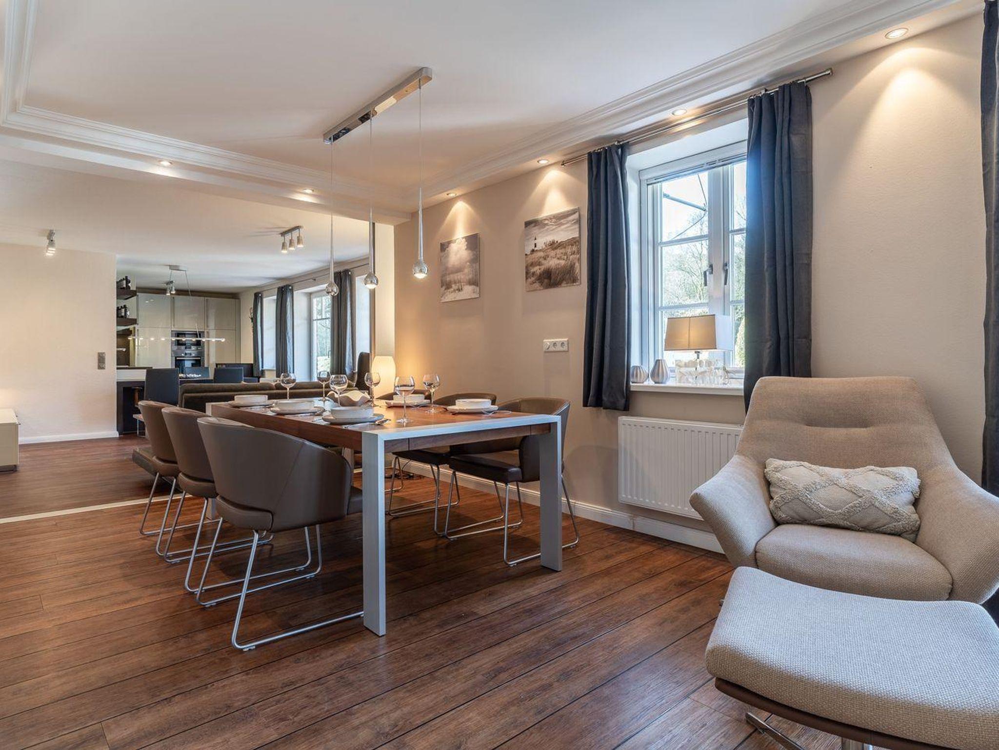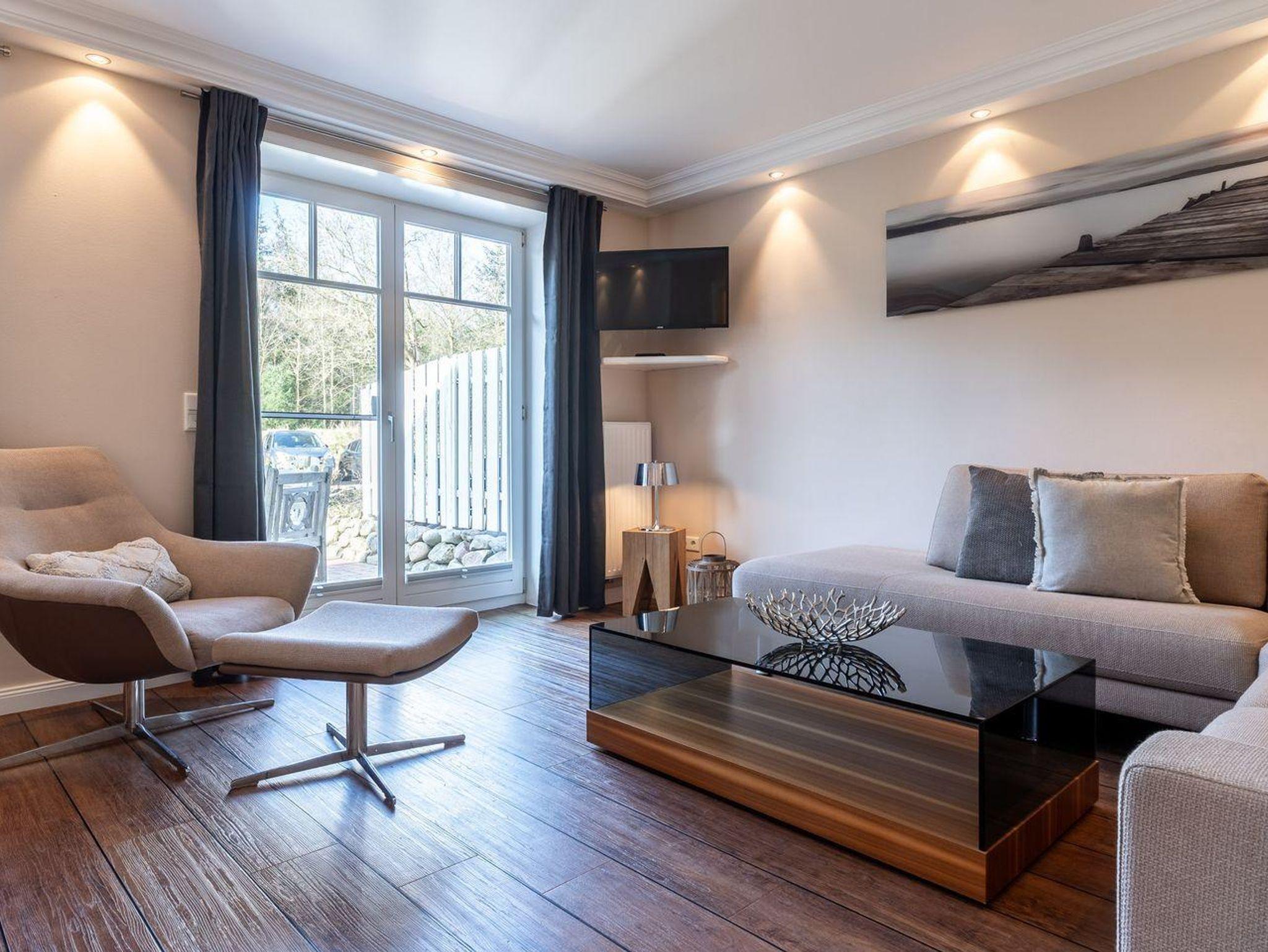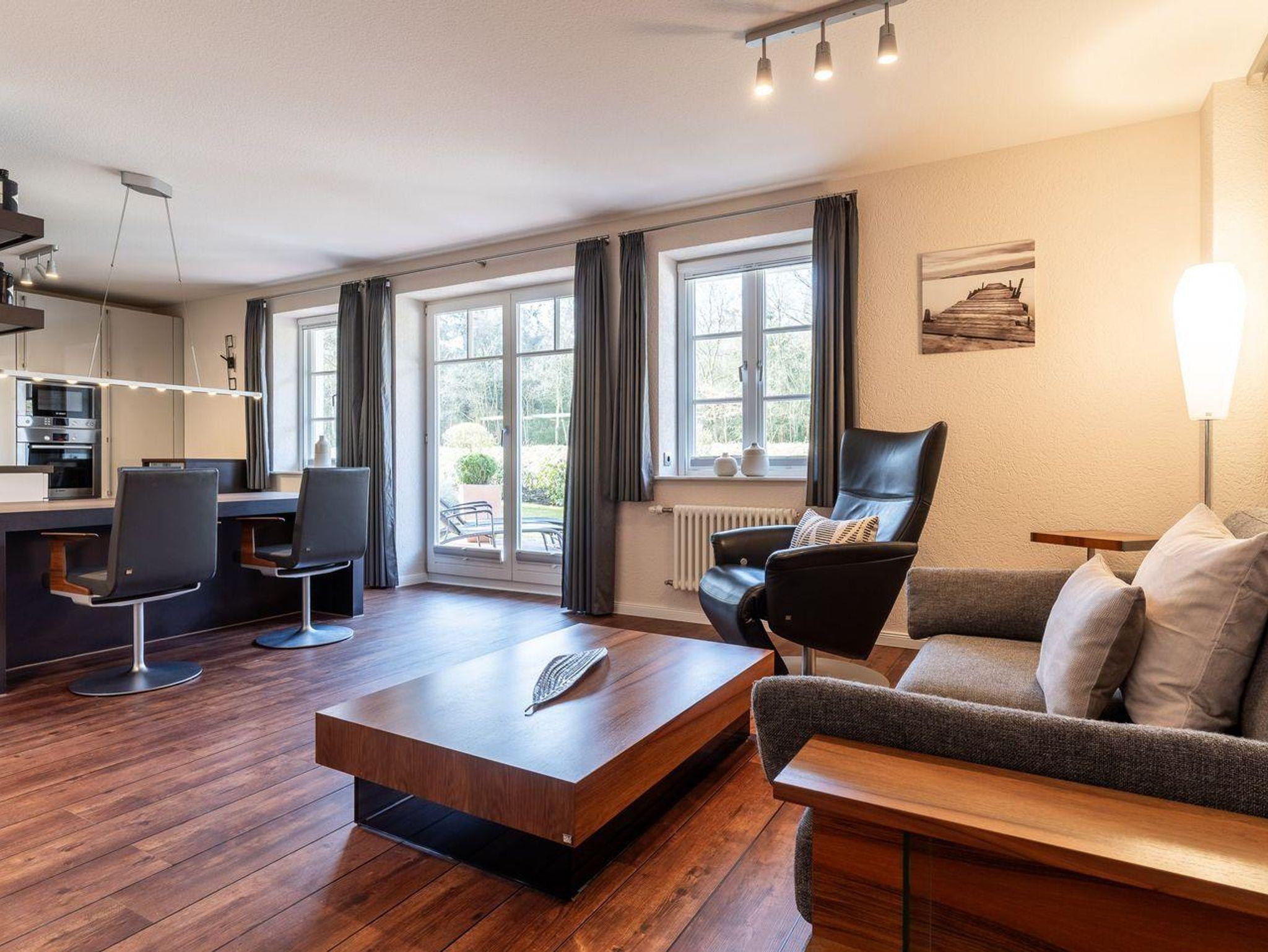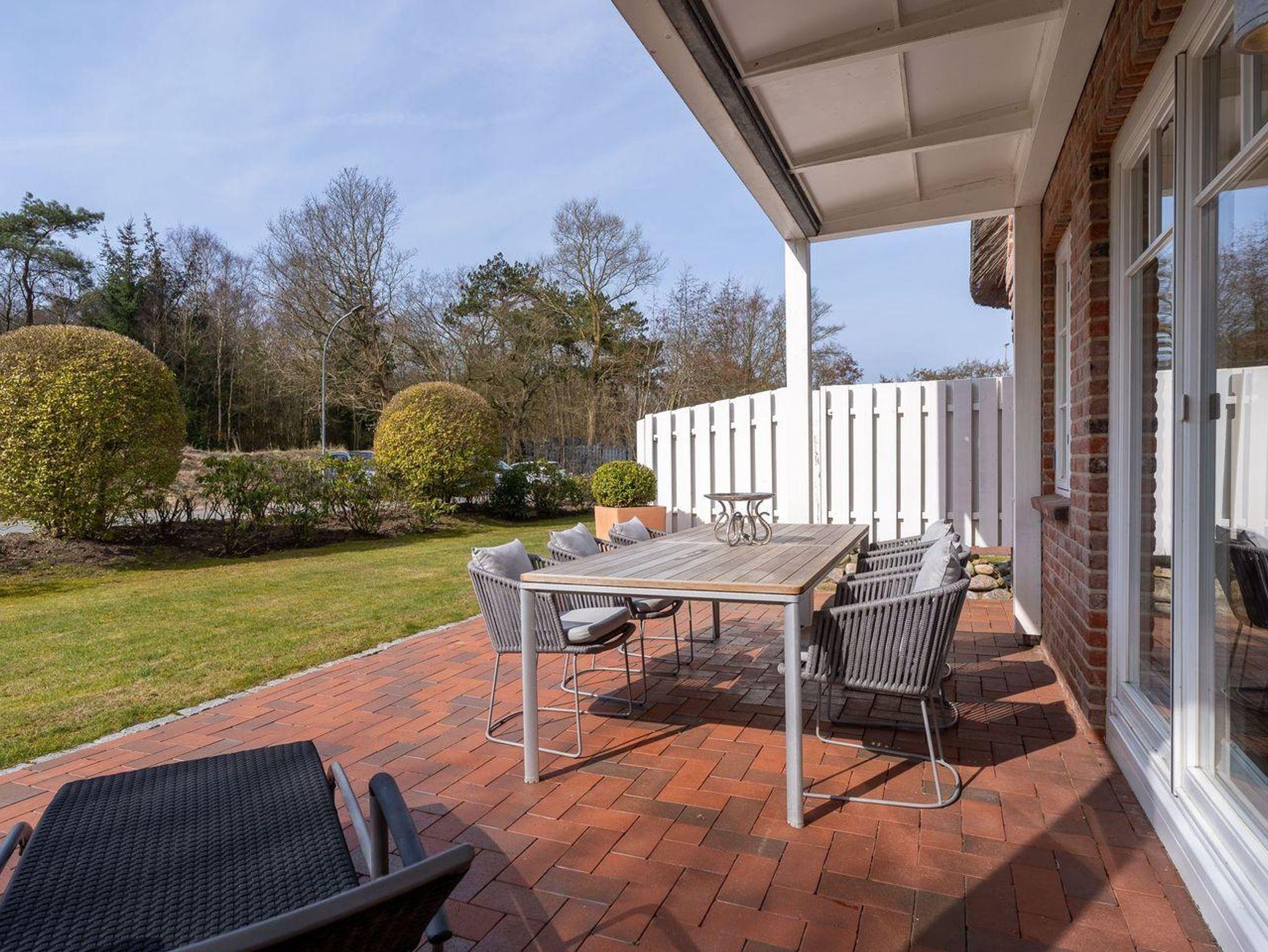Von hier aus gelangen Sie auch auf die privaten Terrassen, wo wunderschöne Gartenmöbel und ein Strandkorb bereitstehen. Genießen Sie die frische Luft und die entspannende Atmosphäre – perfekt, um mit einem guten Buch zu entspannen und wertvolle Erinnerungen zu schaffen.