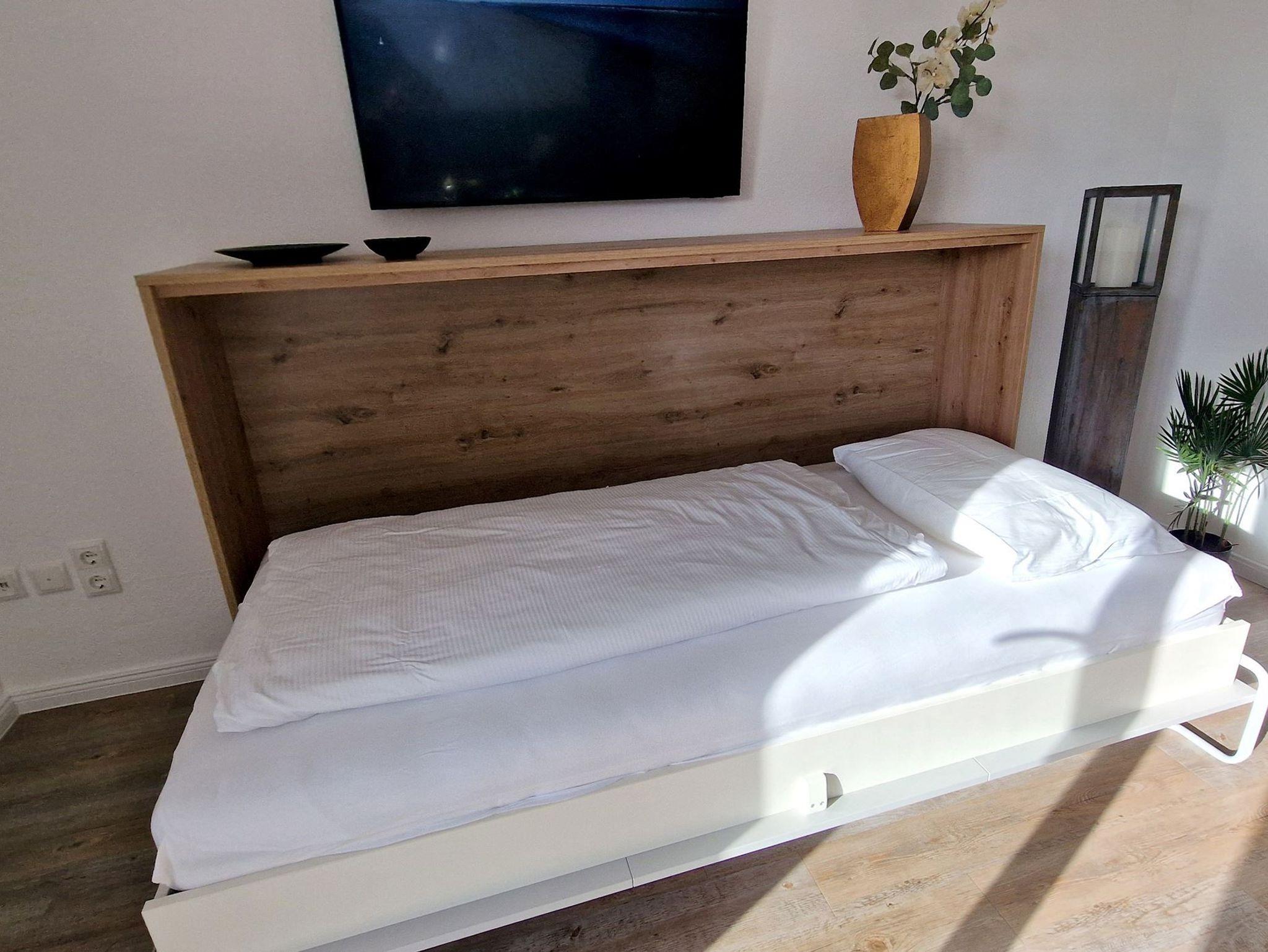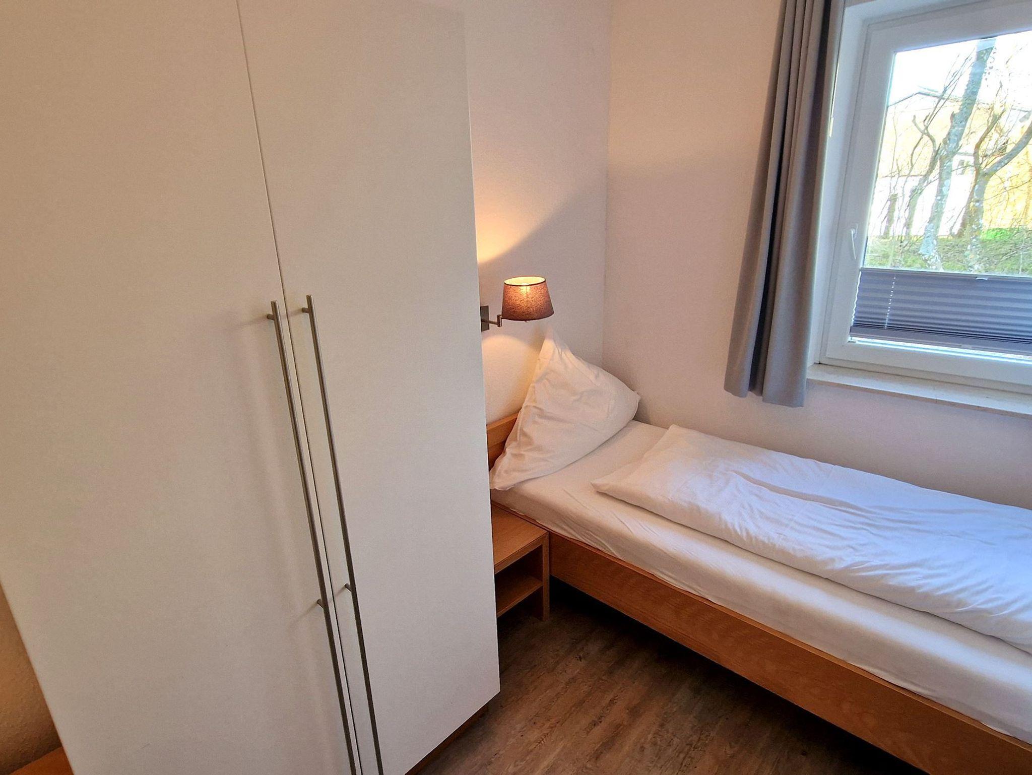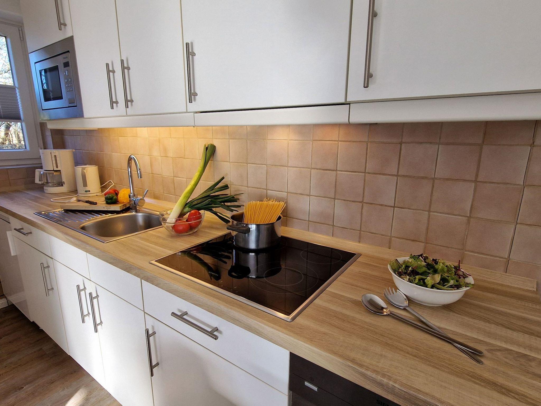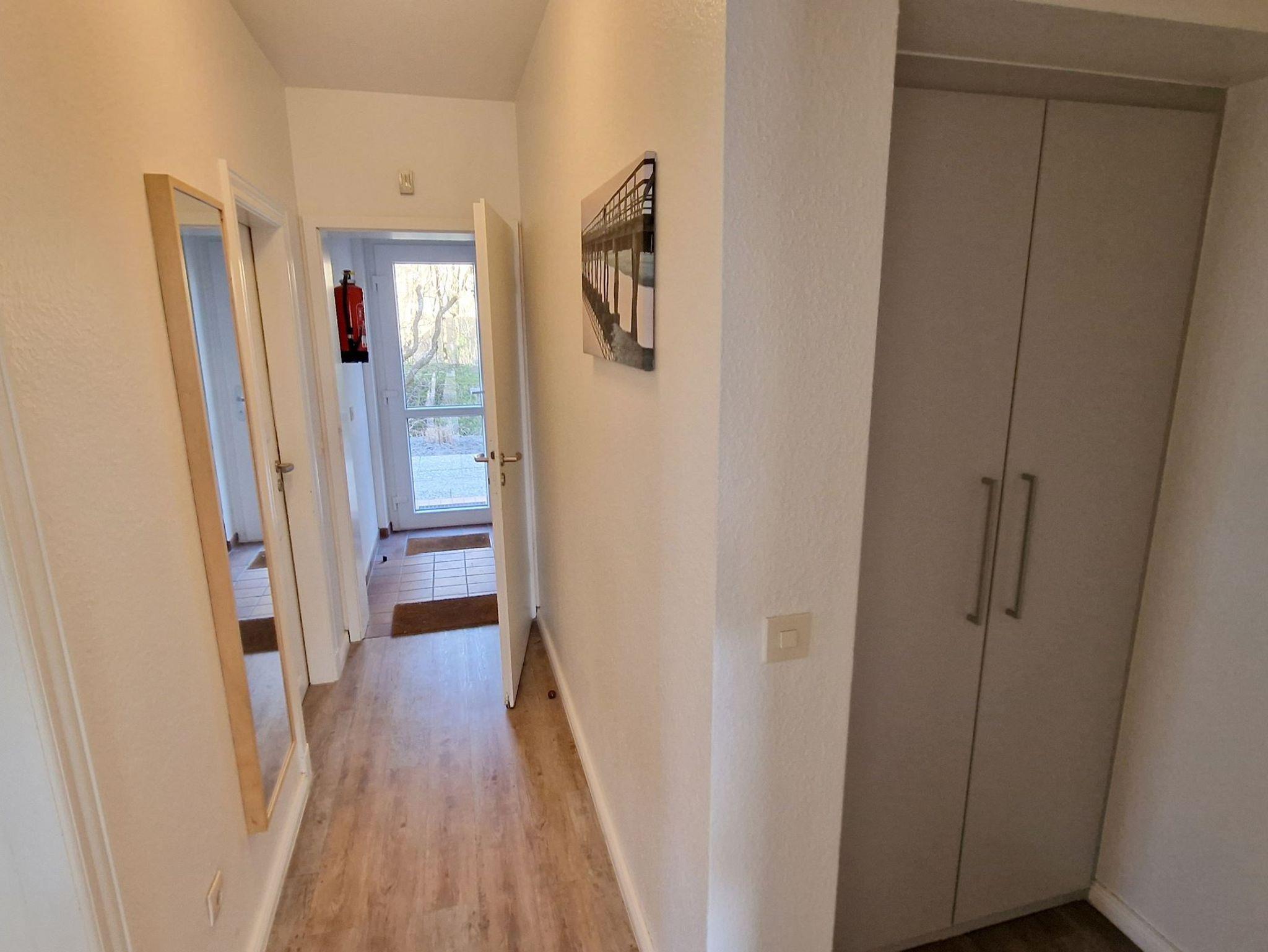 Sie teilt sich wie folgt auf: Eingangsdiele mit Garderobe, Schlafzimmer mit 2 Einzelbetten, Duschbad mit WC.Der großzügige Wohnraum mit direktem Zugang zur Terrasse und Garten überzeugt mit seiner gemütlichen Sitzecke mit direktem Blick nach draußen, moderne, weiße Küche, Essecke und als weitere Schlafmöglichkeit 1 Doppelschrankbett. Die Fußböden der Ferienwohnung sind aus Designerparkett oder Fliesen, Allergikergeeignet.