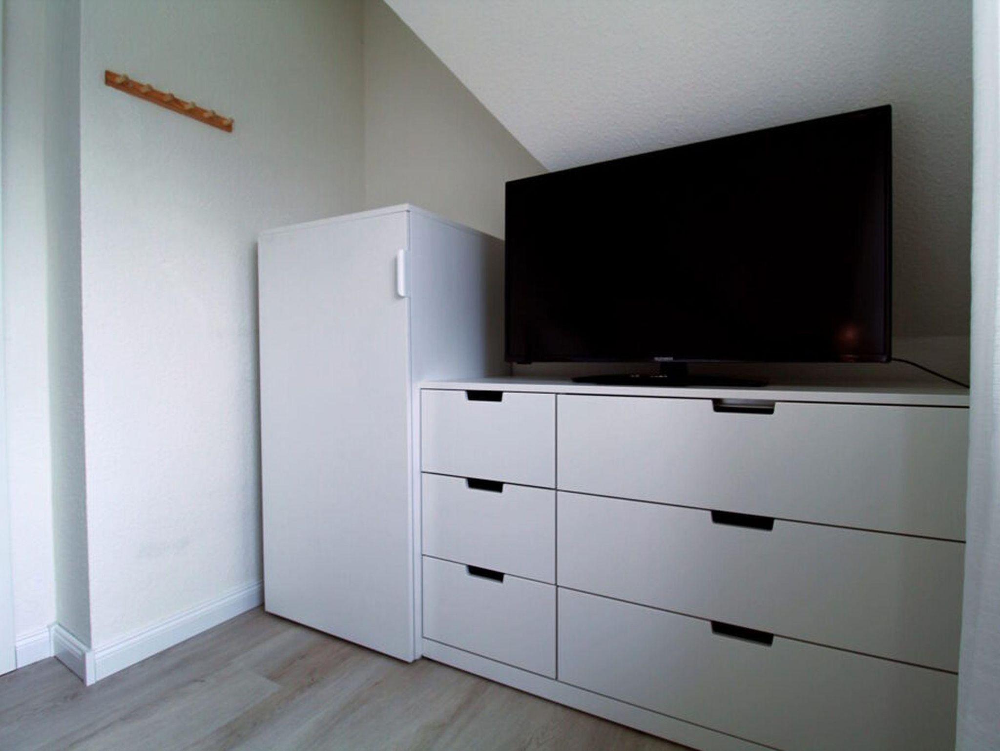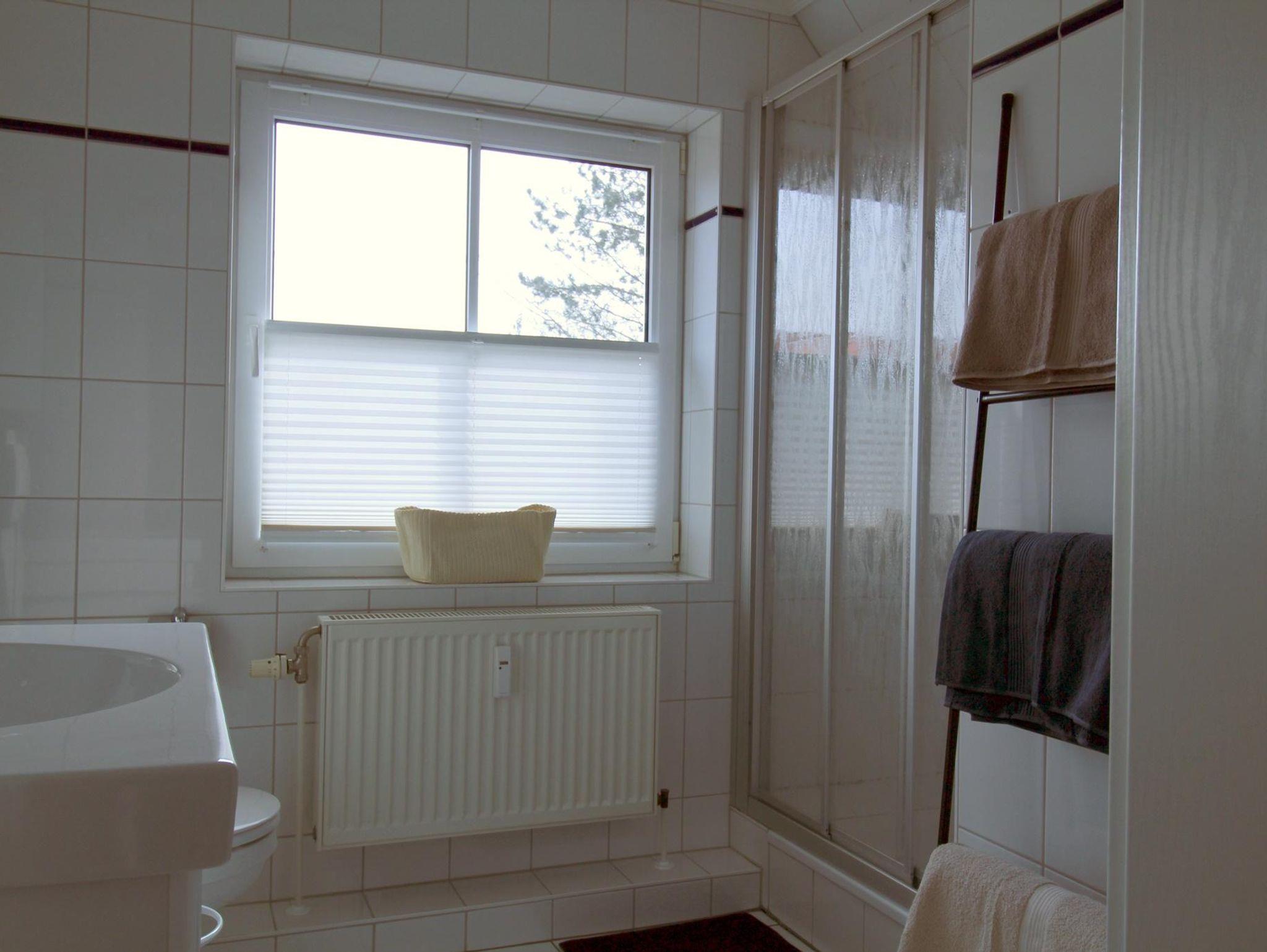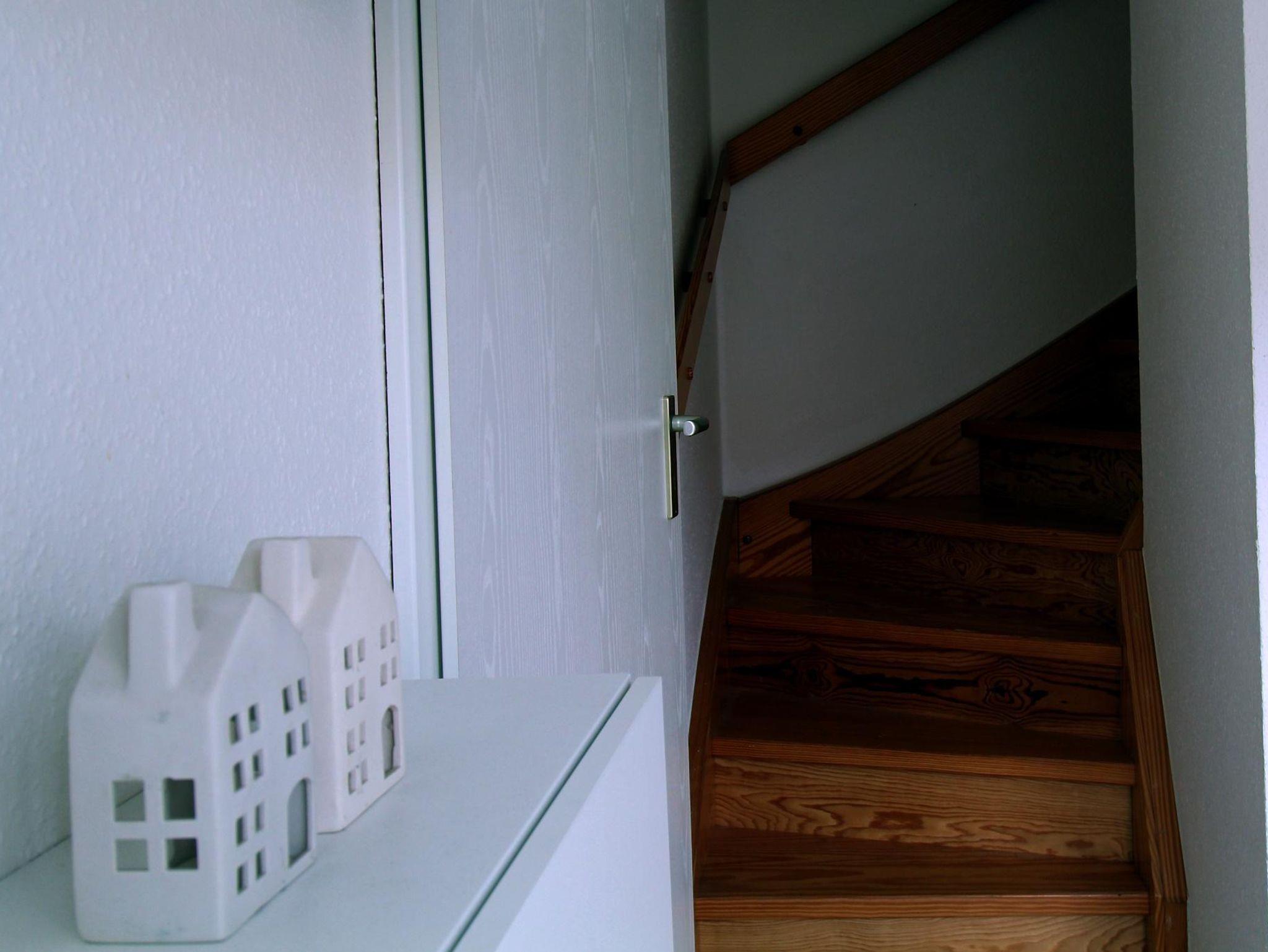 Die Wohnung verfügt über zwei Schlafzimmer in der oberen Etage. Das größere Zimmer hat ein Boxspringbett (160 x 200), das kleinere ein Einzelbett (90 x 200). Dazwischen finden Sie das Bad mit Dusche und Waschmaschine.