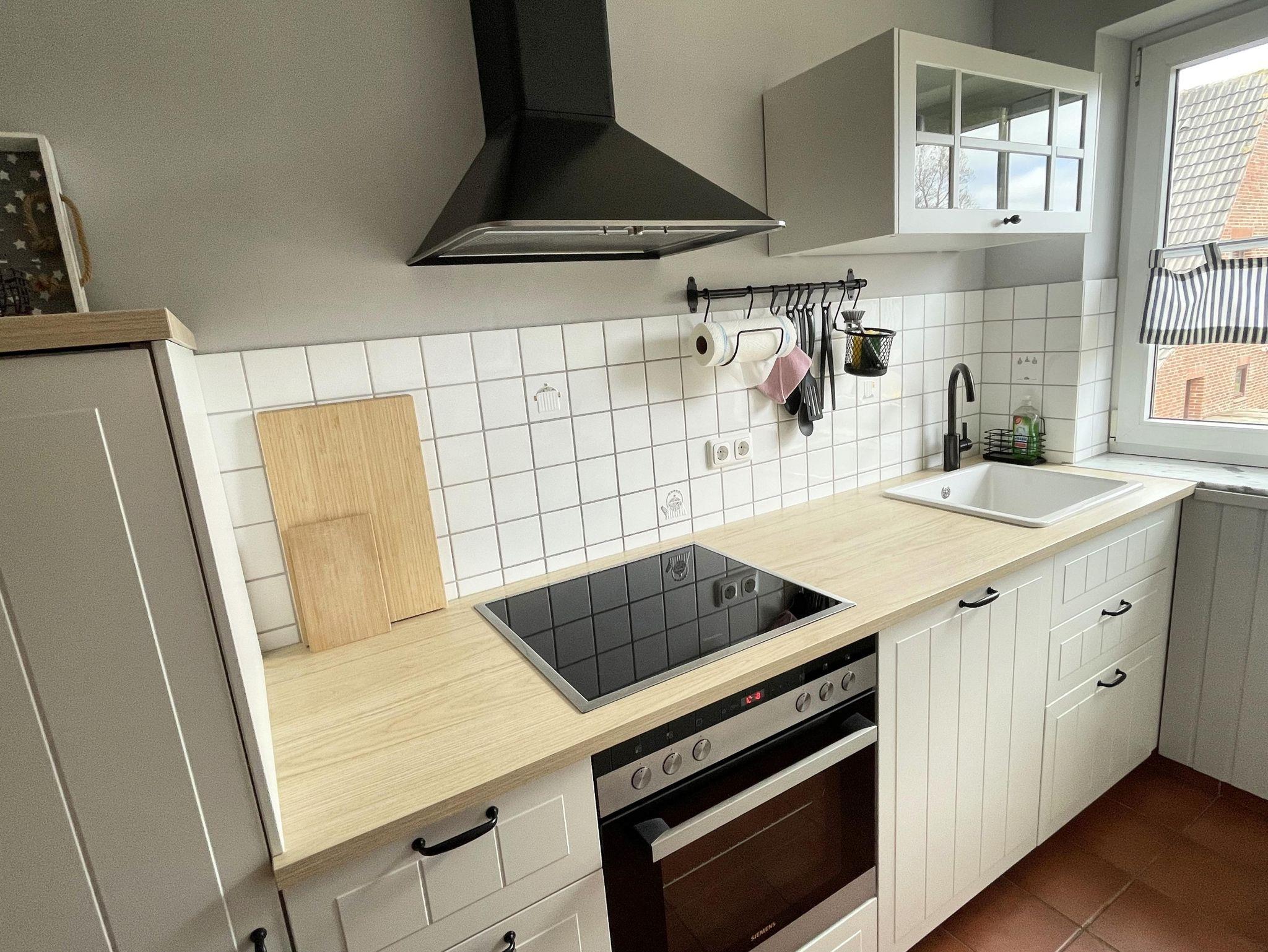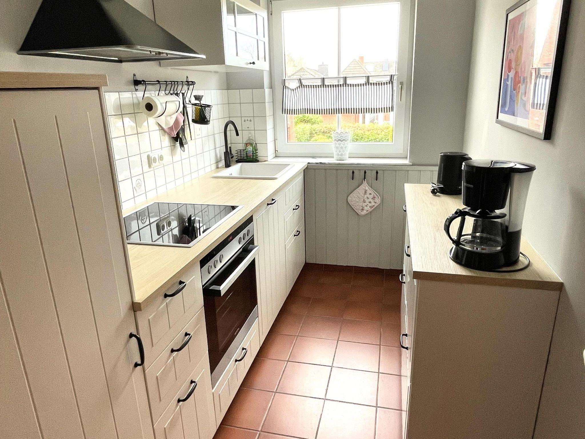 Eine vollständig ausgestattete Küche mit 4er-Kochfeld, Backofen, Kühl-Gefrierkombination, Kaffeemaschine, Spülmaschine, Dunstabzugshaube, etc.