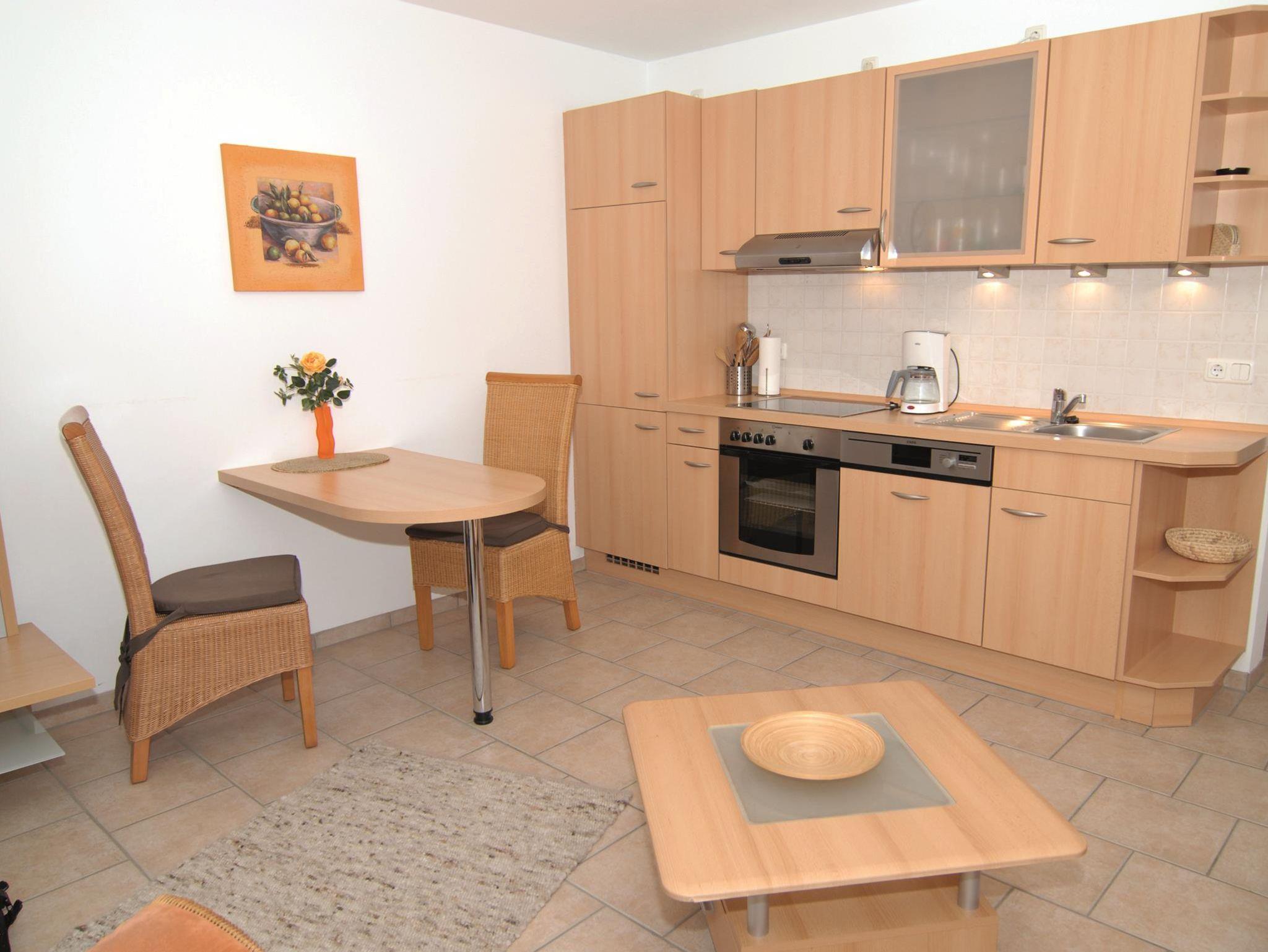 Wohnzimmer Couch, Couchtisch, Sessel, Stehlampe, TV-Regal, Sat-TV, Kofferradio mit CD-Player, Esstisch, 2 Stühle, Küchenzeile, 4 Plattenherd mit Ceranfeld und Backofen, Dunstabzugshaube, Kühlschrank, Spülmaschine, Kaffeemaschine, Wasserkocher, Toaster, Eierkocher, Geschirr, Kochtöpfe