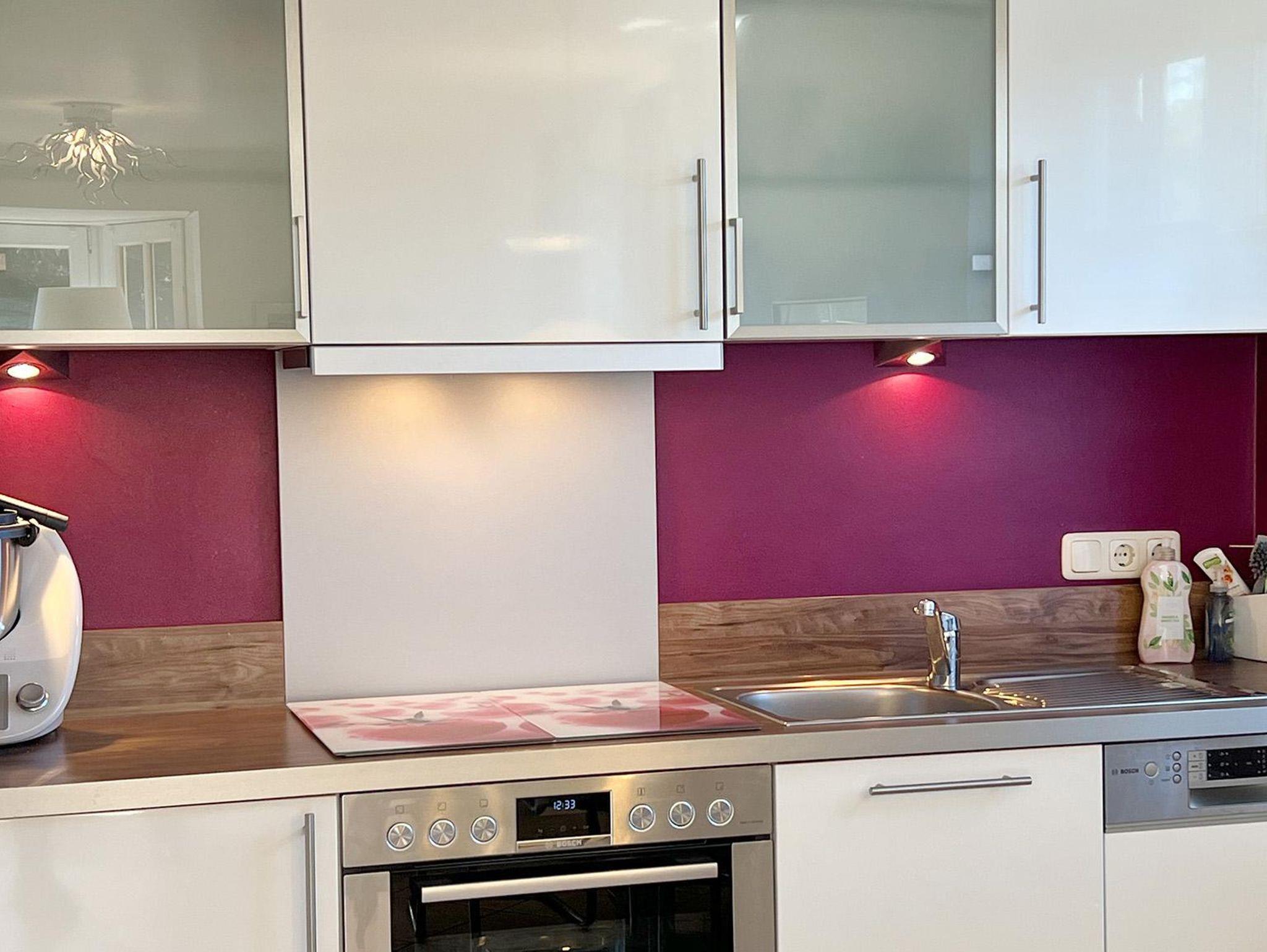 Kücheoffene Einbauküche, 4 Plattenherd mit Ceranfeld und Backofen, Dunstabzugshaube, Kühlschrank, Gefrierschrank, Spülmaschine, Mikrowelle, Kaffeemaschine, Wasserkocher, Toaster, Handmixer, Geschirr, Kochtöpfe, Esstisch mit 4 Stühlen