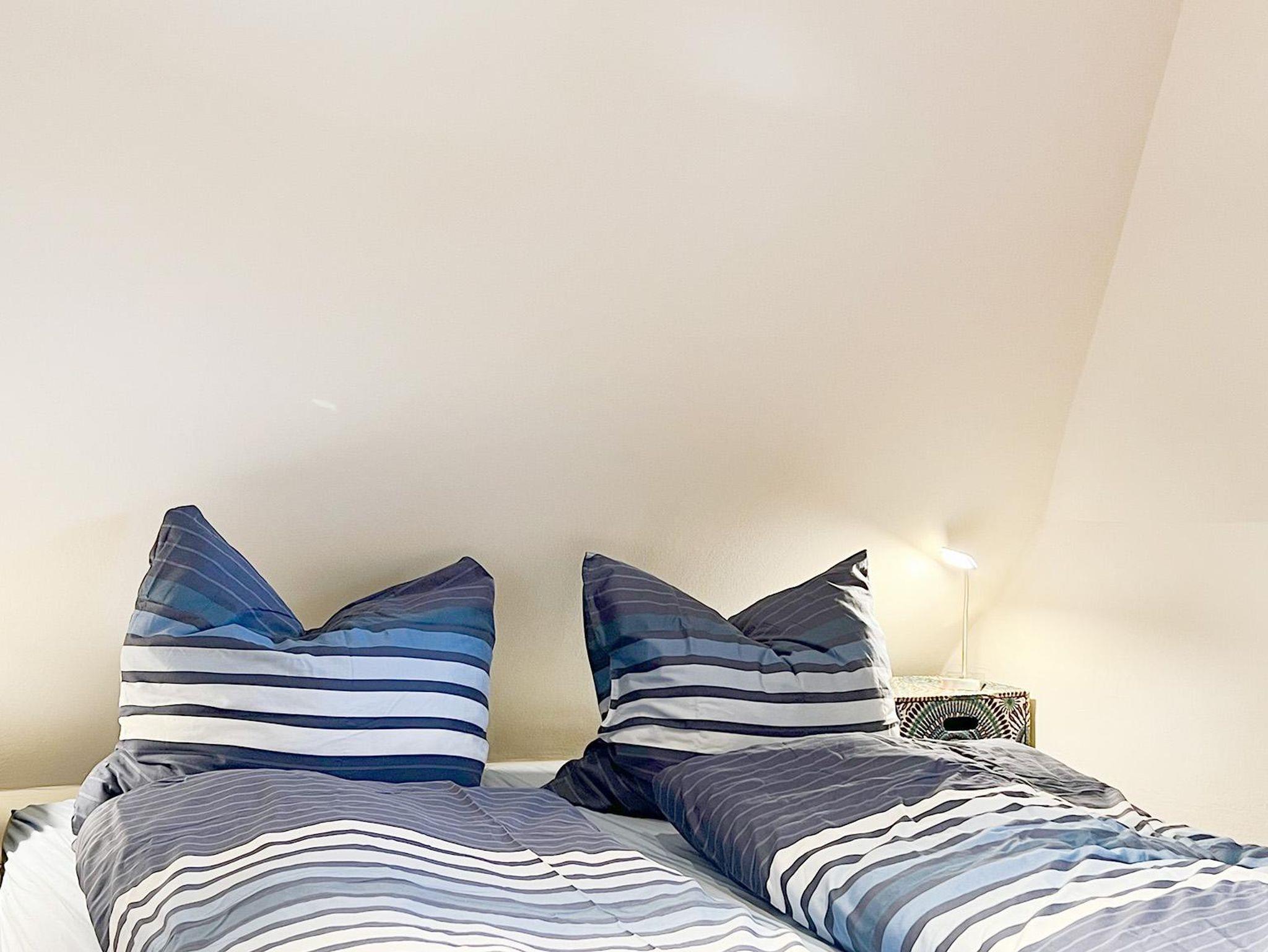 Schlafzimmer1. OG: Doppelbett 2,00 x 1,80 m, Lattenrost Kopf- und Fussteil verstellbar, 2 Nachttische, Kleiderschrank, Spiegel, mit kleiner Nische für Kosmetik oder als Arbeitsplatz nutzbar