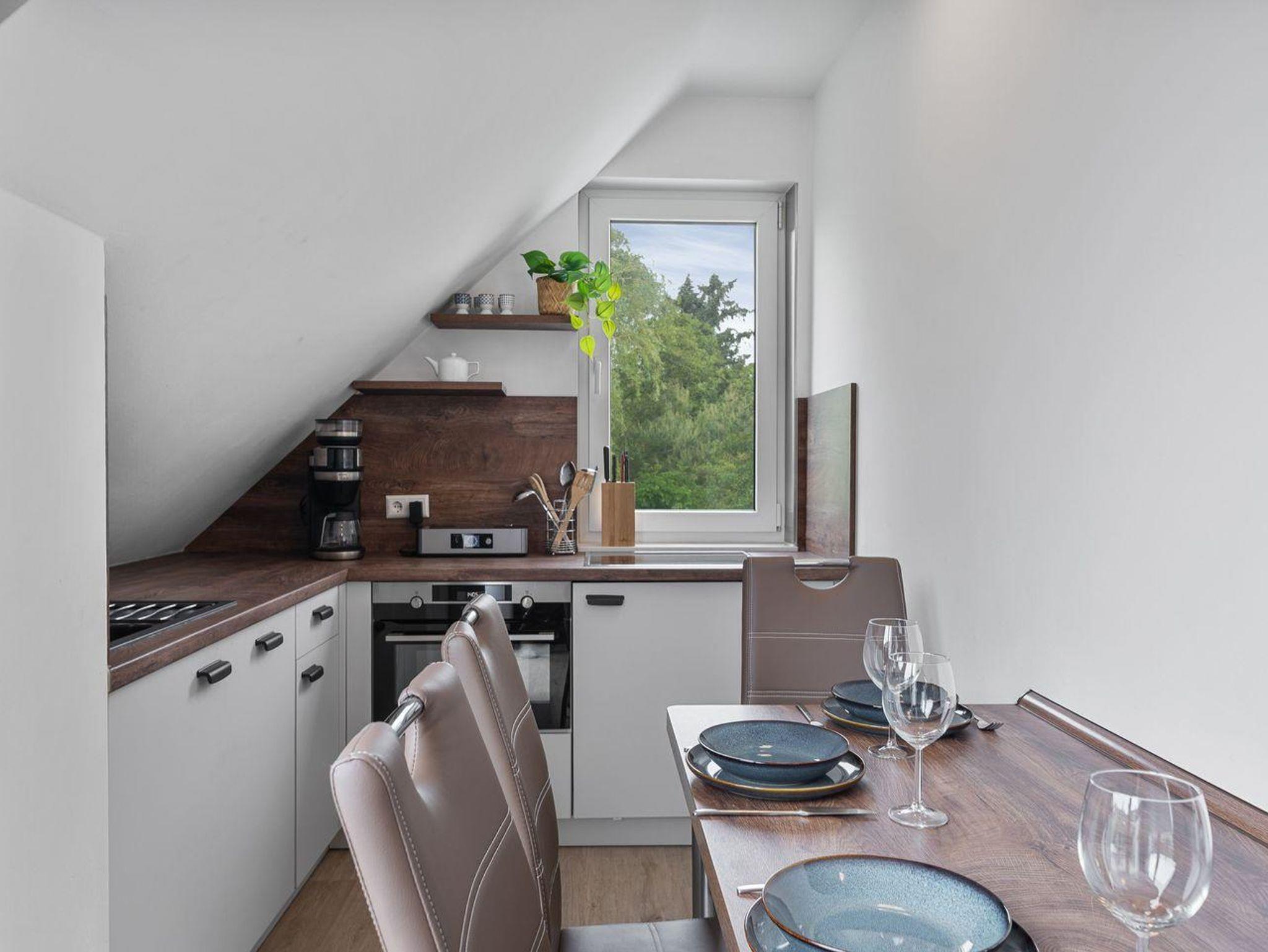 Im Hauptgeschoss erwarten Sie ein gemütlicher Wohnbereich mit Sofa, ein Elternschlafzimmer mit komfortablem Boxspringbett, die voll ausgestattete Küche mit Esstisch für vier Personen, Spülmaschine, Kaffeemaschine und Backofen sowie das moderne Bad mit Dusche und WC. Der Balkon lädt zum Entspannen ein.