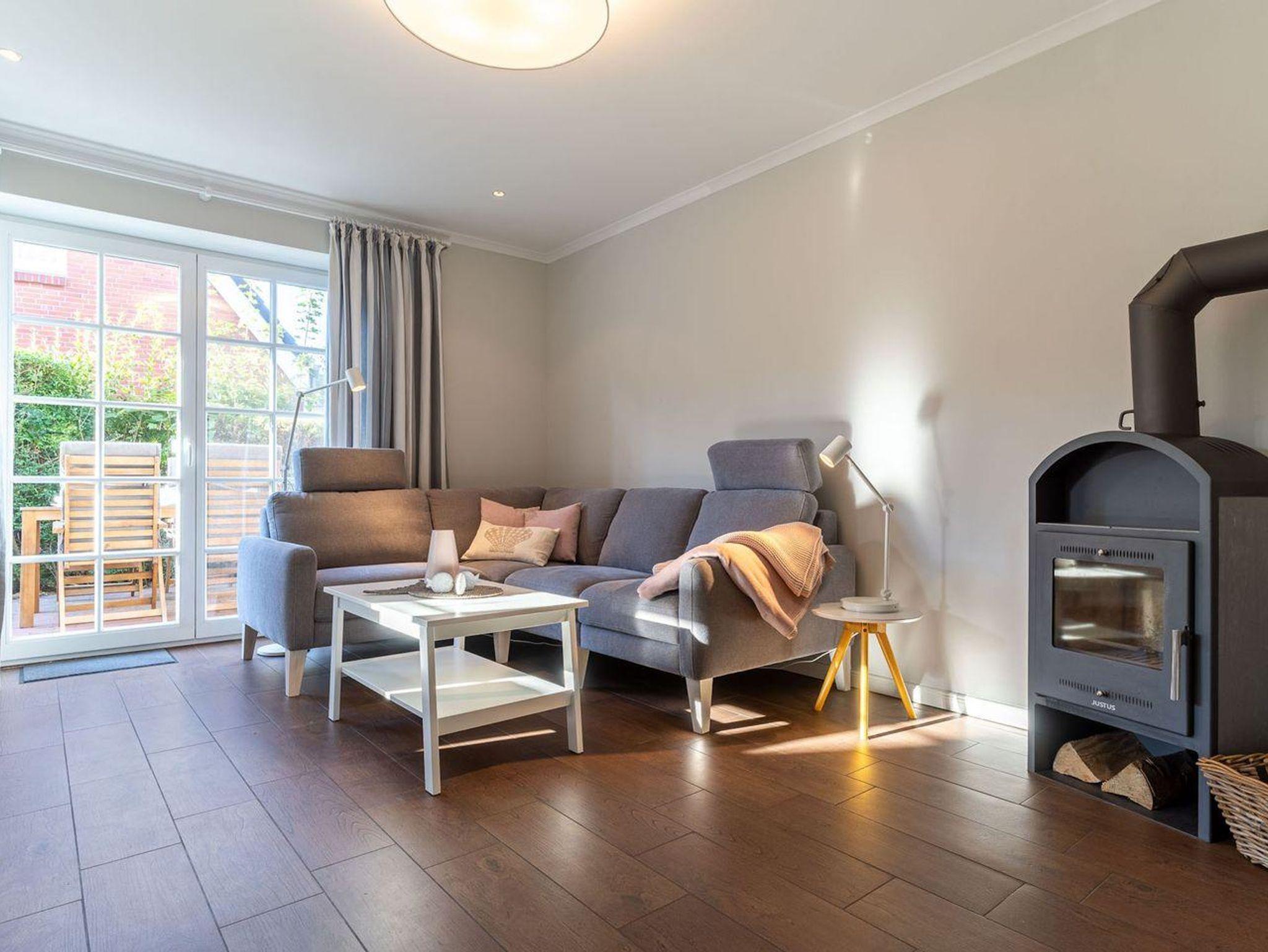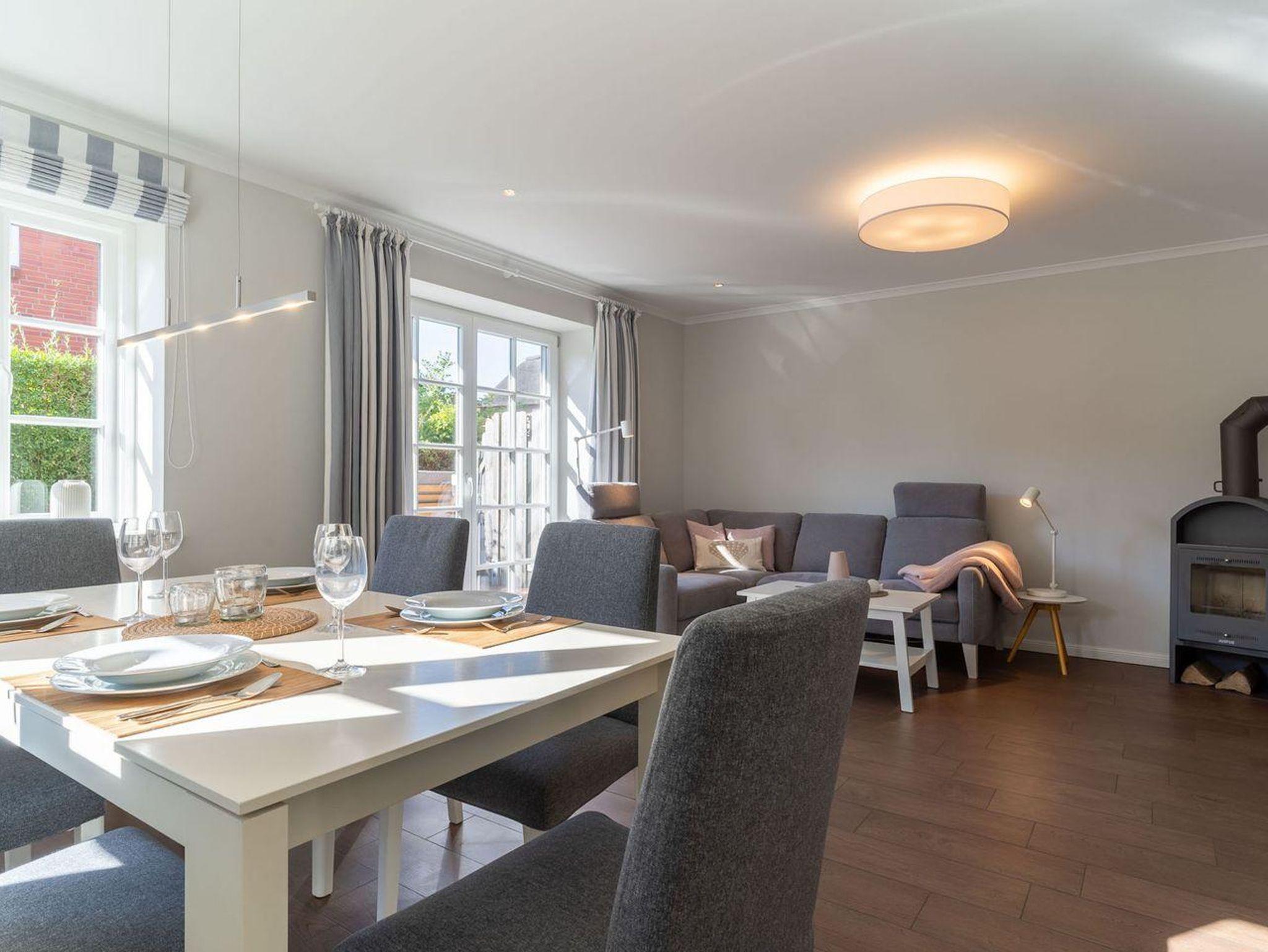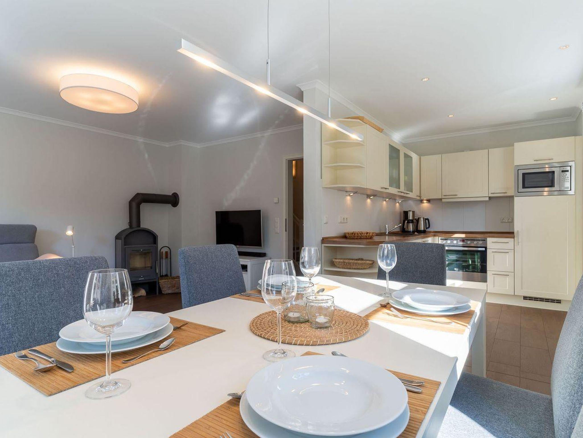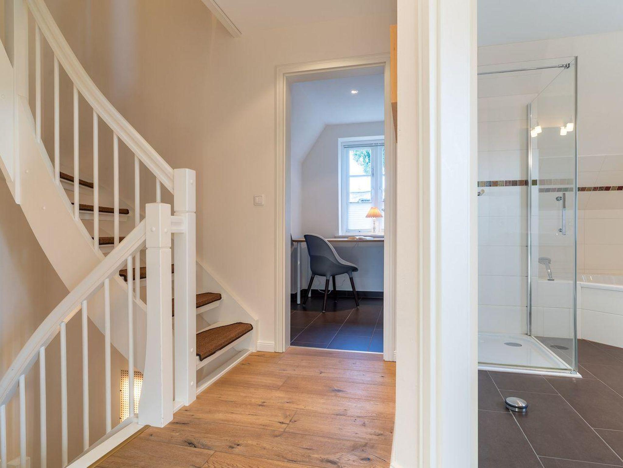 Im Erdgeschoss befindet sich der lichtdurchflutete Wohnraum mit TV, Kamin, einer offenen Küche sowie einem stilvollen Essbereich. Die Küche verfügt über hochwertige Elektrogeräte. An den Wohnbereich schließen sich ein Flur, ein Duschbad und ein Abstellraum. Über eine Holztreppe gelangen Sie in das Obergeschoss mit zwei großzügigen Schlafzimmern, ein Doppelschlafzimmer und ein Schlafzimmer mit zwei Einzelbetten. Die Schlafzimmer sind mit geräumigen Schränken ausgestattet, in einem finden Sie zudem einen Schreibtisch an dem es sich prima von Zuhause aus arbeiten lässt. Darüber hinaus befindet sich im Obergeschoss ein weiteres, geräumiges Bad mit Dusche und einer Eckbadewanne. Über eine weitere Holztreppe geht es vom Flur ins Dachgeschoss mit einem gemütlichem Doppelbett. Im Erd- und Obergeschoss sorgt eine Fußbodenheizung für ein angenehmes Raumklima.