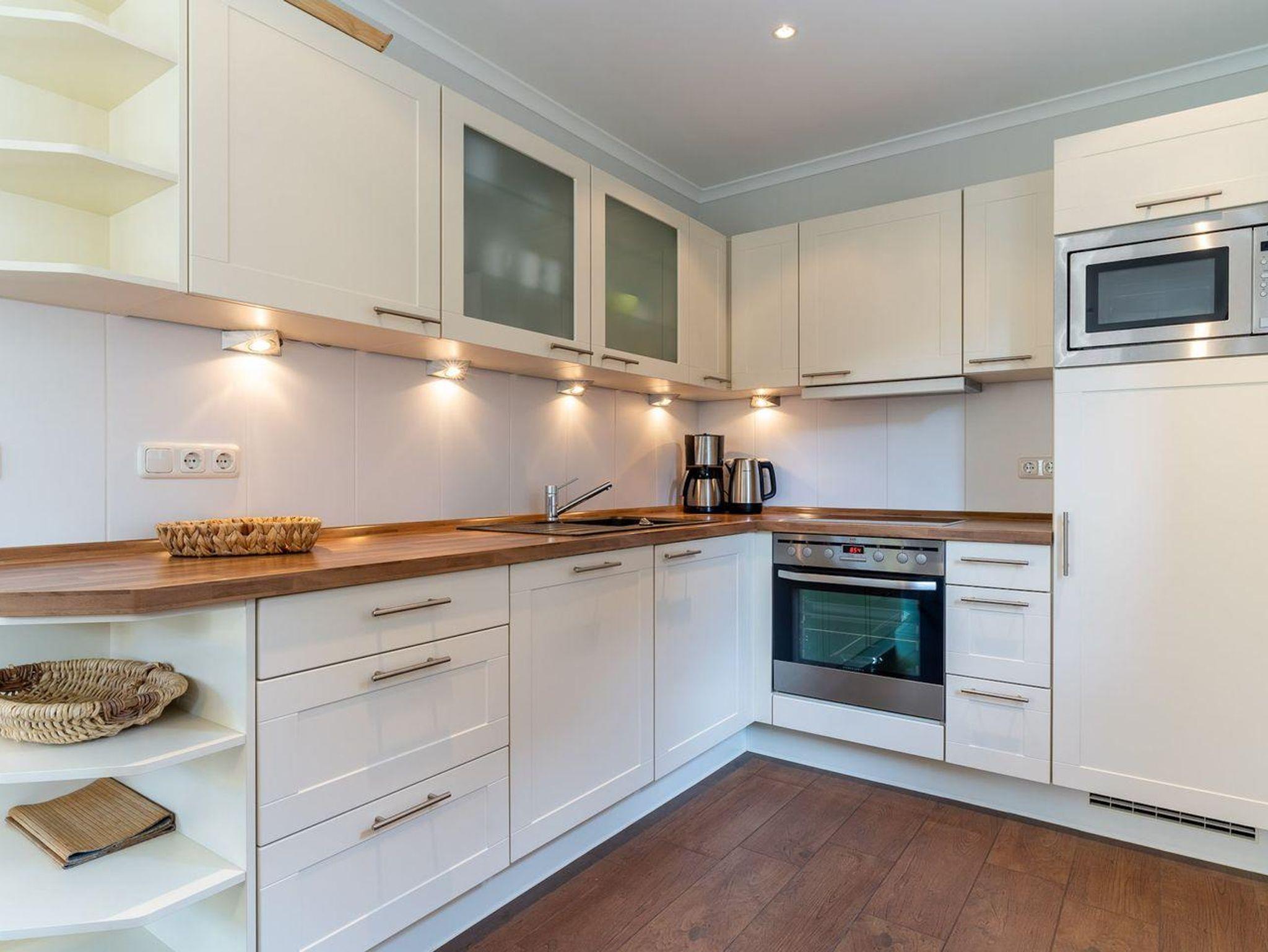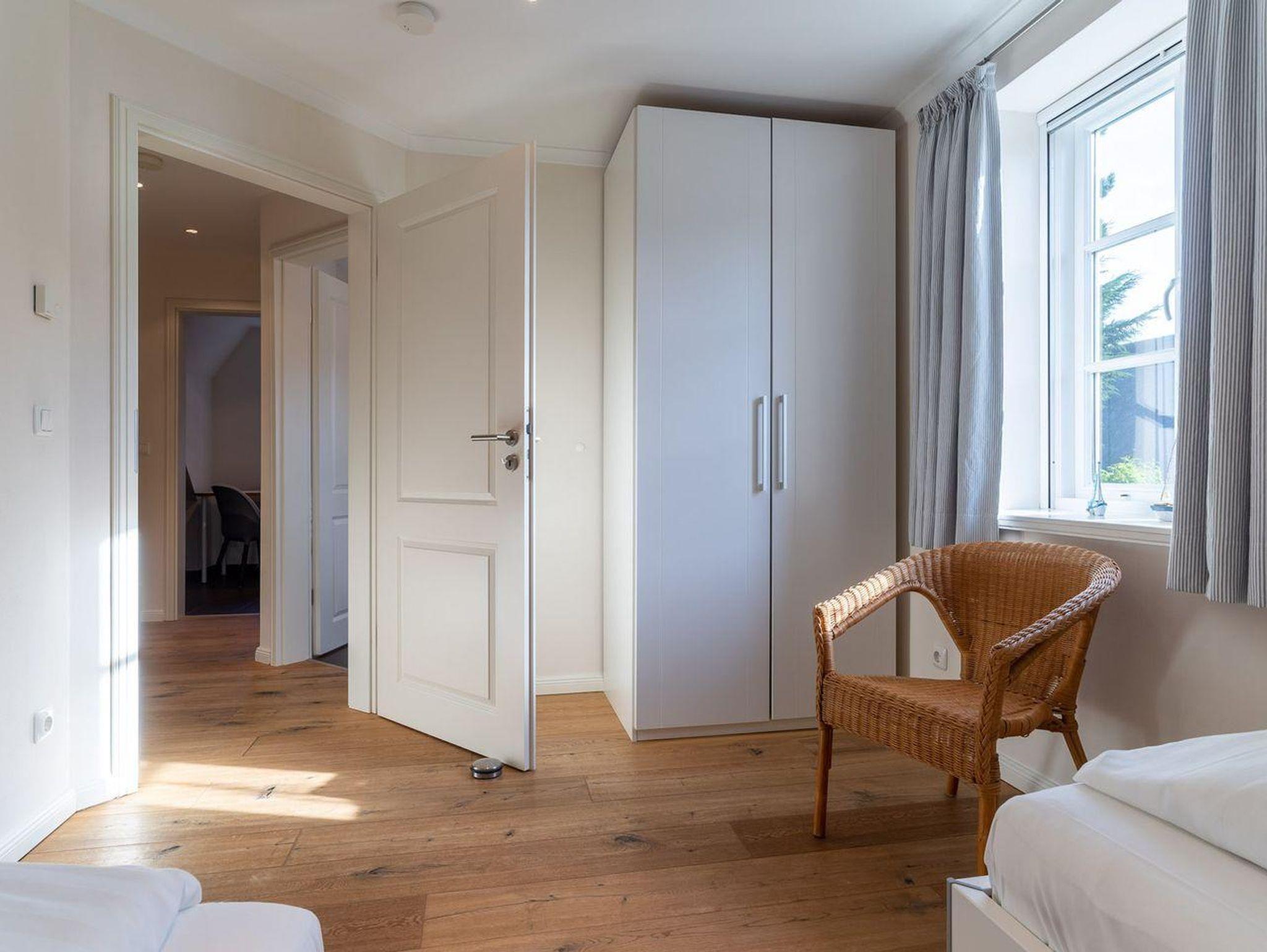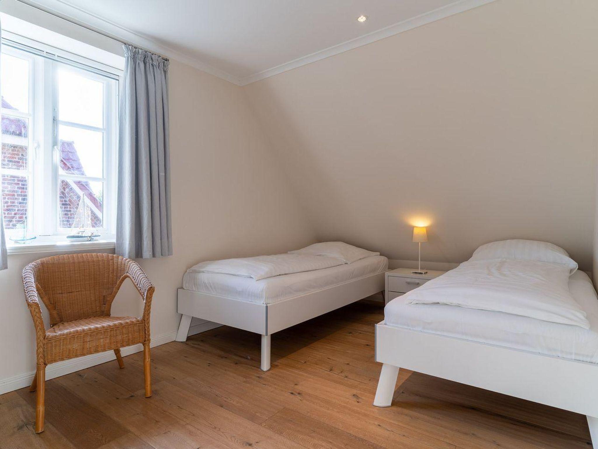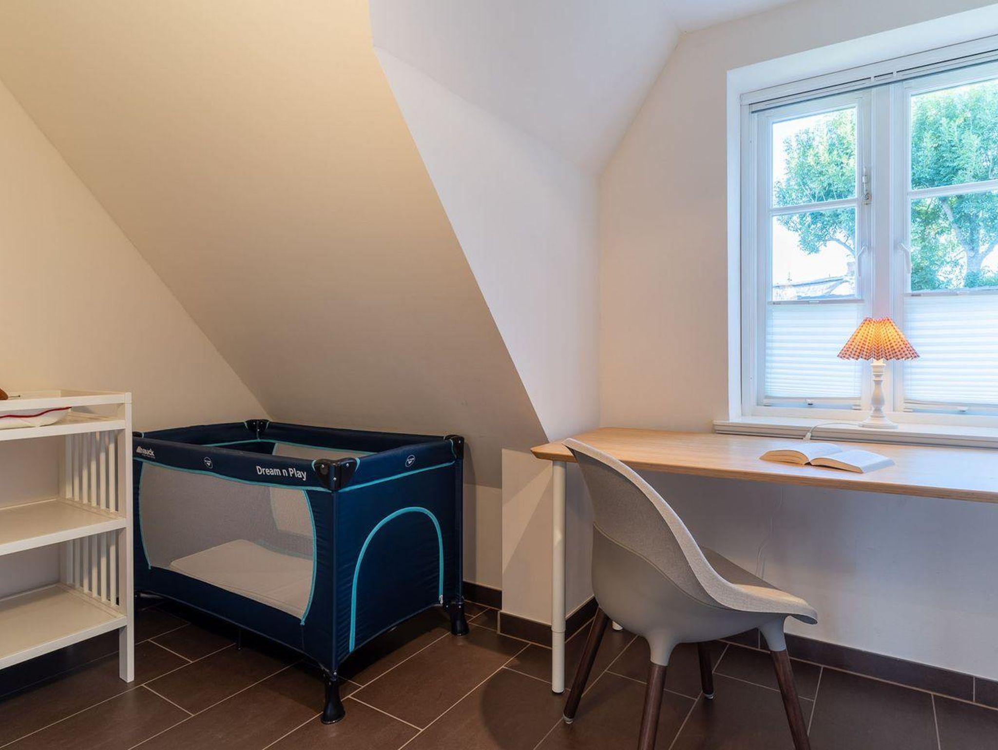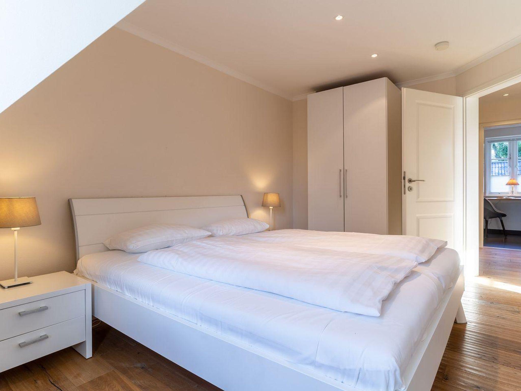 Im Erdgeschoss befindet sich der lichtdurchflutete Wohnraum mit TV, Kamin, einer offenen Küche sowie einem stilvollen Essbereich. Die Küche verfügt über hochwertige Elektrogeräte. An den Wohnbereich schließen sich ein Flur, ein Duschbad und ein Abstellraum. Über eine Holztreppe gelangen Sie in das Obergeschoss mit zwei großzügigen Schlafzimmern, ein Doppelschlafzimmer und ein Schlafzimmer mit zwei Einzelbetten. Die Schlafzimmer sind mit geräumigen Schränken ausgestattet, in einem finden Sie zudem einen Schreibtisch an dem es sich prima von Zuhause aus arbeiten lässt. Darüber hinaus befindet sich im Obergeschoss ein weiteres, geräumiges Bad mit Dusche und einer Eckbadewanne. Über eine weitere Holztreppe geht es vom Flur ins Dachgeschoss mit einem gemütlichem Doppelbett. Im Erd- und Obergeschoss sorgt eine Fußbodenheizung für ein angenehmes Raumklima.