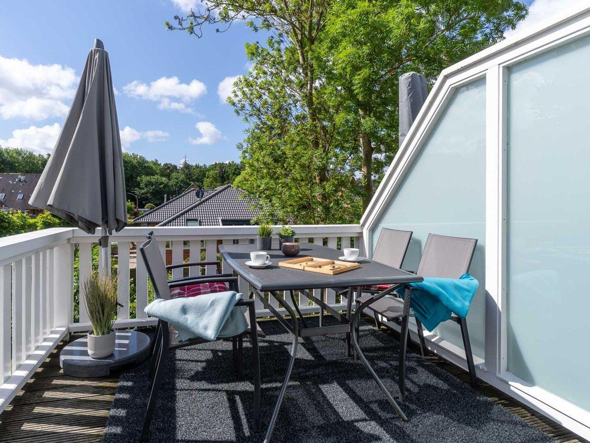 Ein Highlight der Feinen Butze ist der Balkon, der Ihnen einen schönen Ausblick auf den Garten gewährt und ein Ort der Entspannung ist. Hier können Sie Ihre Morgencafé oder ein Abendessen unter freiem Himmel genießen. Die Gartenmöbel laden dazu ein, die frische Luft und die Ruhe der Umgebung zu genießen.