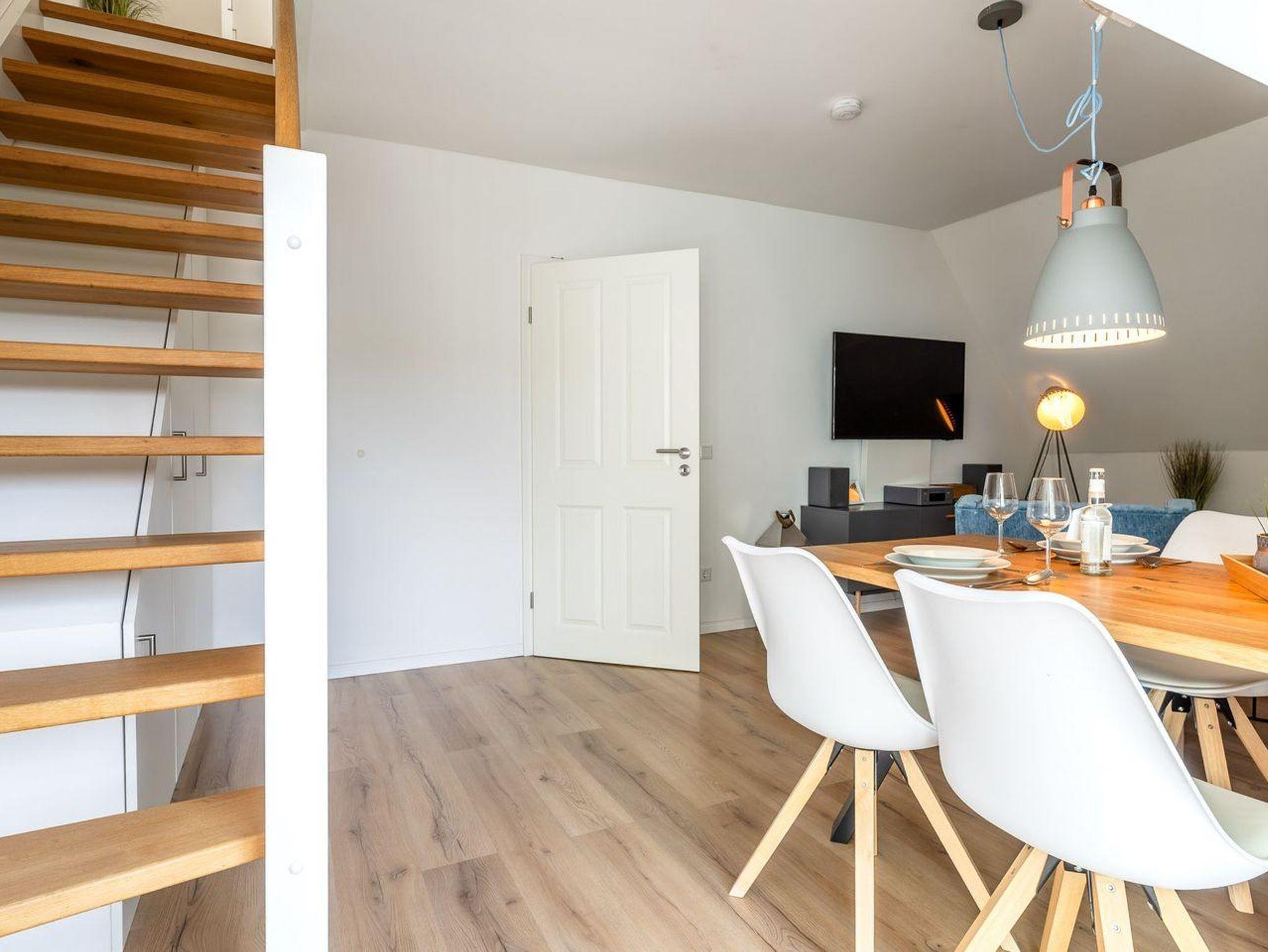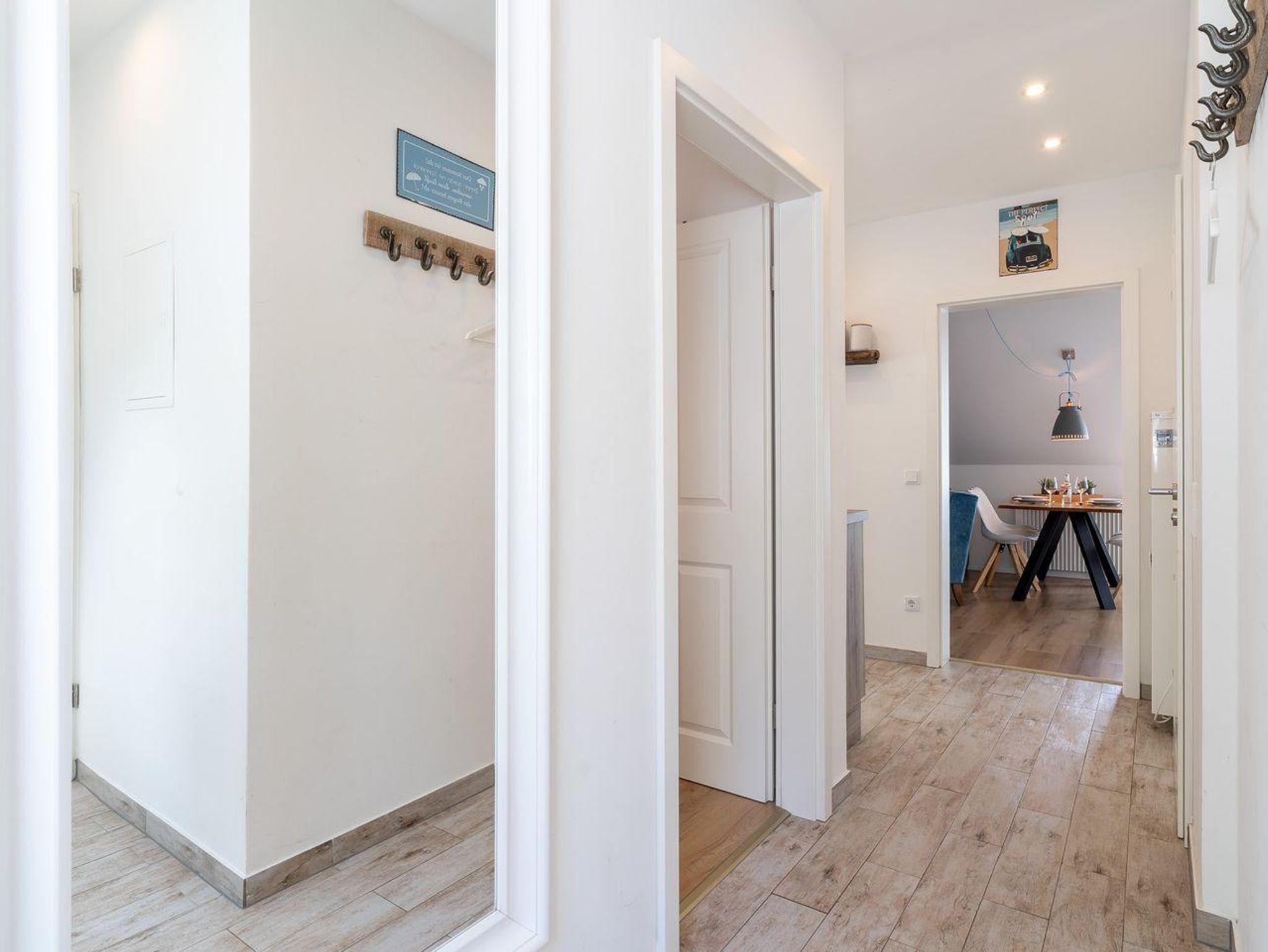 Die behagliche Ferienwohnung verfügt über zwei Schlafzimmer, in denen Sie nach einem erlebnisreichen Tag zur Ruhe kommen können. Beide Schlafzimmer sind im gleichen stilvollen Design gehalten, das durch einen hochwertigen Vinyl-Bodenbelag und eine angenehme Farbgebung besticht. Neben einem einladenden Wohnzimmer bietet die Unterkunft auch einen Essbereich, ideal für gesellige Abende mit Familie und Freunden.